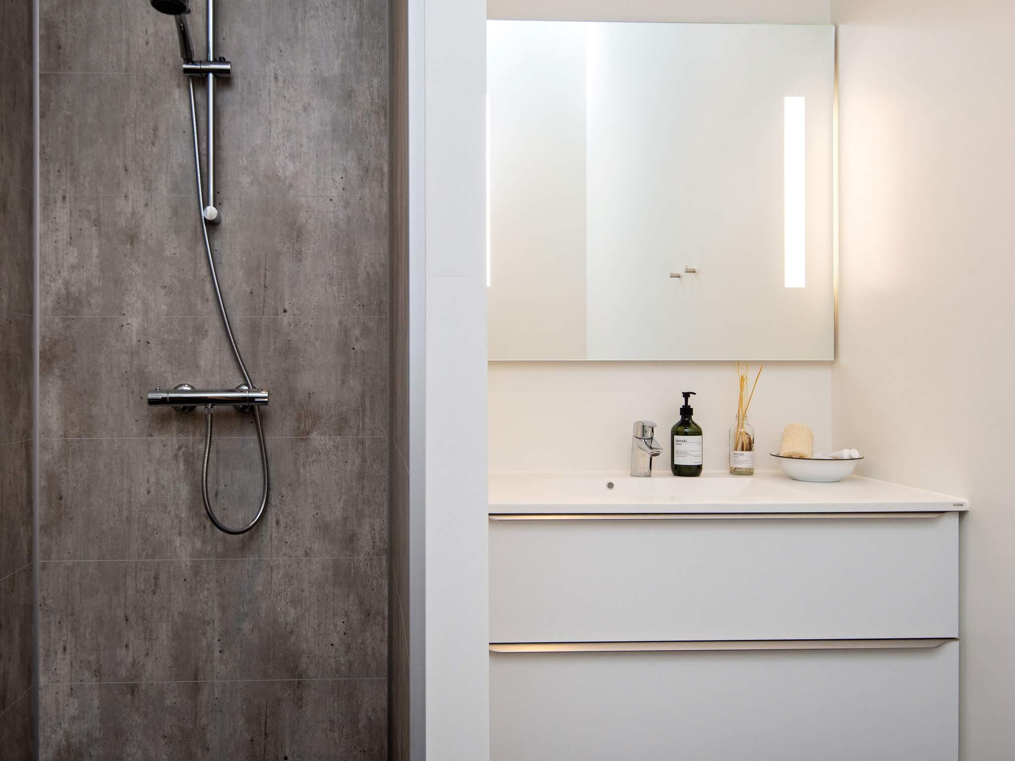 Bad: Waschm., WC, Waschb., Dusche, Fußbodenheiz.