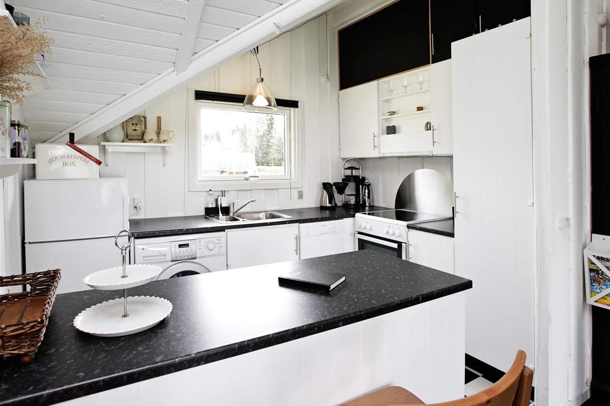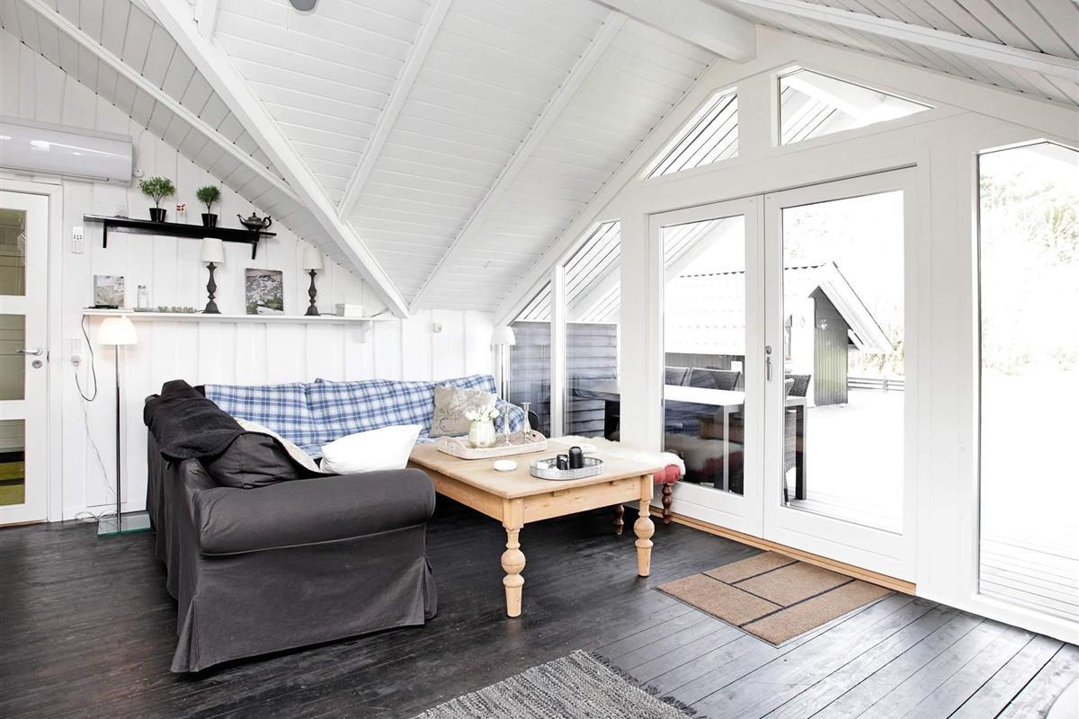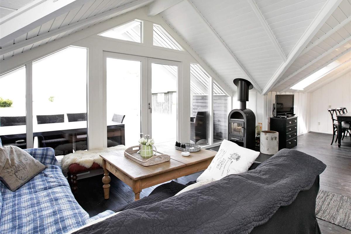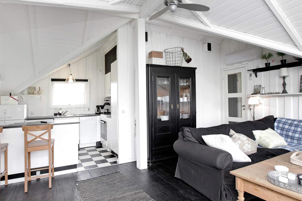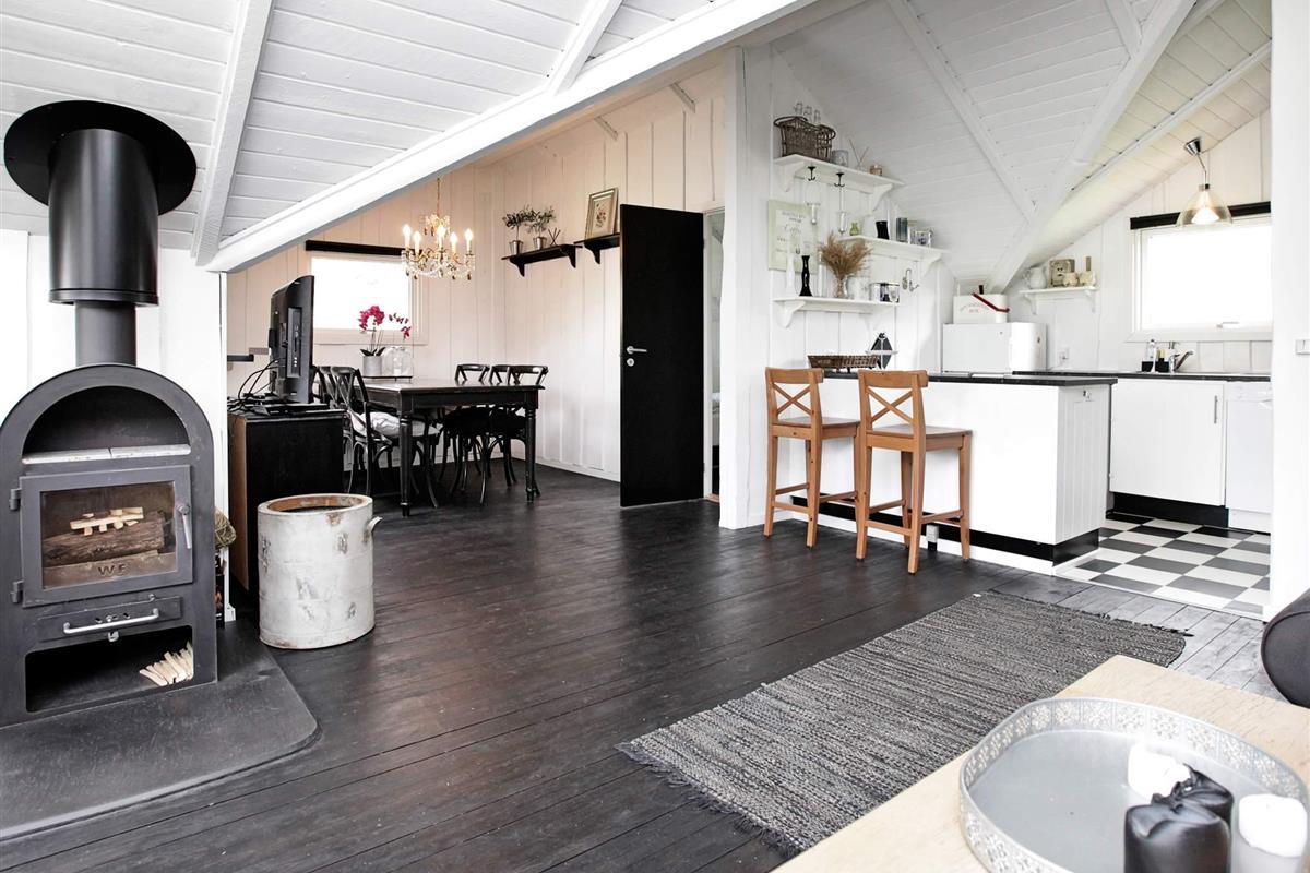 Das Ferienhaus ist hell und wohnlich eingerichtet. Es hat einen offenen Küchen-/Wohnbereich mit Ess- und Sitzecke für das Familienleben sowie Holzofen für kühlere Tage und Zutritt zur Terrasse. Genießen Sie dort die Mahlzeiten des Tages mit Ausblick zum Wasser.