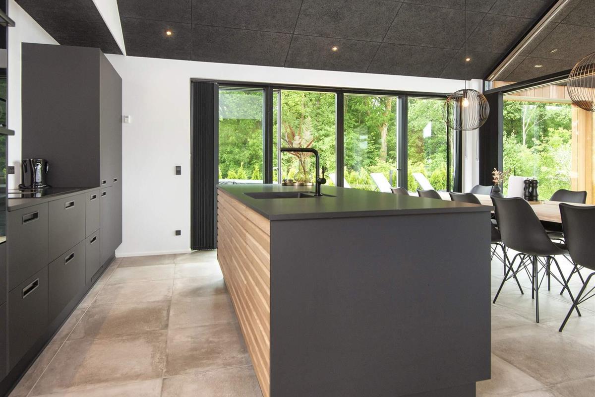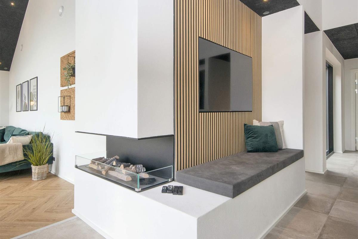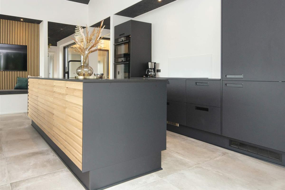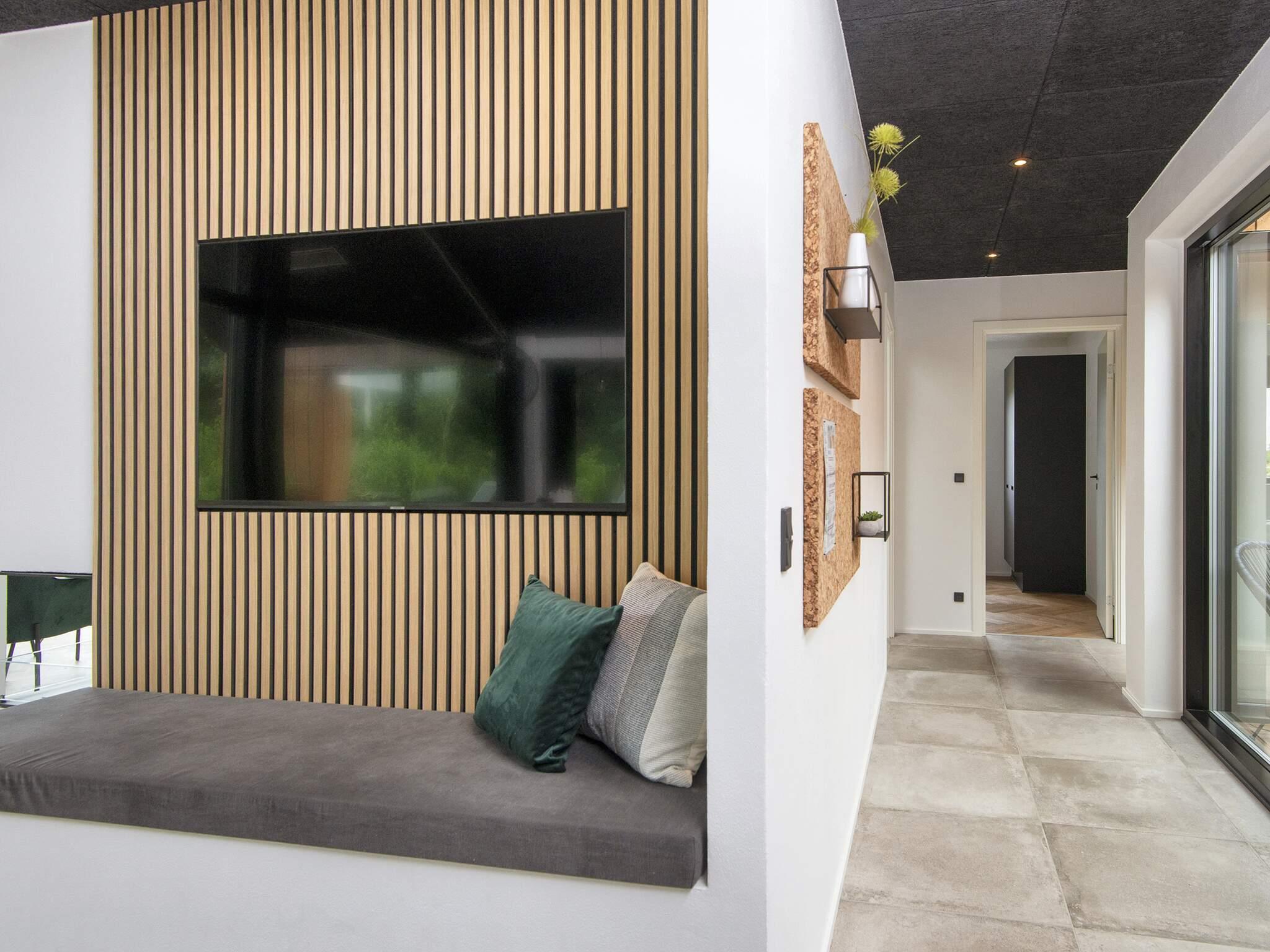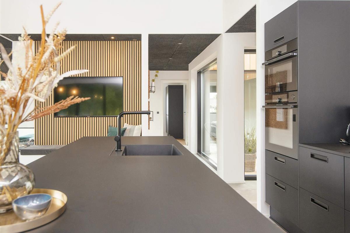 Küche und Wohnzimmer verschmelzen zu einem offenen Raum und schaffen so einen großzügigen und einladenden Bereich zum Entspannen und für geselliges Beisammensein. Große Fenster durchfluten den Raum mit natürlichem Licht und bieten einen bezaubernden Blick auf den See. Schiebetüren führen vom Wohnzimmer auf die überdachte Terrasse, wo Sie Ihren Morgenkaffee oder eine Mahlzeit genießen können.