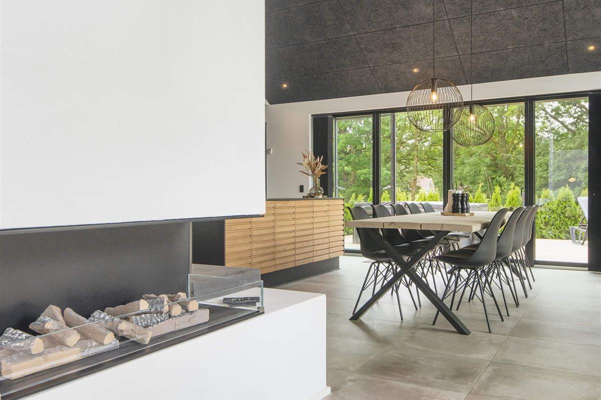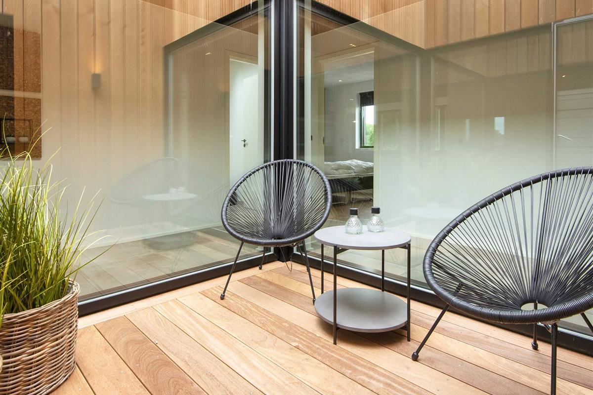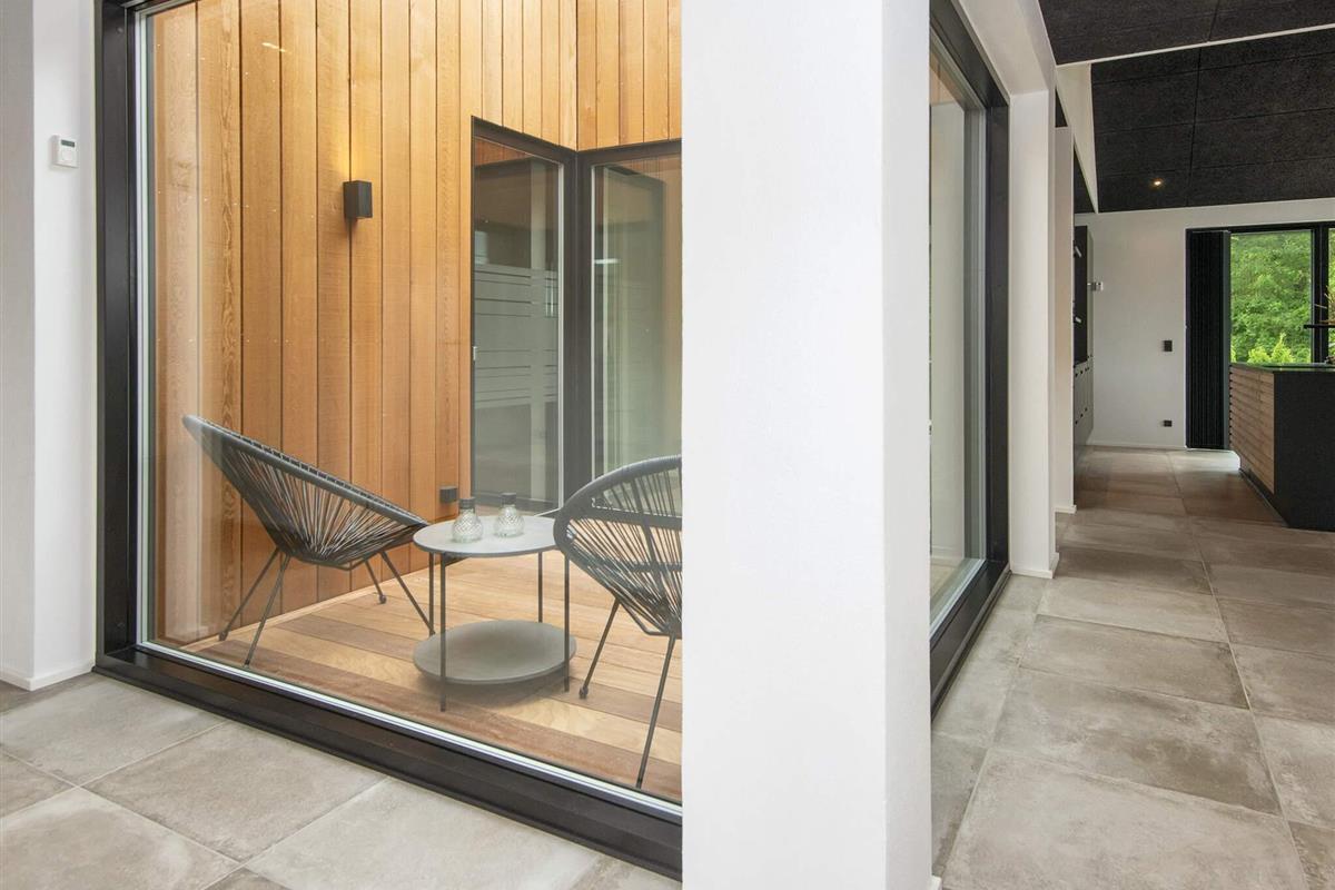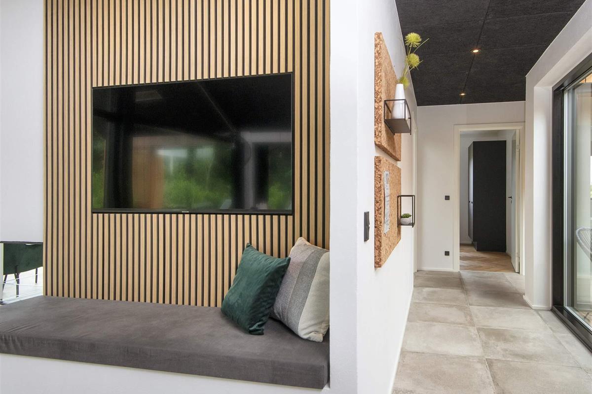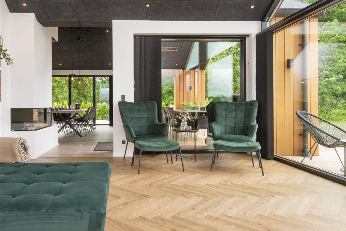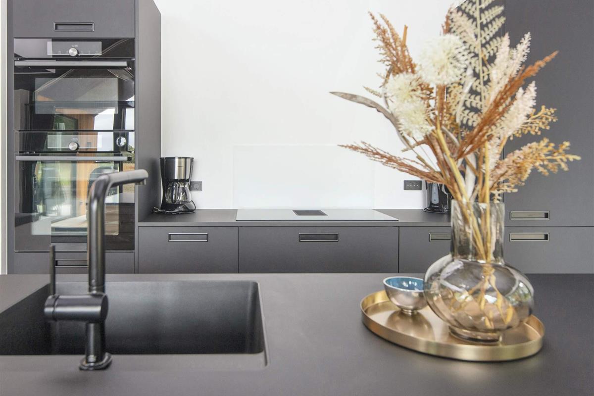 Küche und Wohnzimmer verschmelzen zu einem offenen Raum und schaffen so einen großzügigen und einladenden Bereich zum Entspannen und für geselliges Beisammensein. Große Fenster durchfluten den Raum mit natürlichem Licht und bieten einen bezaubernden Blick auf den See. Schiebetüren führen vom Wohnzimmer auf die überdachte Terrasse, wo Sie Ihren Morgenkaffee oder eine Mahlzeit genießen können.