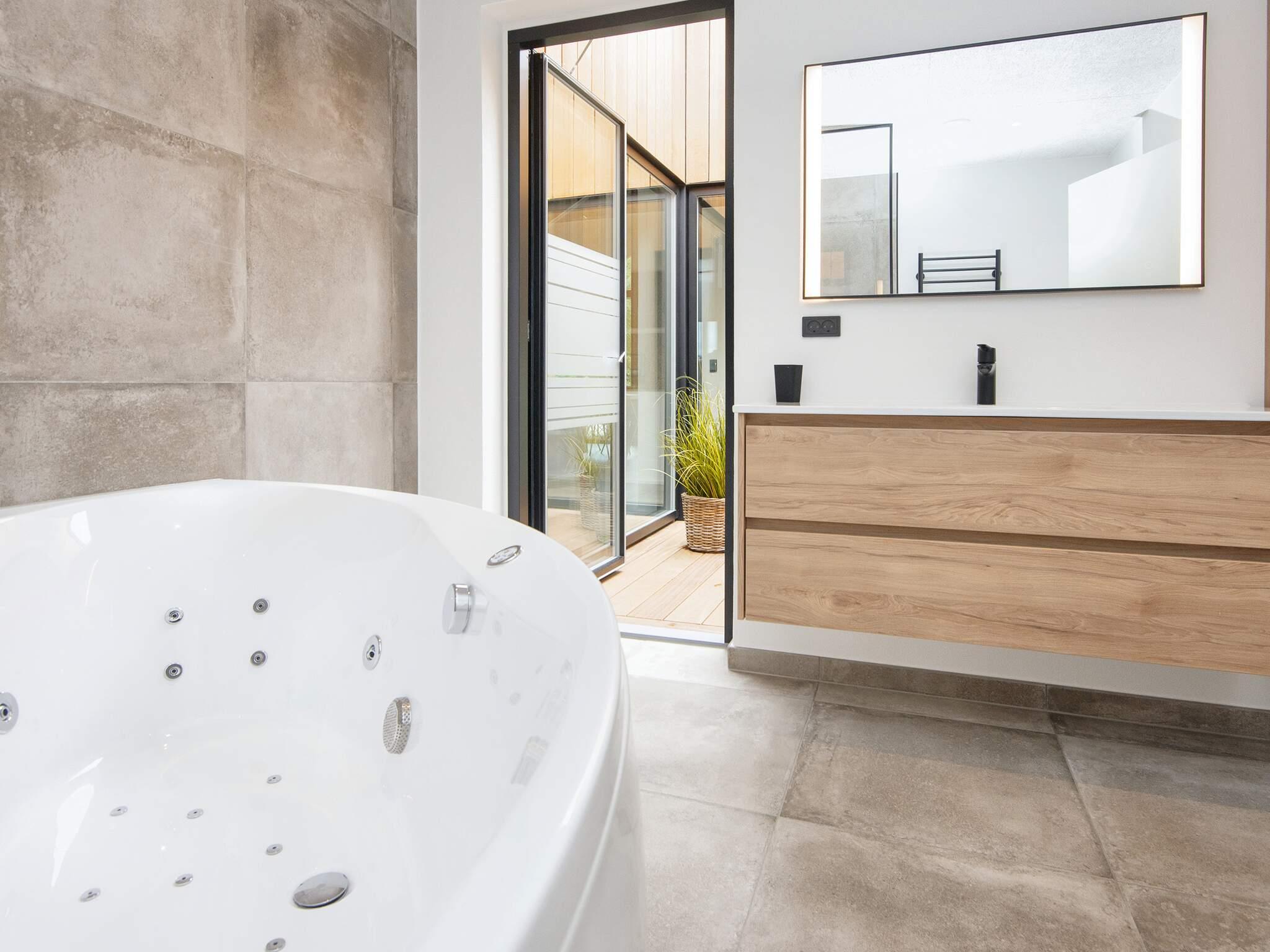 Entspannen Sie sich im Whirlpool im Innenbereich und lassen Sie sich verwöhnen. Lassen Sie den Stress hinter sich und lassen Sie sich vom Wohlbefinden verwöhnen. Wenn Sie die Natur genießen möchten, gibt es auch einen Außenwhirlpool für sechs Personen und eine erfrischende Außendusche, in der Sie in die Schönheit der Natur eintauchen können.