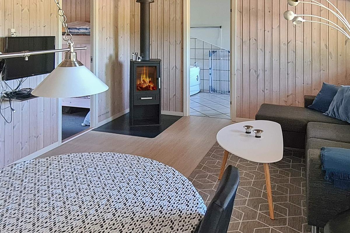Das Ferienhaus selbst ist komfortabel eingerichtet und verfügt über zwei Schlafzimmer; eines mit Doppelbett, das zweite mit Etagenbett. Im Bad sind auch Waschmaschine und Wäschetrockner untergebracht. Offener Küchen-/Wohnbereich mit Ess- und Sitzecke für das Familienleben sowie Holzofen und klimafreundlicher Wärmepumpe. Der Raum bietet Zutritt zur großen, überdachten Veranda des Hauses.