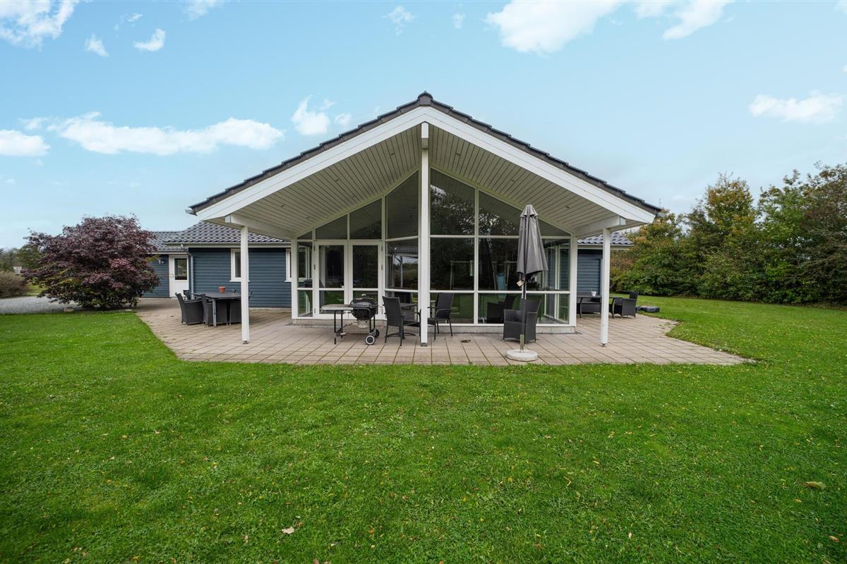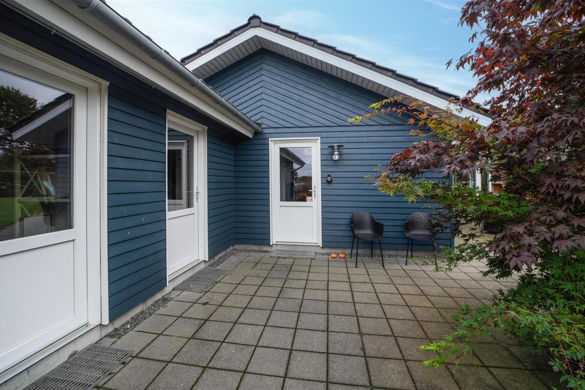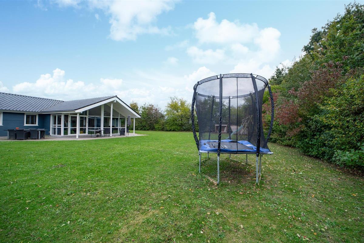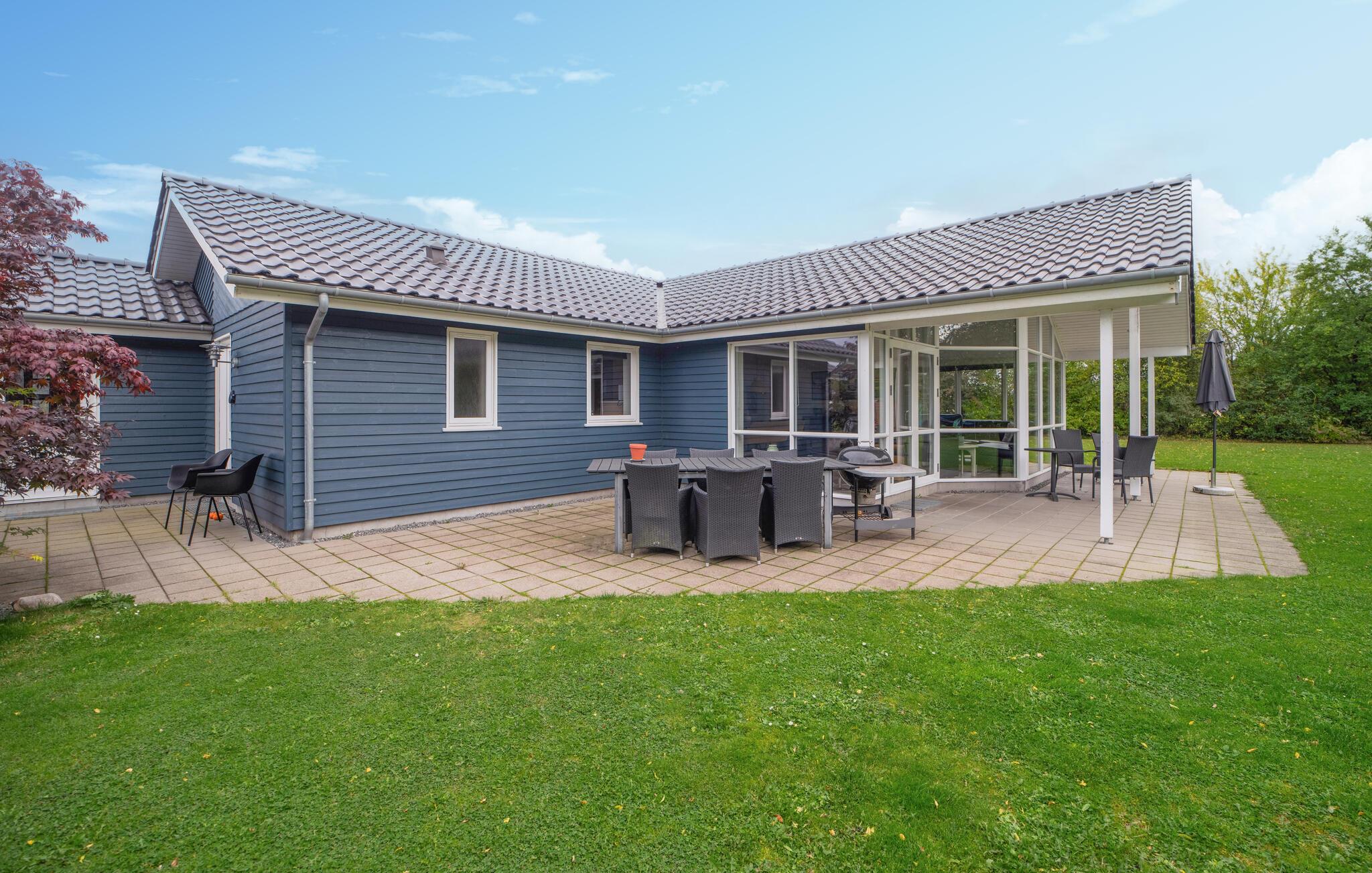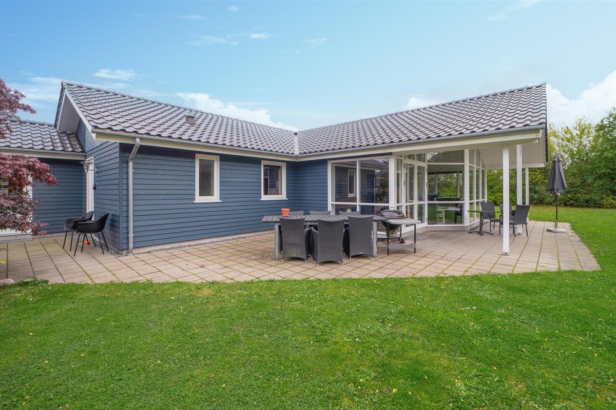 Ruim vakantiehuis met sauna, binnen- en buitenwhirlpool nabij Kvie Sø, in een groene, rustige omgeving voor een ontspannen verblijf.
