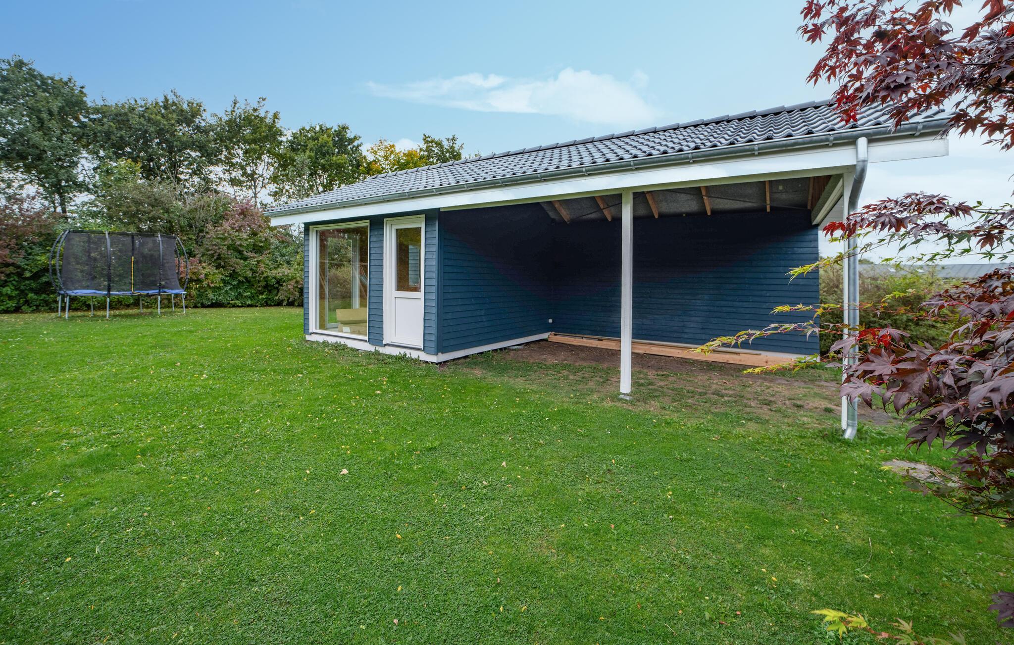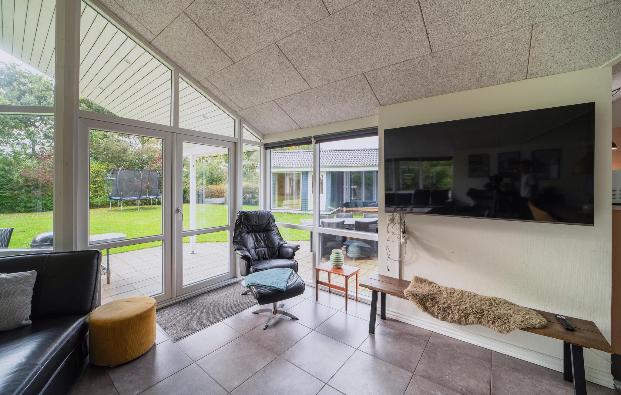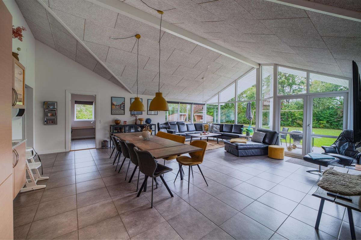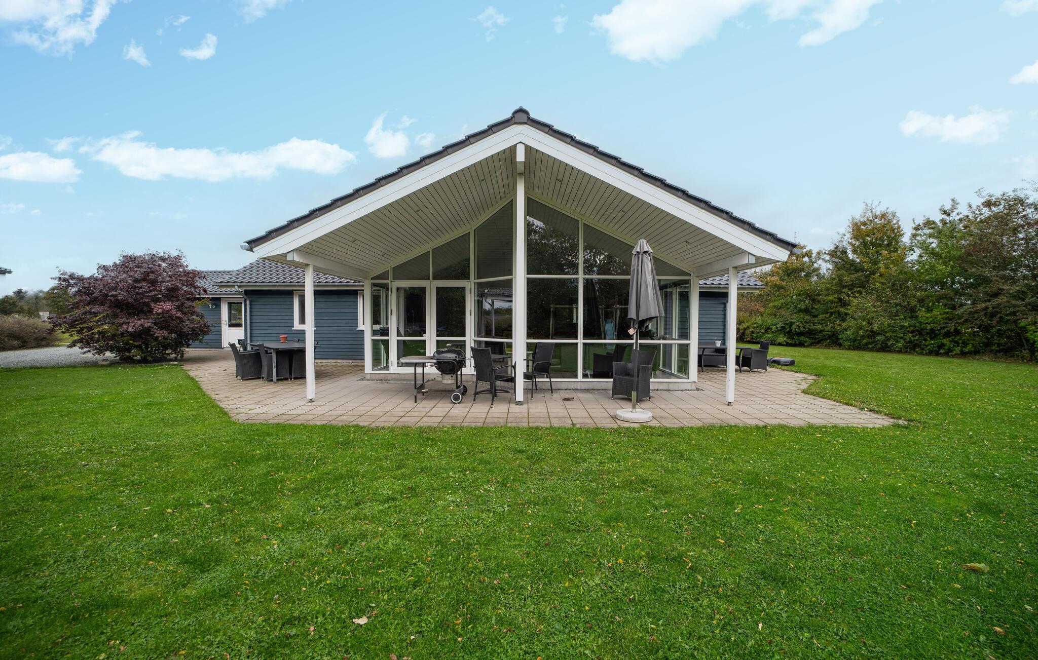 Ruim vakantiehuis met sauna, binnen- en buitenwhirlpool nabij Kvie Sø, in een groene, rustige omgeving voor een ontspannen verblijf.