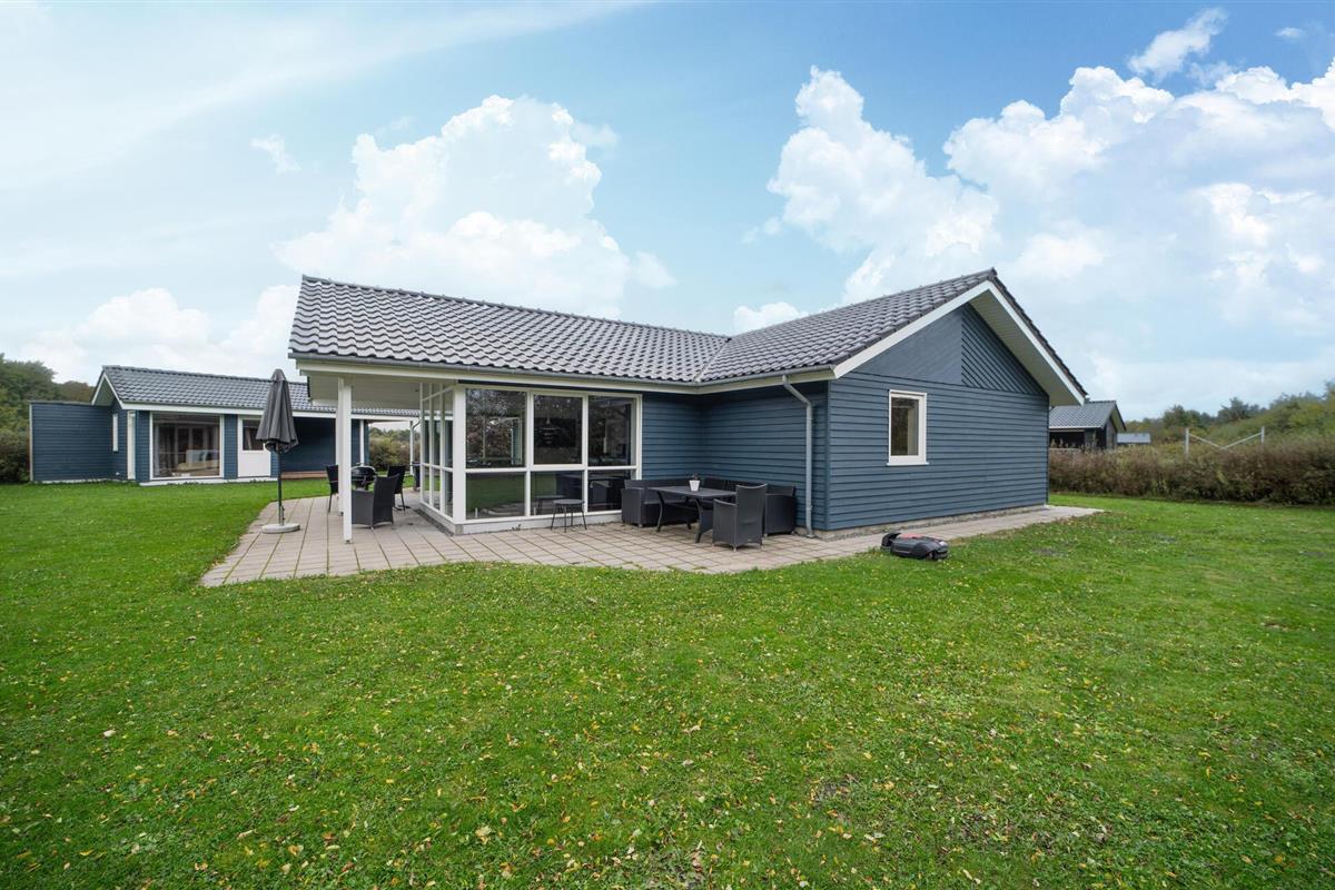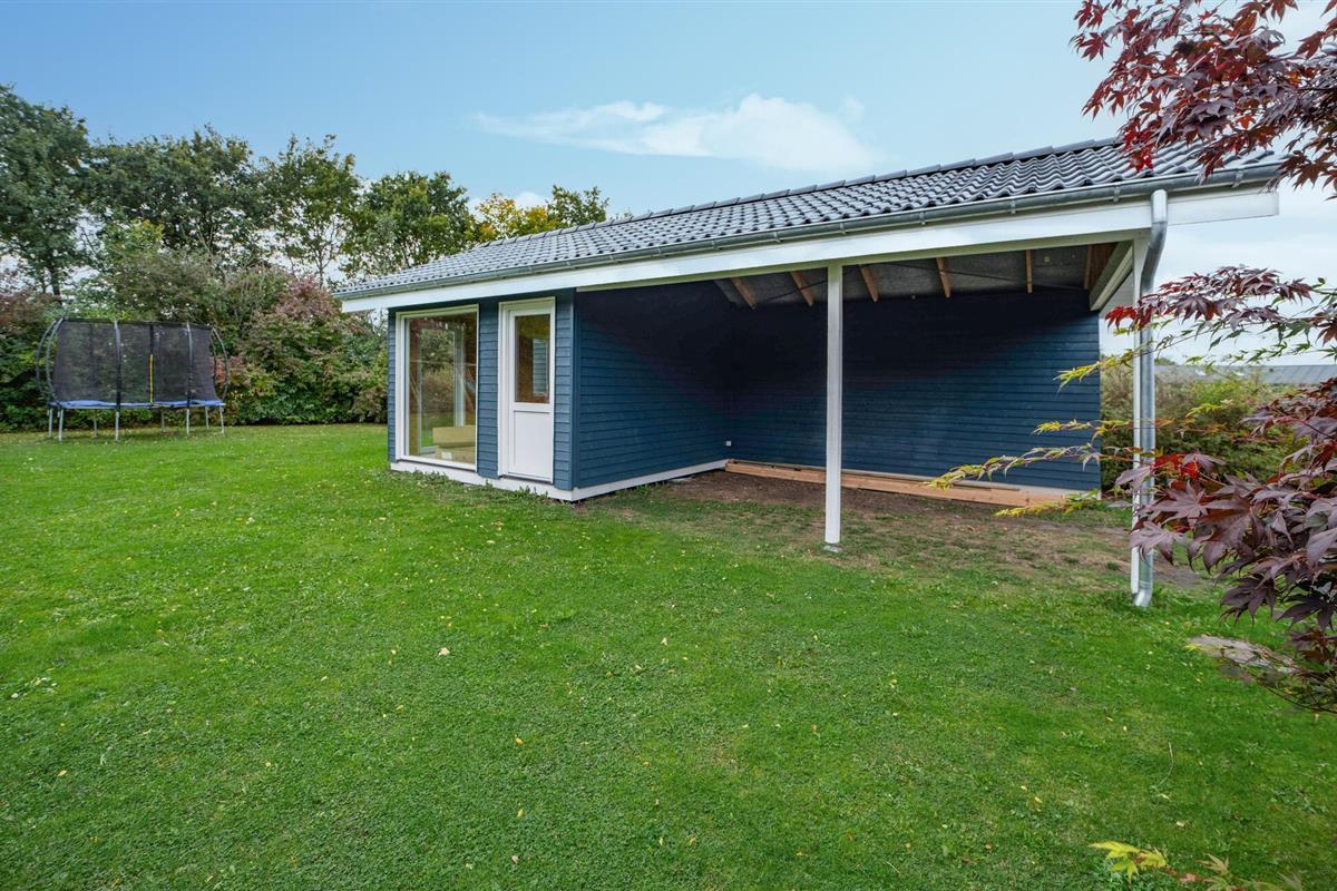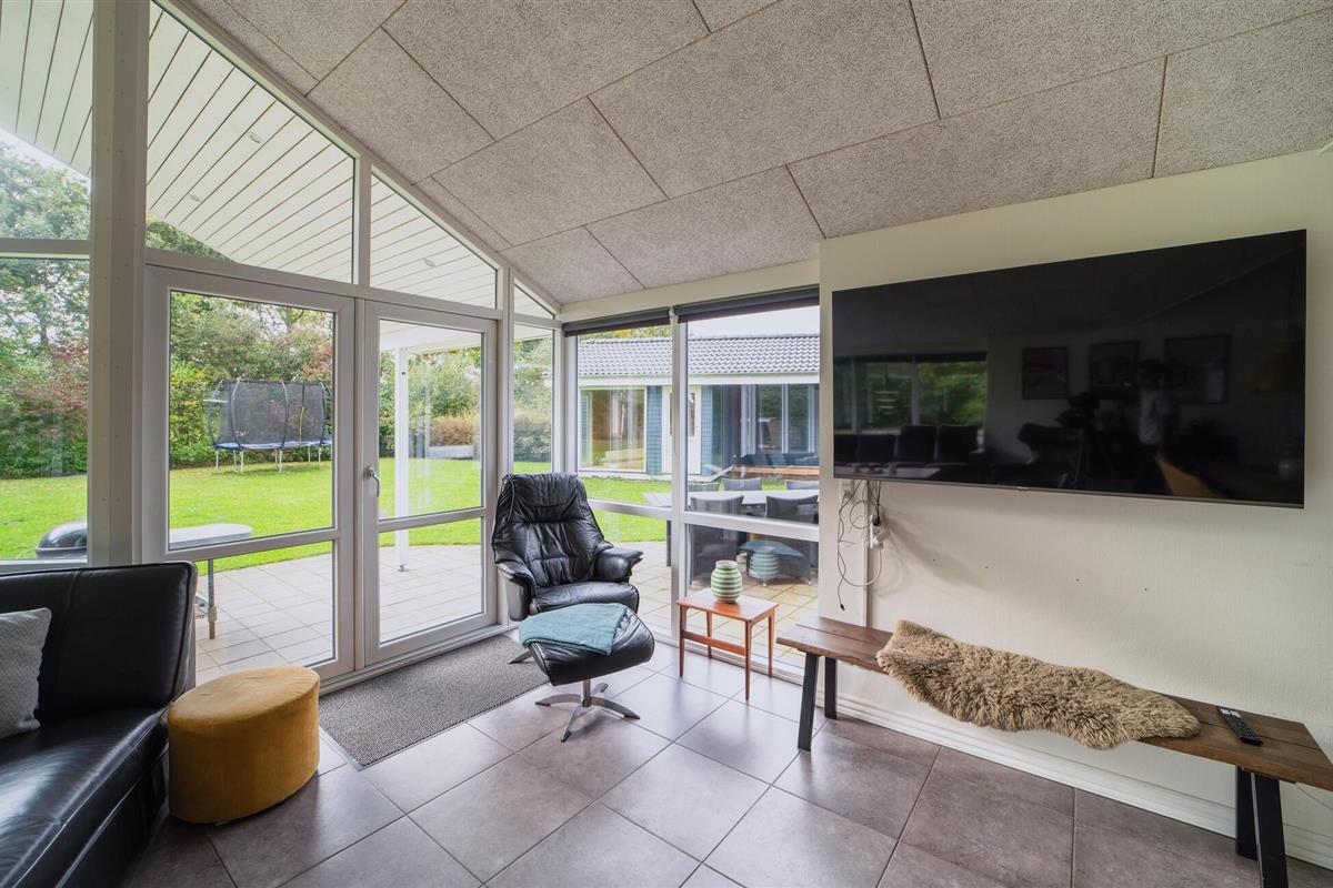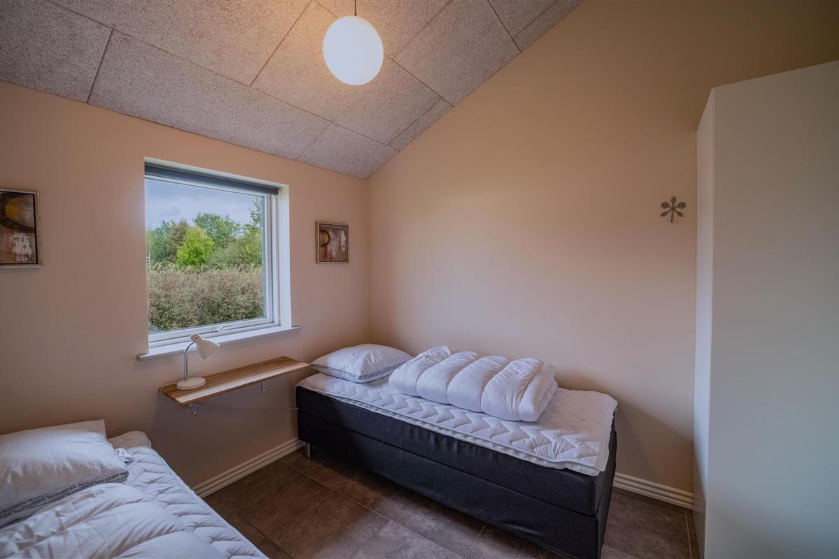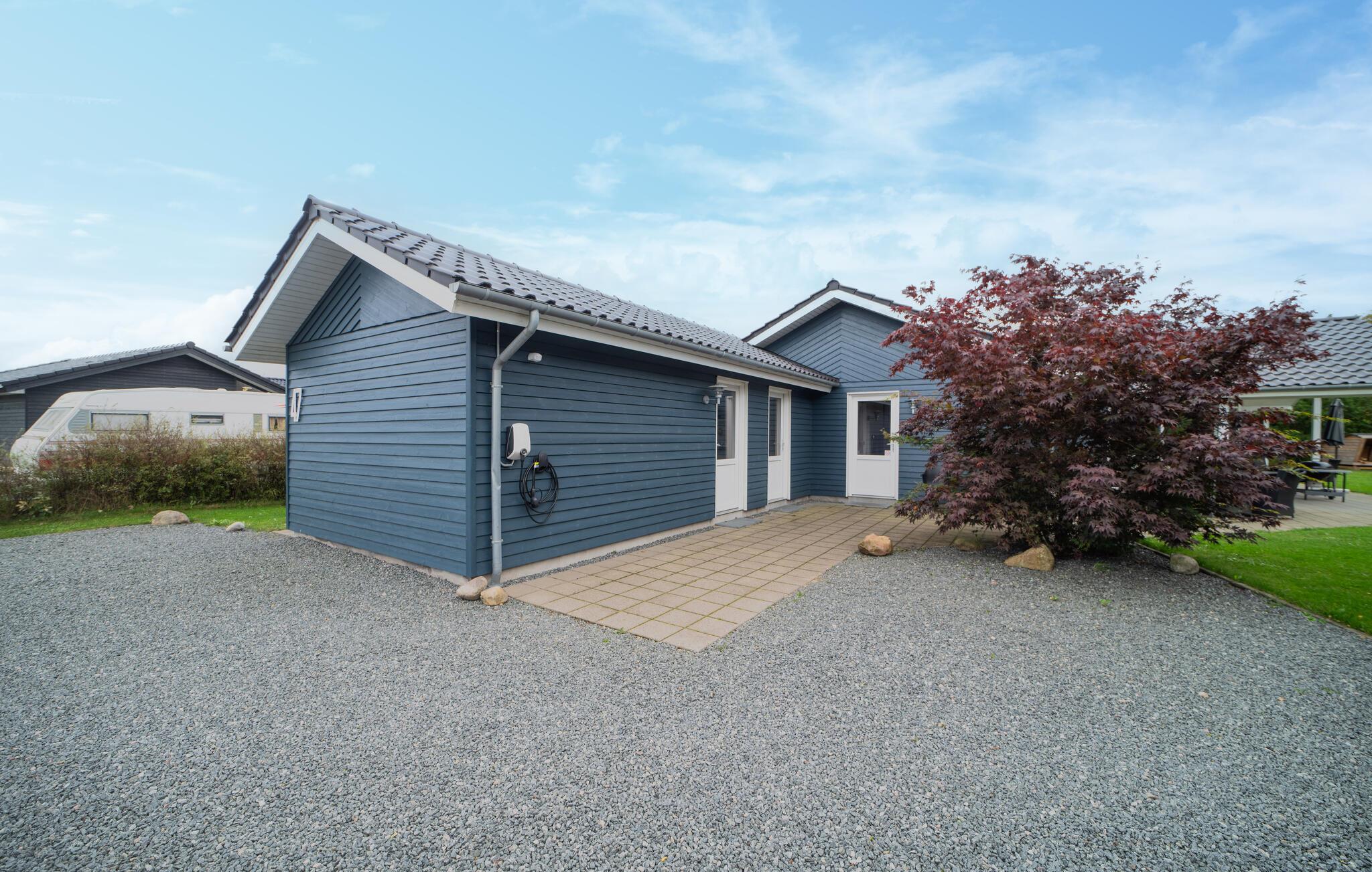 Ruim vakantiehuis met sauna, binnen- en buitenwhirlpool nabij Kvie Sø, in een groene, rustige omgeving voor een ontspannen verblijf.