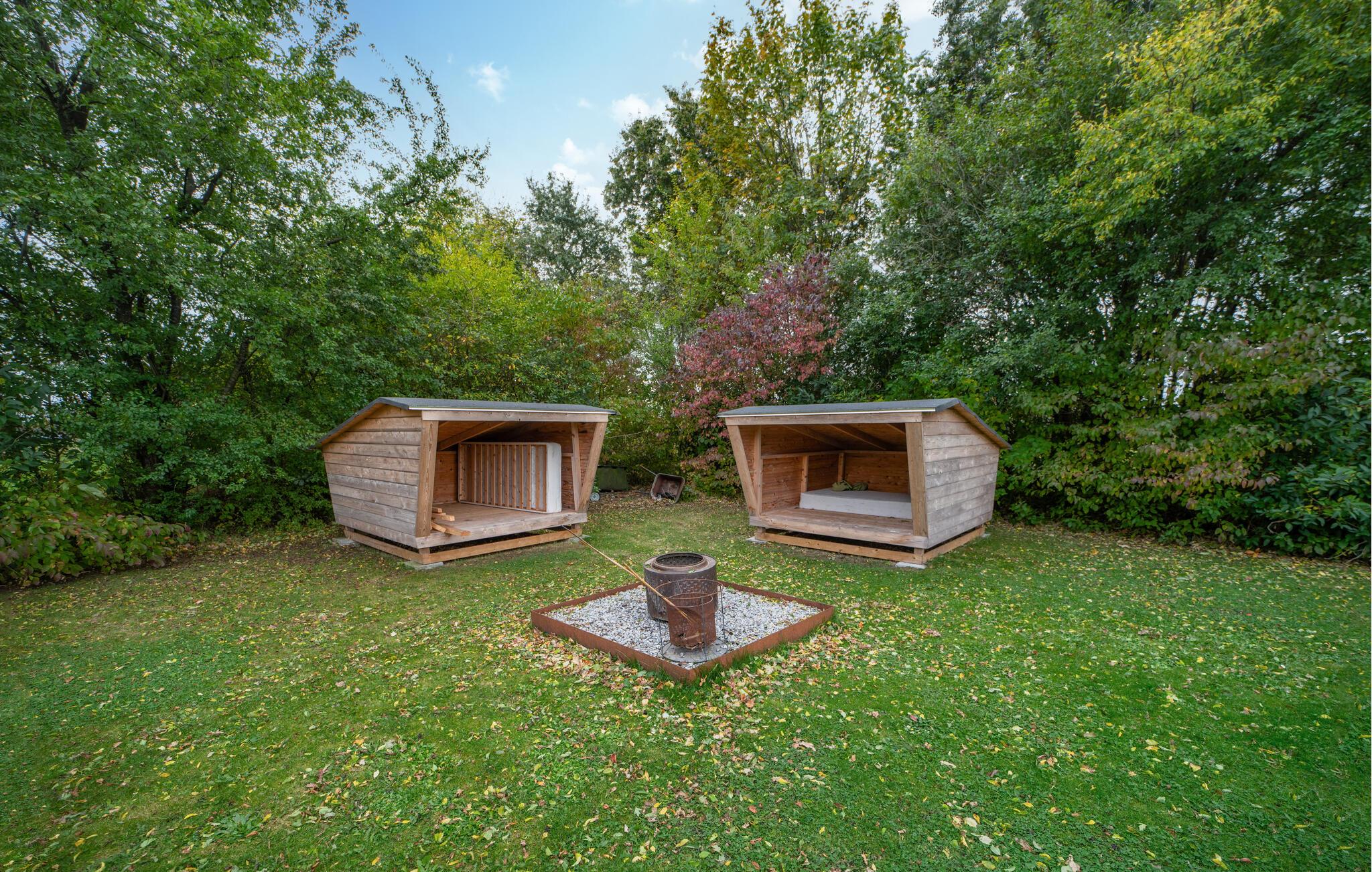Stap uit op het grote, gedeeltelijk overdekte terras en geniet van het uitzicht op de goed onderhouden tuin. Geniet van het borrelende warme water in de buitenwhirlpool en kijk hoe de kinderen spelen op het uitgestrekte gazon met talloze speeltoestellen. Ontspan 's avonds in de gezellige schuilhutten bij de kampvuurplaats.