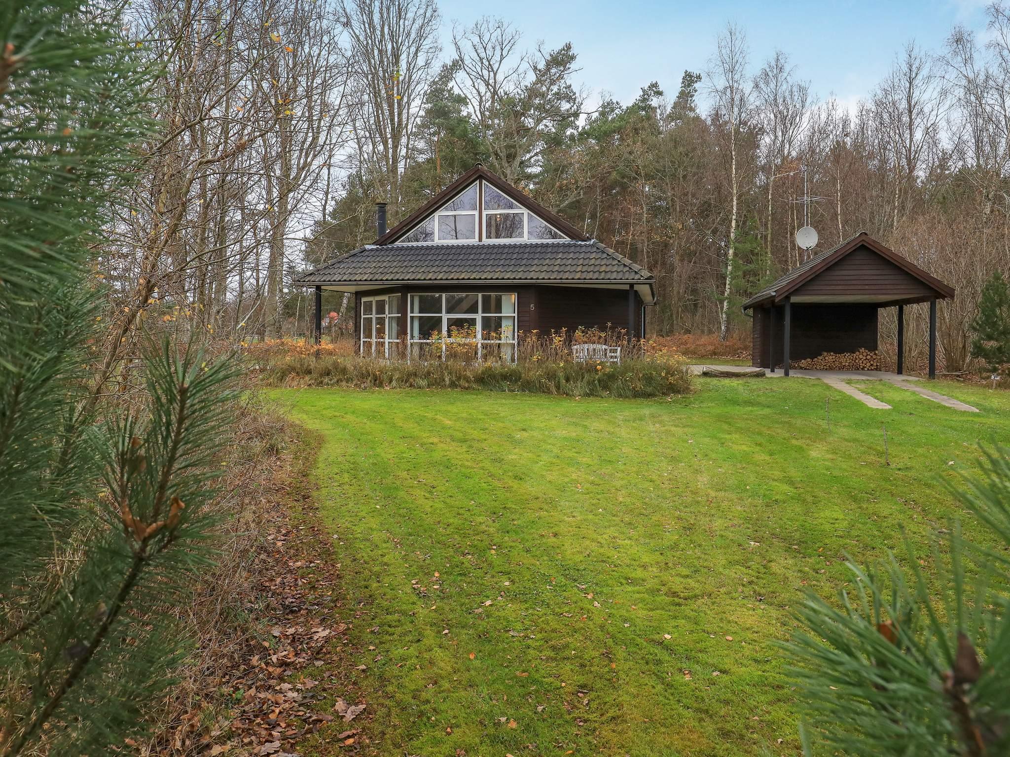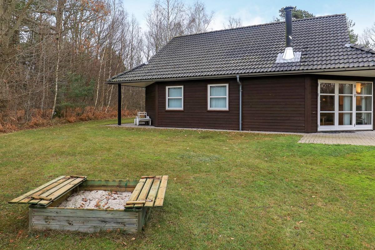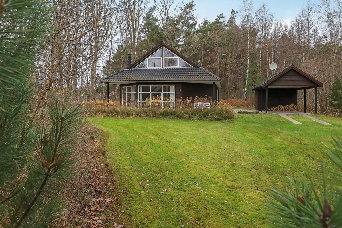 Im Außenbereich steht eine große, sich fast um das ganze Haus erstreckende Terrassenfläche zur Verfügung, die teilweise überdacht ist und so bei fast jeder Wetterlage genutzt werden kann. Die Lage des Hauses ist ungestört, am Rande eines ruhigen Waldgebietes, wo man z.B. Pilze suchen oder Rehe und Fasane beobachten kann. Am Haus gibt es zudem einen kleinen Sandkasten sowie einen Carport mit Schuppen.