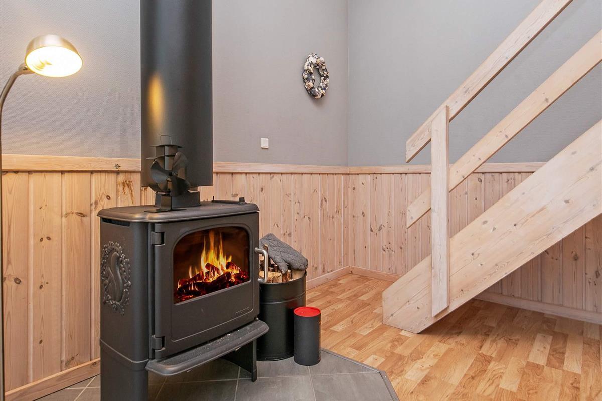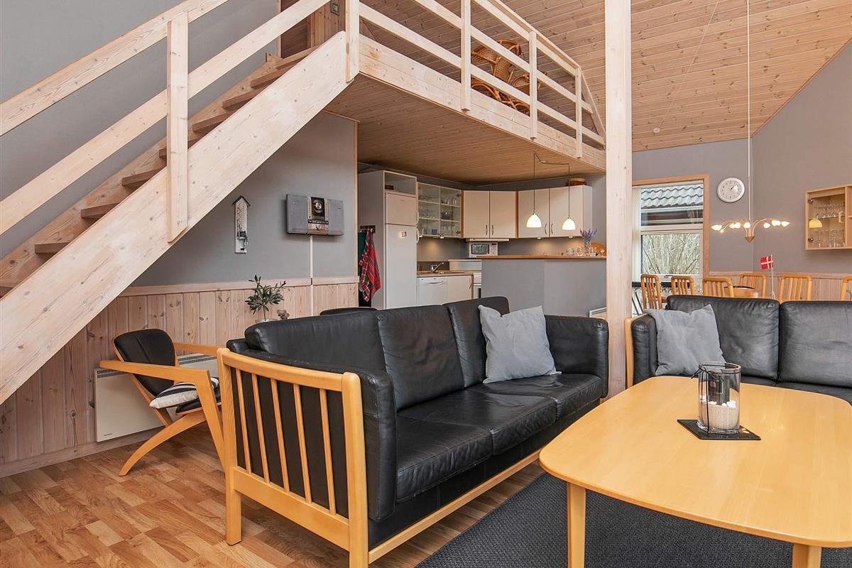 Das Ferienhaus ist im Erdgeschoss ansprechend eingerichtet und verfügt über ein großes Badezimmer mit Dusche, Fußbodenheizung und Sauna, ein Gäste-WC und einen geräumigen, gut ausgestatteten Küchen-/Wohnbereich mit einladendem Essplatz. Die bis zum First offene Zimmerdecke und der Holzofen tragen hier zum wohnlichen Ambiente bei. Es stehen unten zudem ein größeres Schlafzimmer mit Doppelbett und ein weiteres Schlafzimmer mit zwei Einzelbetten bereit. Über eine Holztreppe gelangt man hinauf auf die offene Galerie mit einigen Sitzgelegenheiten und zu zwei weiteren Schlafzimmern oben unter der Dachschräge.
