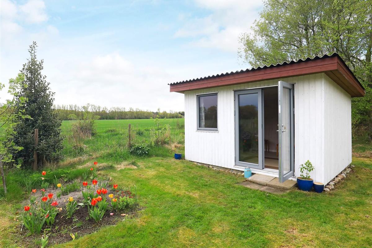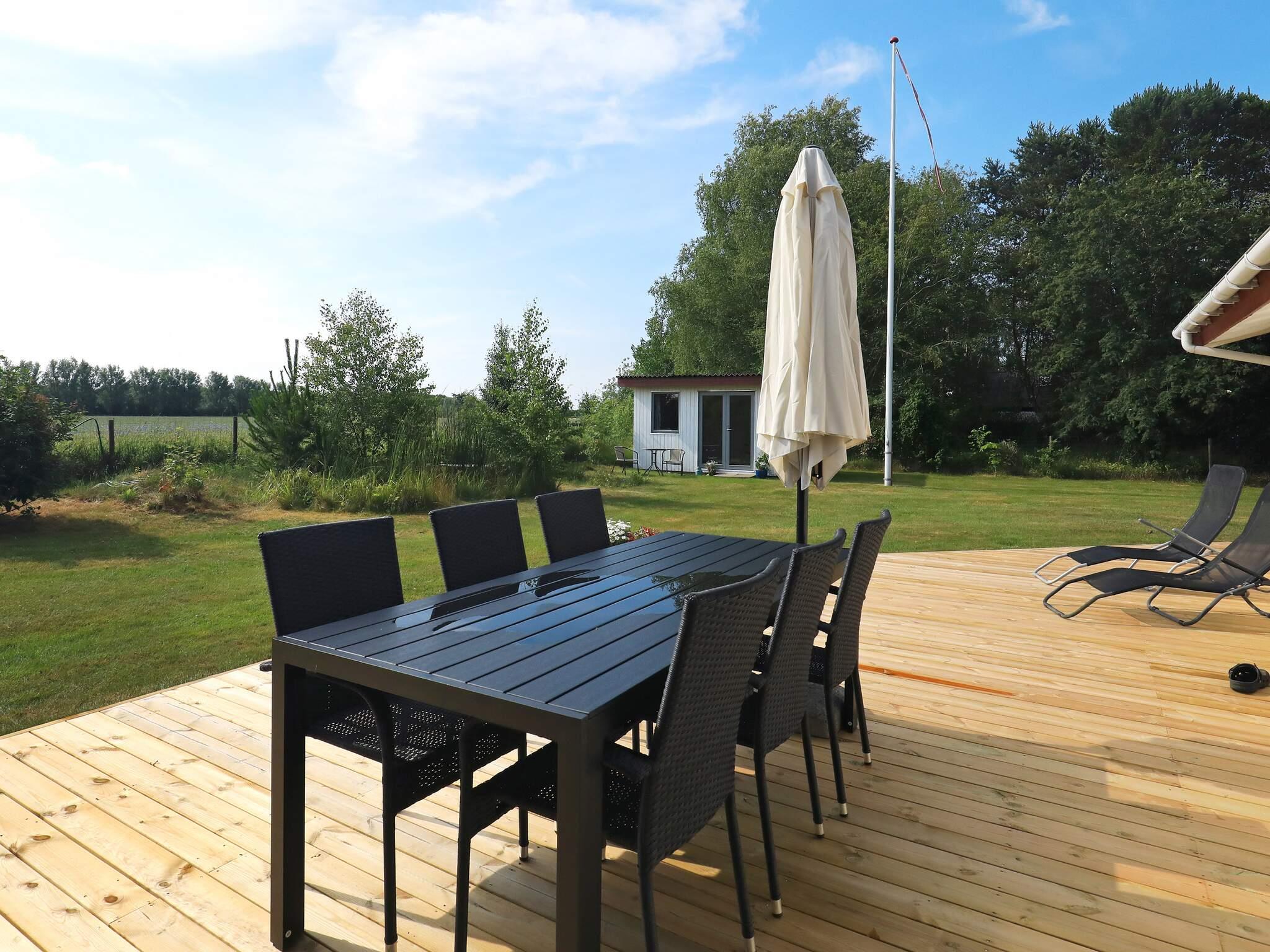 Schöne Holzterrasse am Haus auf der Sie die Mahlzeiten genießen können. Nebenan auf dem Rasengrundstück steht ein kleiner, ganzjährig isolierter Annex mit einer Schlafcouch für zwei Personen. Auf dem Naturgrundstück befindet sich direkt neben der Terrasse und dem Anbau zudem ein kleiner Gartenteich mit Goldfischen.