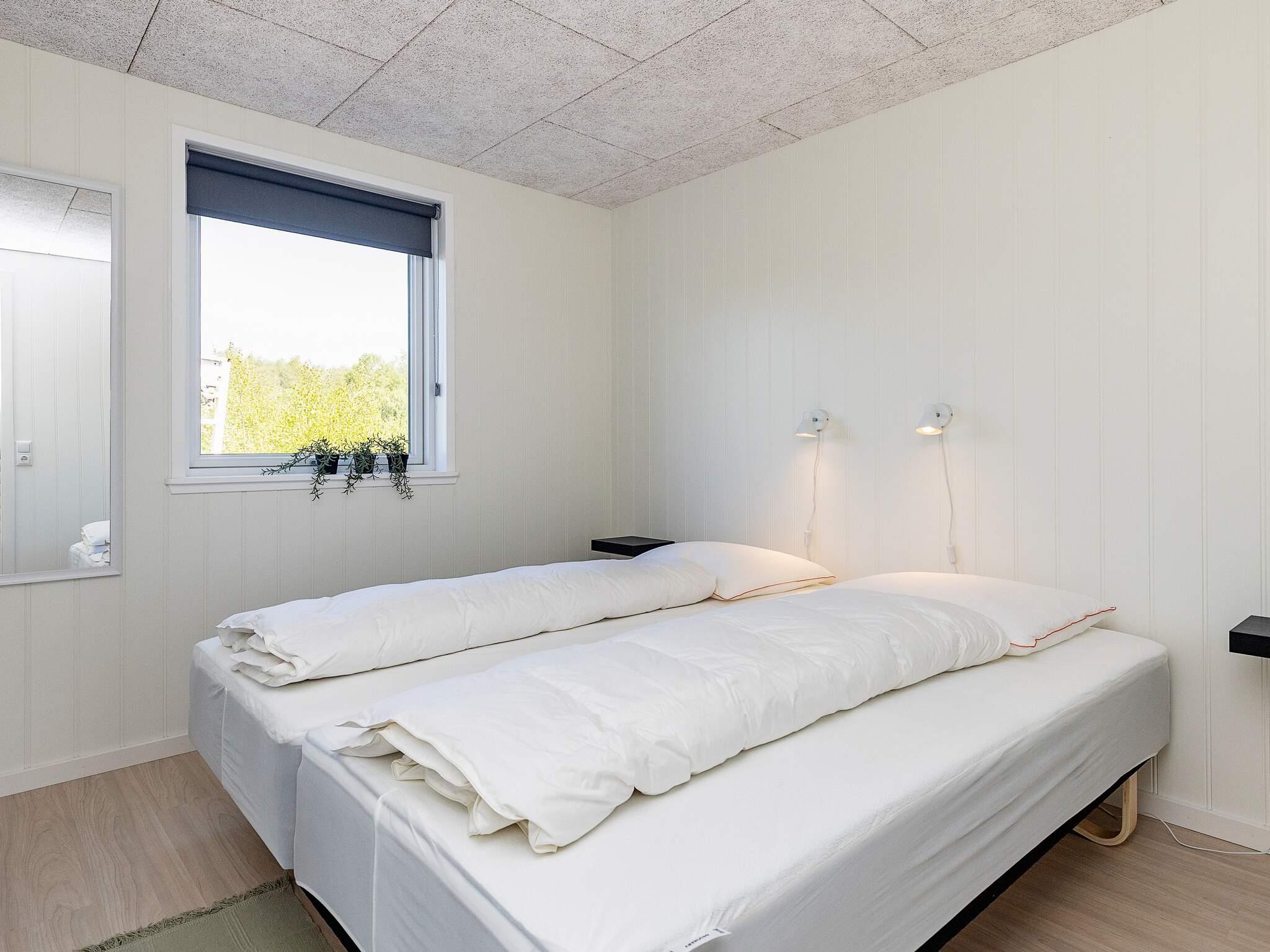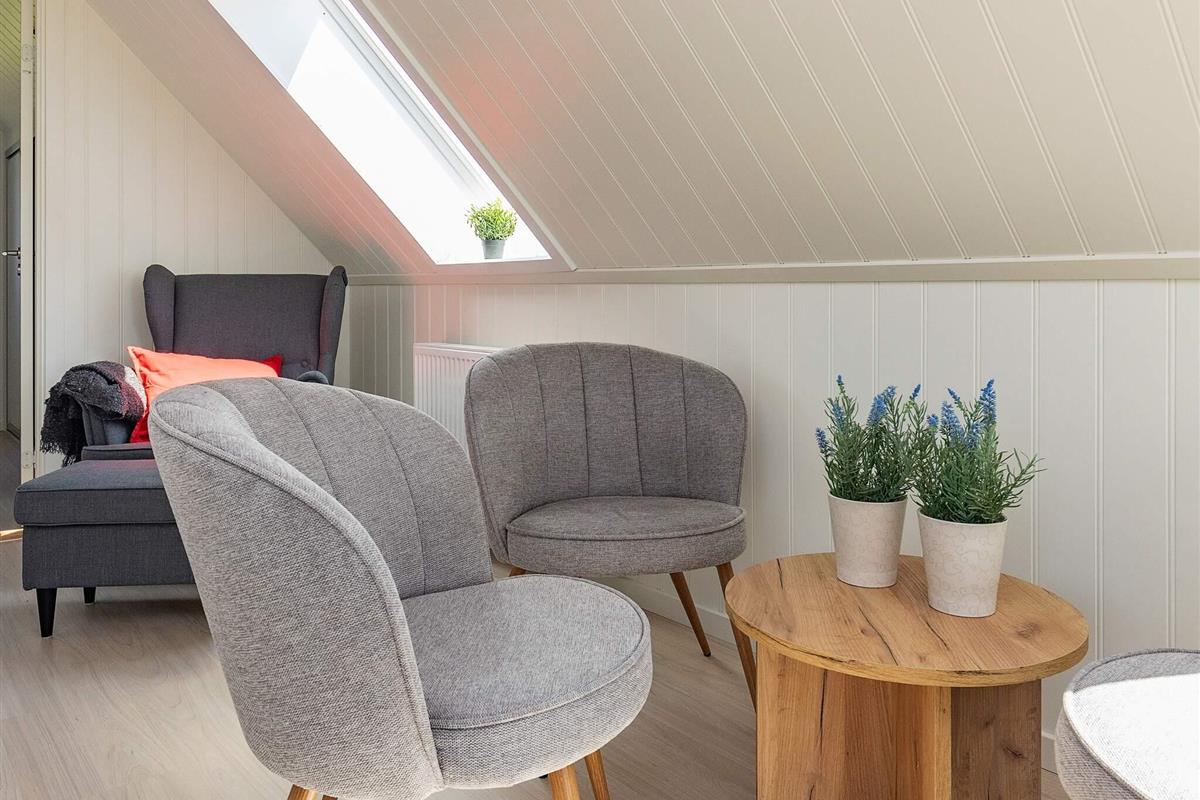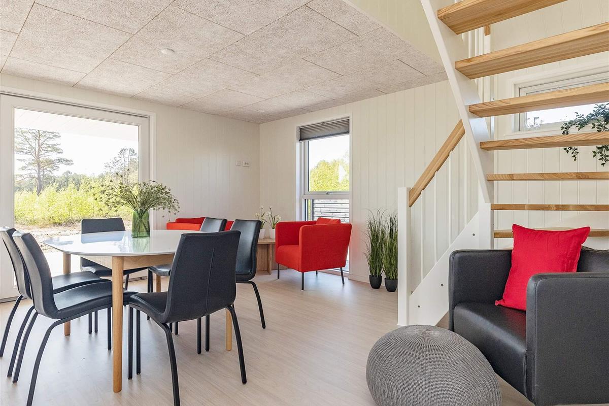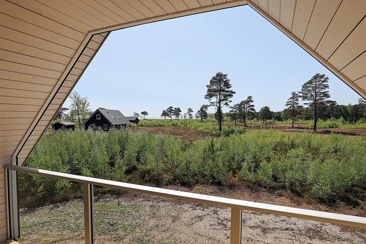 Eine klimafreundliche Luft-Wasser-Wärmepumpe sorgt für Energieeffizienz und ein ganzjährig angenehmes Raumklima. Große Fenster sorgen für viel Tageslicht und bieten Ausblicke auf die umliegende Ferienhaussiedlung, was die einladende Atmosphäre des Hauses unterstreicht.