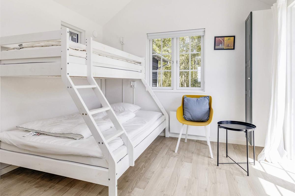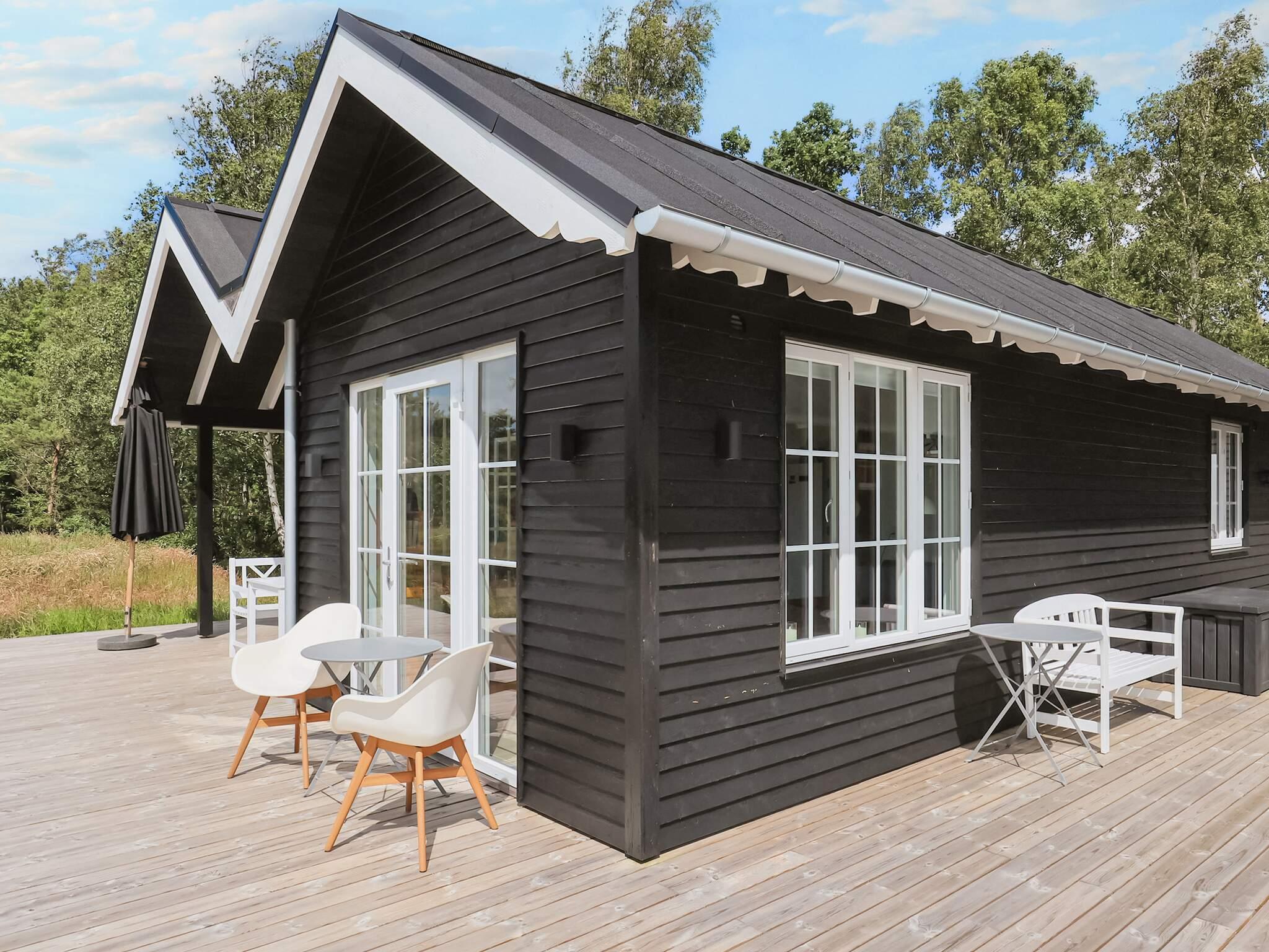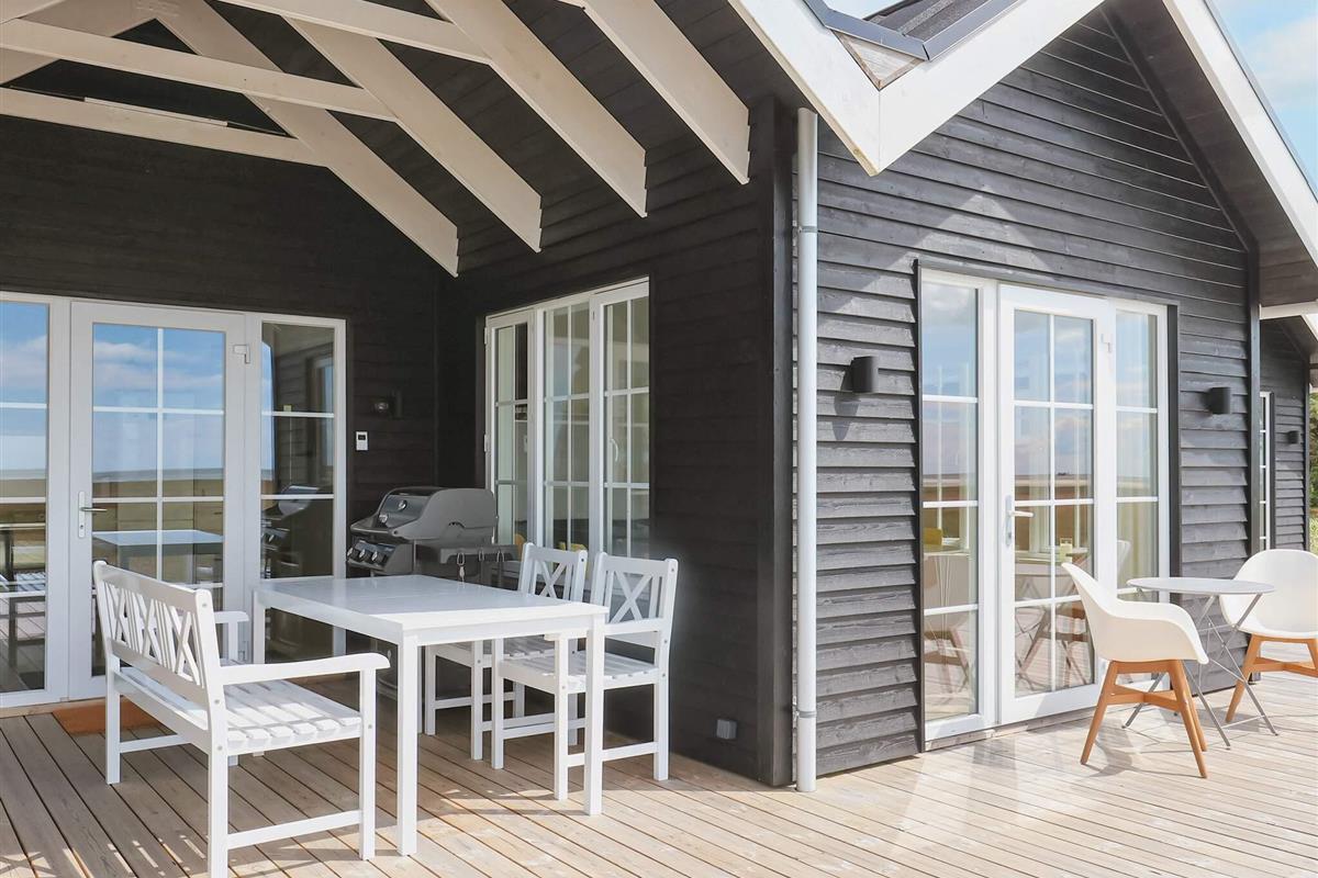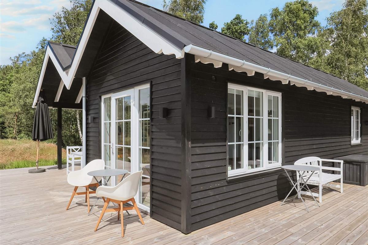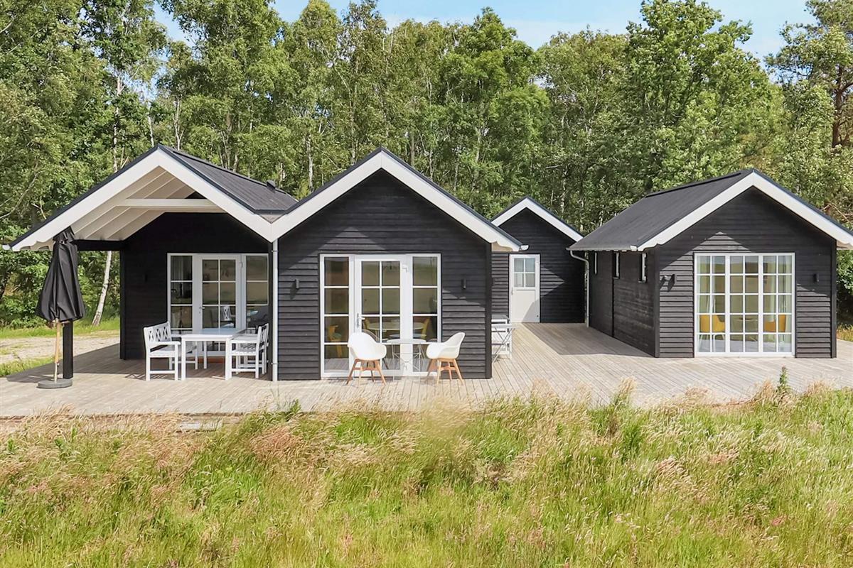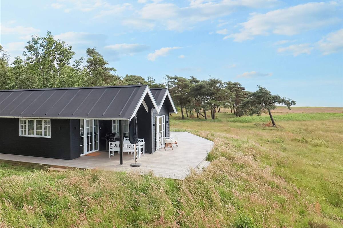Das Sommerhaus wurde mit Fokus auf Komfort und Ästhetik gestaltet und verfügt über eine moderne schwarze Holzfassade mit großen Fenstern, die das nordjütländische Licht hereinlassen und eine helle und offene Atmosphäre schaffen. An warmen Tagen können Sie die Türen zur großen, sonnigen Holzterrasse öffnen und die Aussicht in vollen Zügen genießen. Das Haus verfügt über vier Schlafzimmer, verteilt auf das Haupthaus und einen separaten Anbau, die sowohl Privatsphäre als auch Flexibilität bieten.