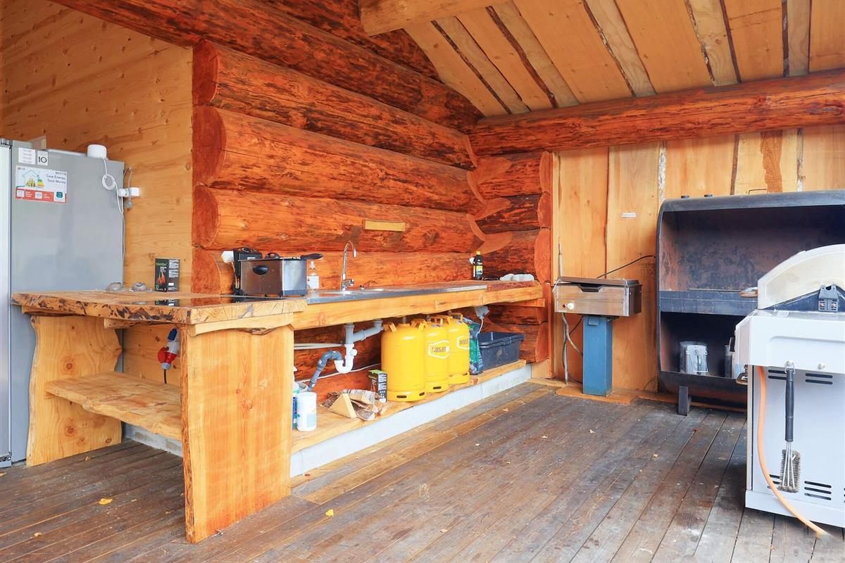 Das Haupthaus bietet außerdem Zugang zur großen Terrasse, die unter anderem eine schöne Außenküche und zwei Wildnisbäder bietet. Diese Terrasse verbindet das Haupthaus mit dem Nebengebäude, das drei Schlafzimmer und ein Badezimmer sowie die Sauna und das gemütliche Poolhaus beherbergt.