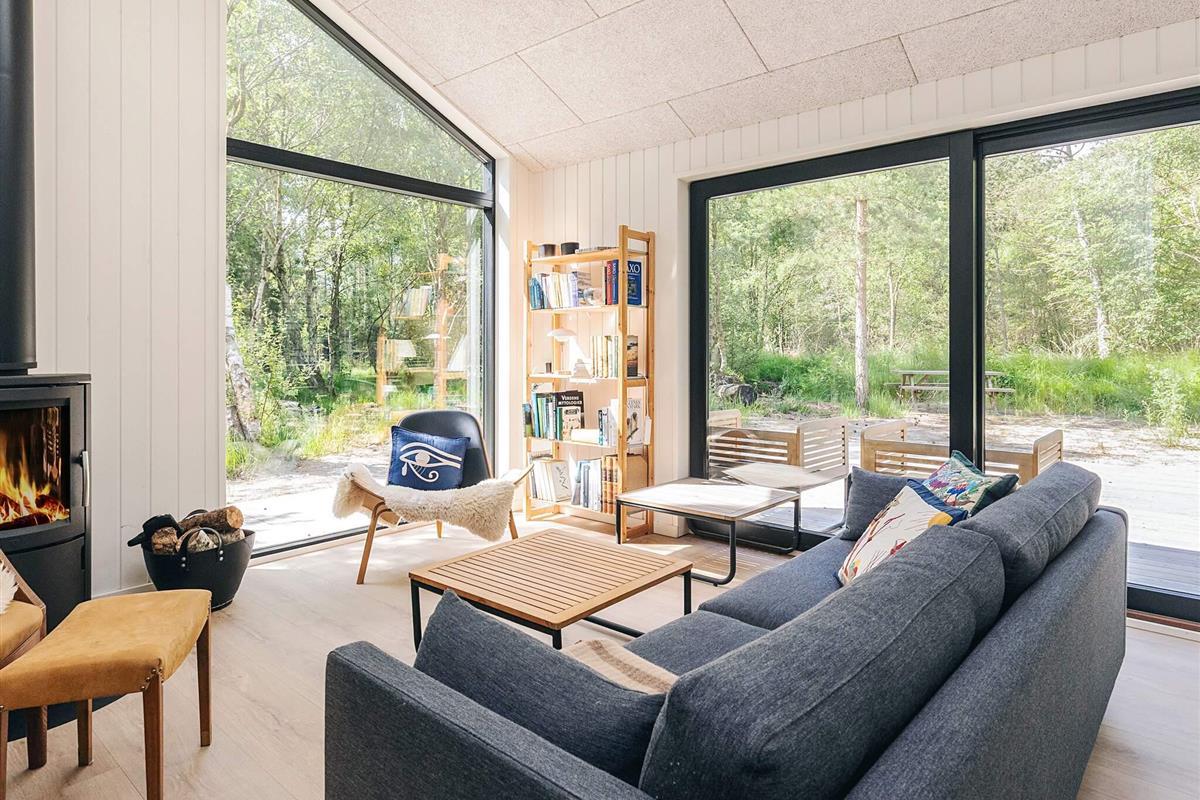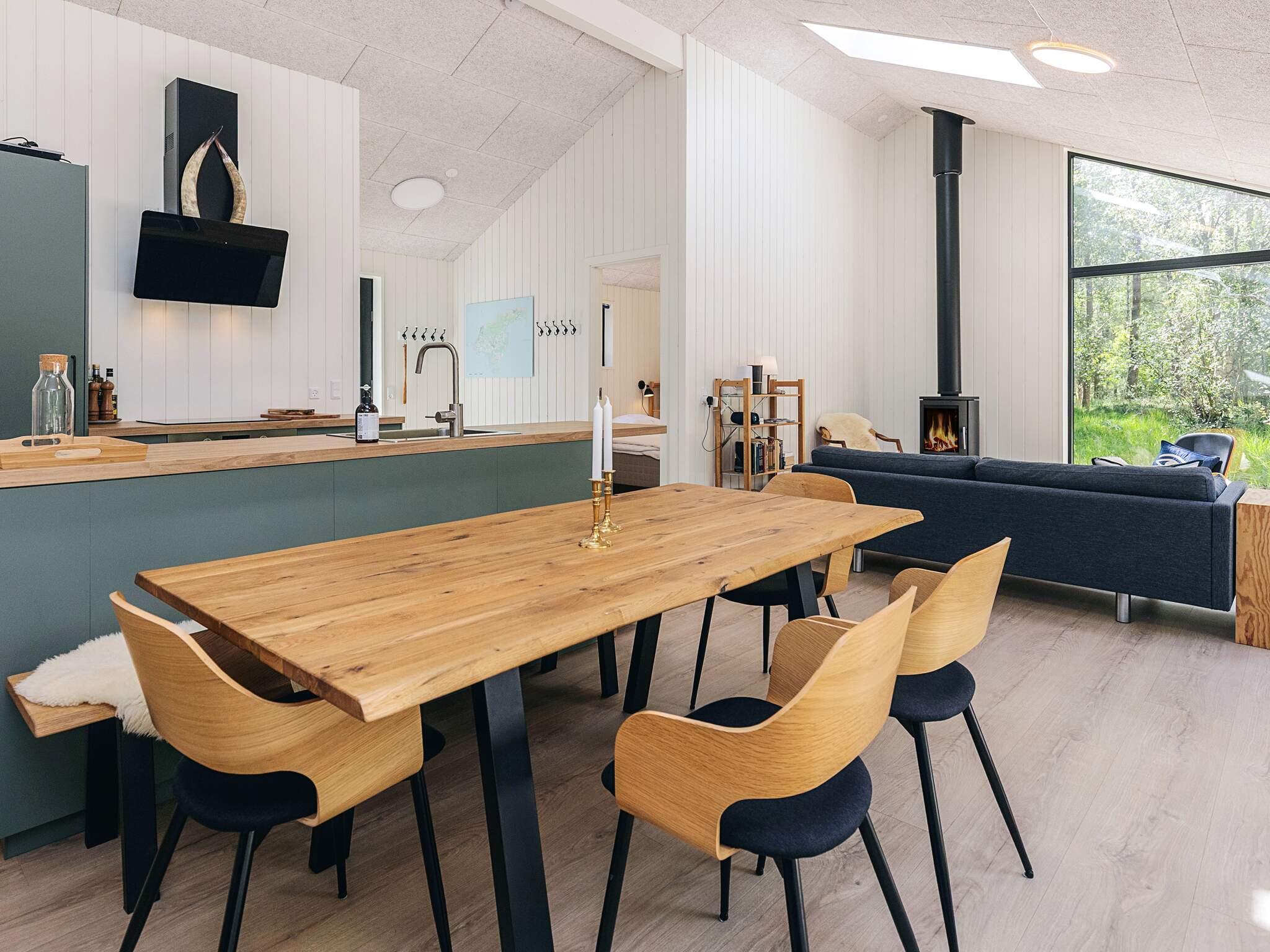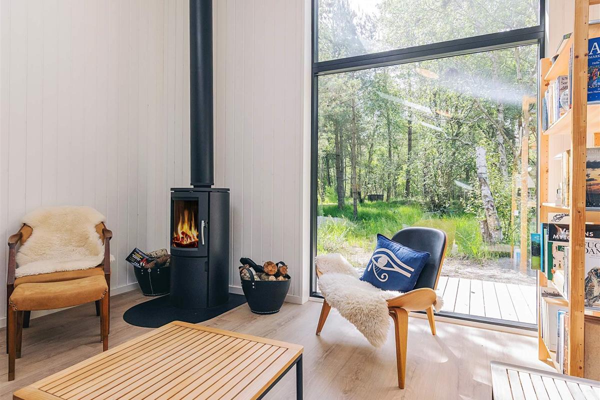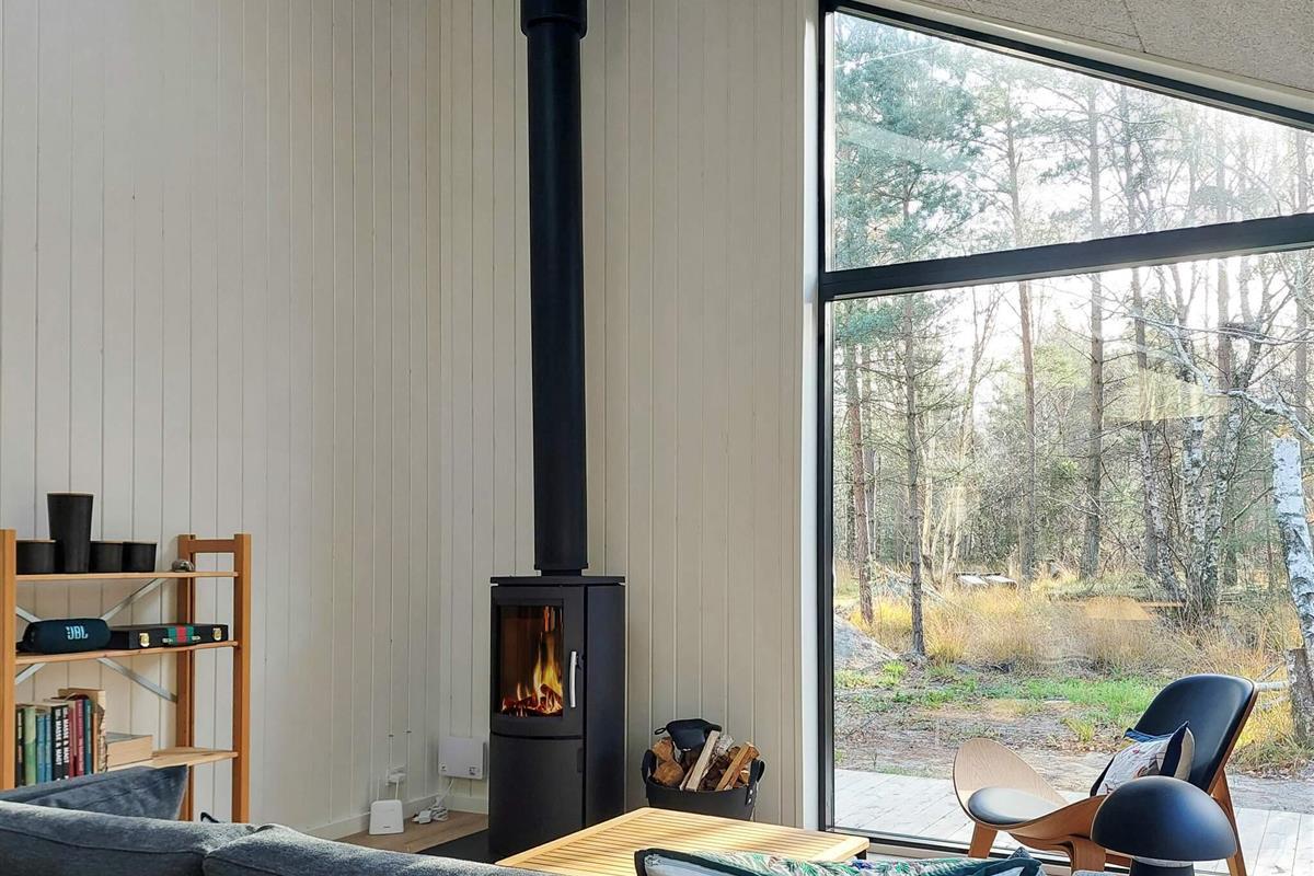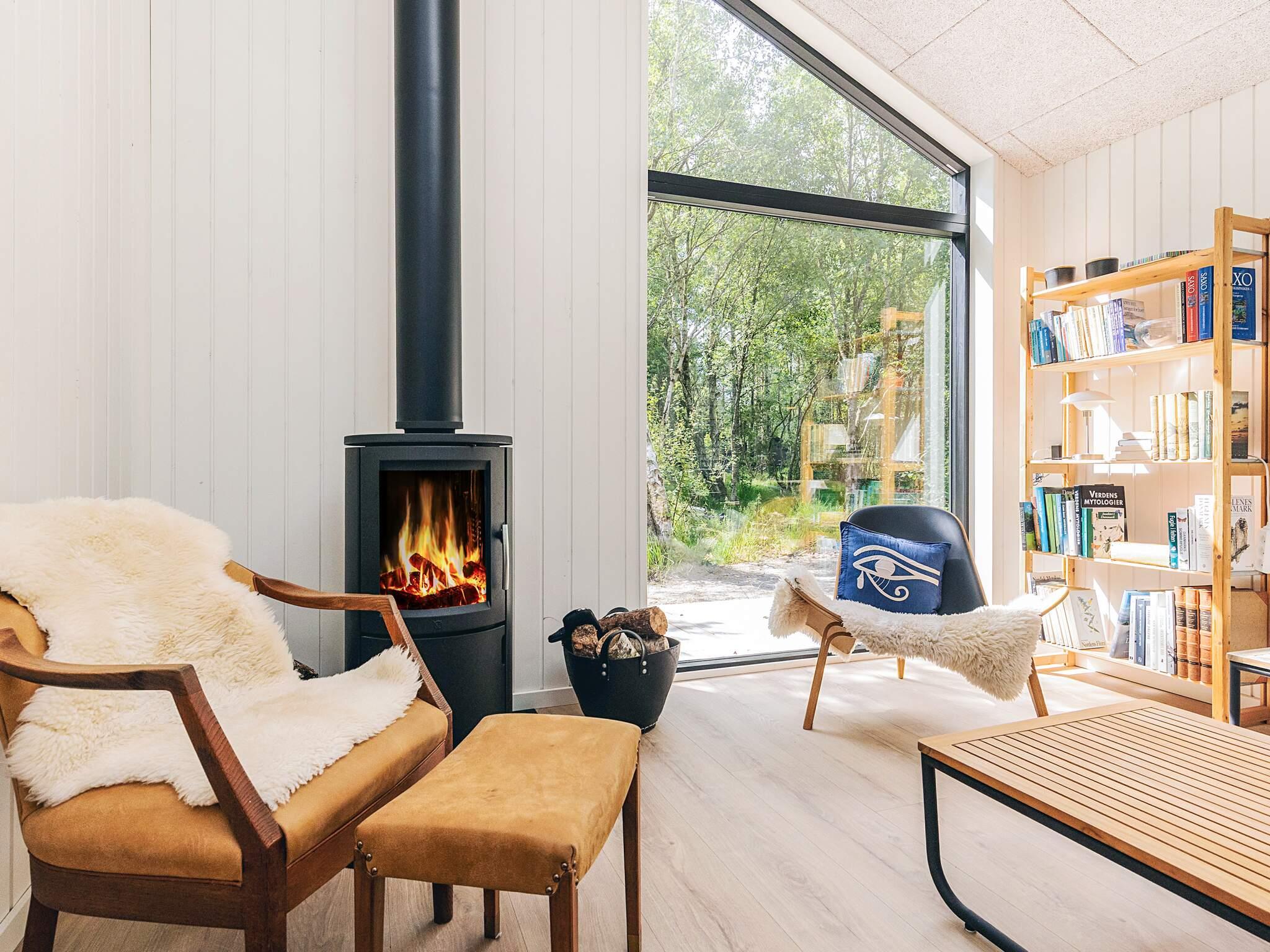 Das moderne Ferienhaus ist praktisch ausgestattet und geschmackvoll und durchdacht eingerichtet. Es besteht aus einem Wohnzimmer mit großen Fenstern, die für viel Licht sorgen. Der Wohnbereich verfügt über einen Holzofen, eine offene Küche mit angrenzendem Esszimmer, drei geräumige Schlafzimmer und ein Badezimmer mit komfortabler Fußbodenheizung. Es gibt außerdem einen gemütlichen Schlafboden mit Matratzen, auf den sich die älteren Kinder der Familie zurückziehen und Ruhe finden können.