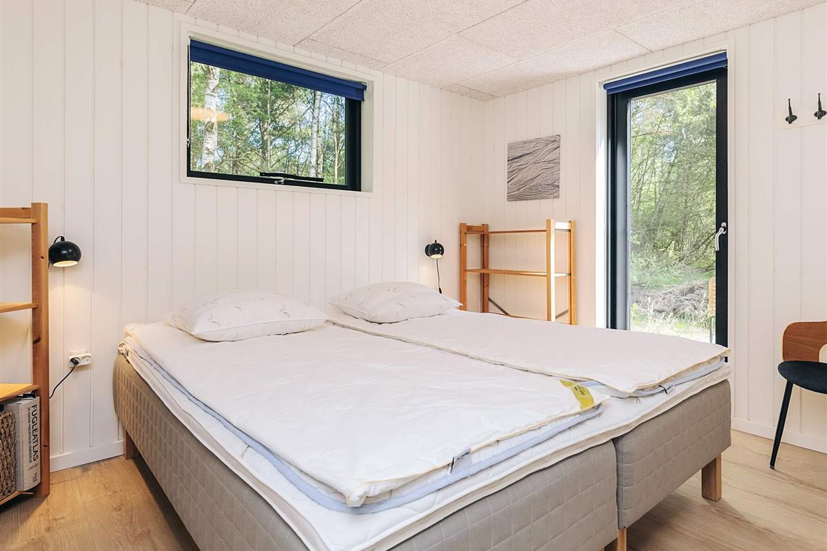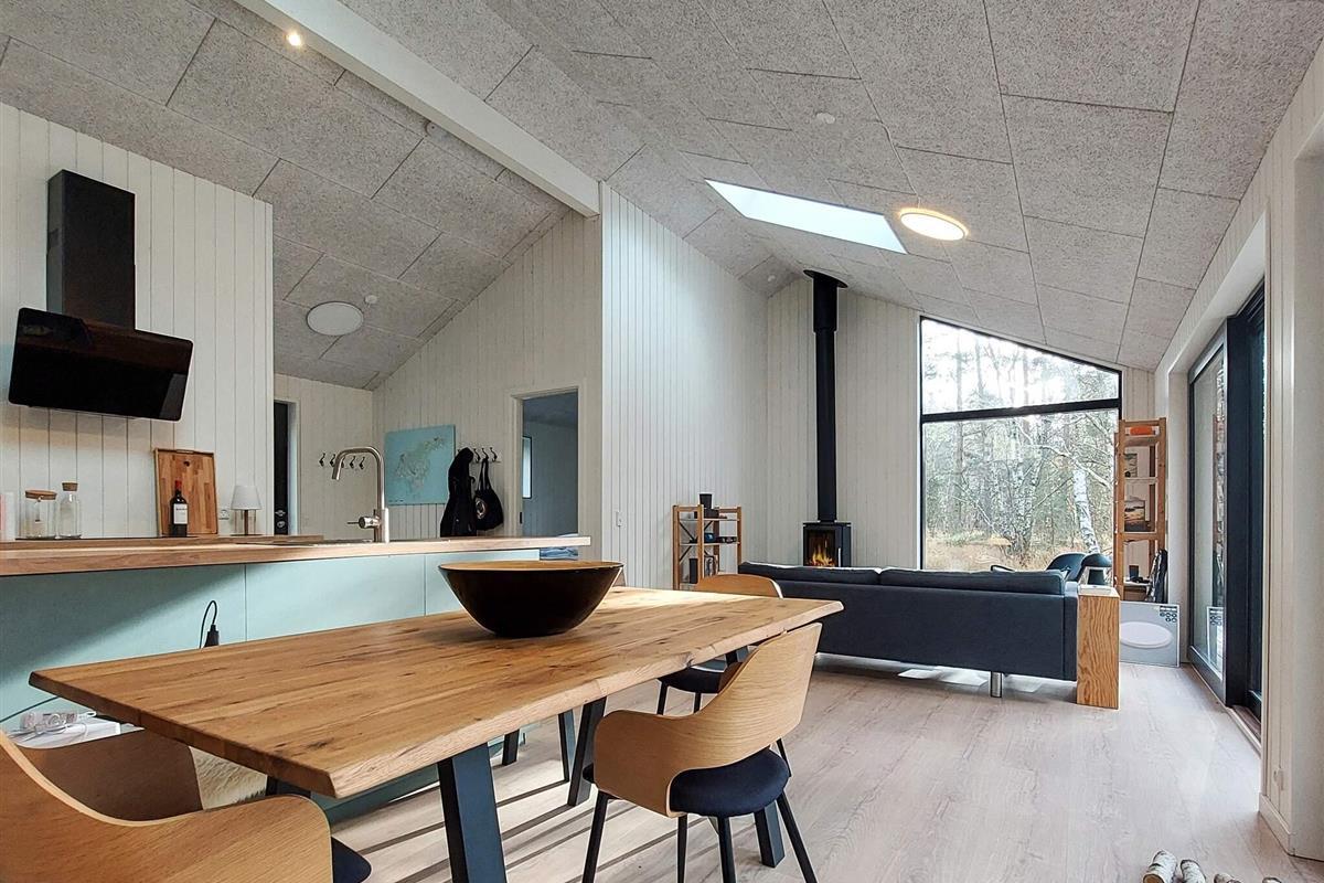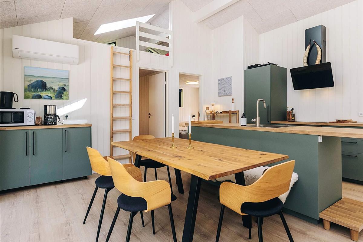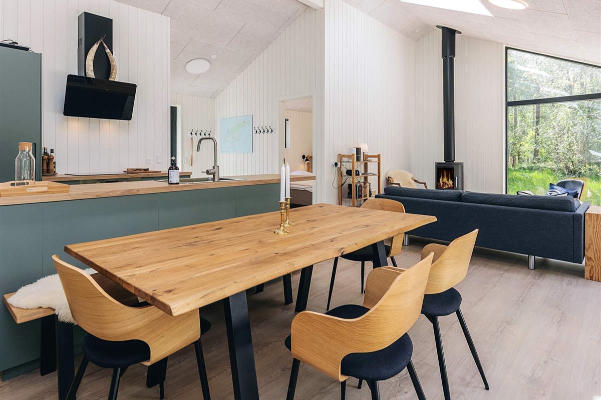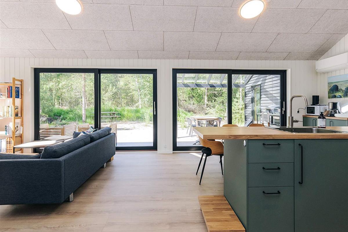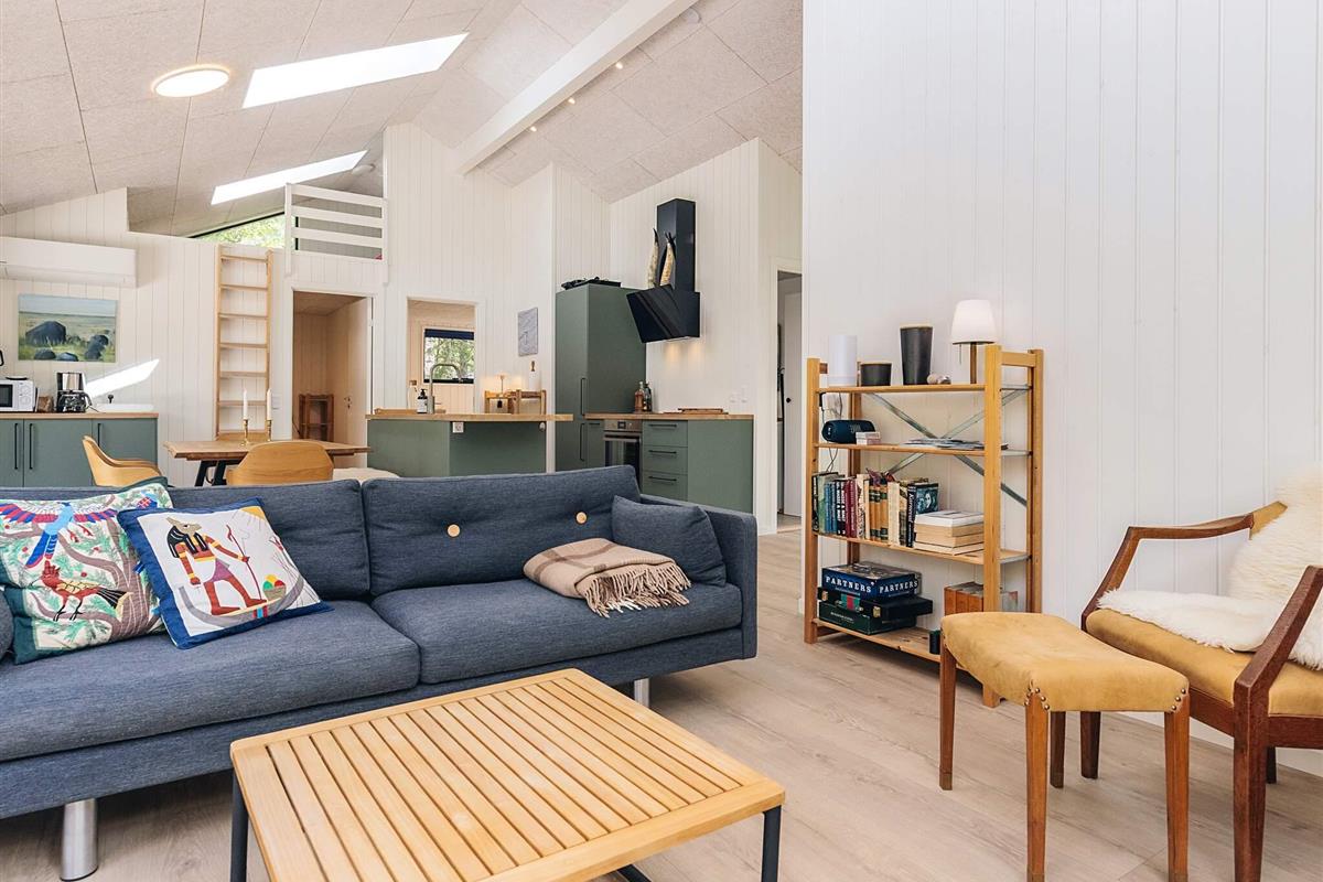 Das moderne Ferienhaus ist praktisch ausgestattet und geschmackvoll und durchdacht eingerichtet. Es besteht aus einem Wohnzimmer mit großen Fenstern, die für viel Licht sorgen. Der Wohnbereich verfügt über einen Holzofen, eine offene Küche mit angrenzendem Esszimmer, drei geräumige Schlafzimmer und ein Badezimmer mit komfortabler Fußbodenheizung. Es gibt außerdem einen gemütlichen Schlafboden mit Matratzen, auf den sich die älteren Kinder der Familie zurückziehen und Ruhe finden können.