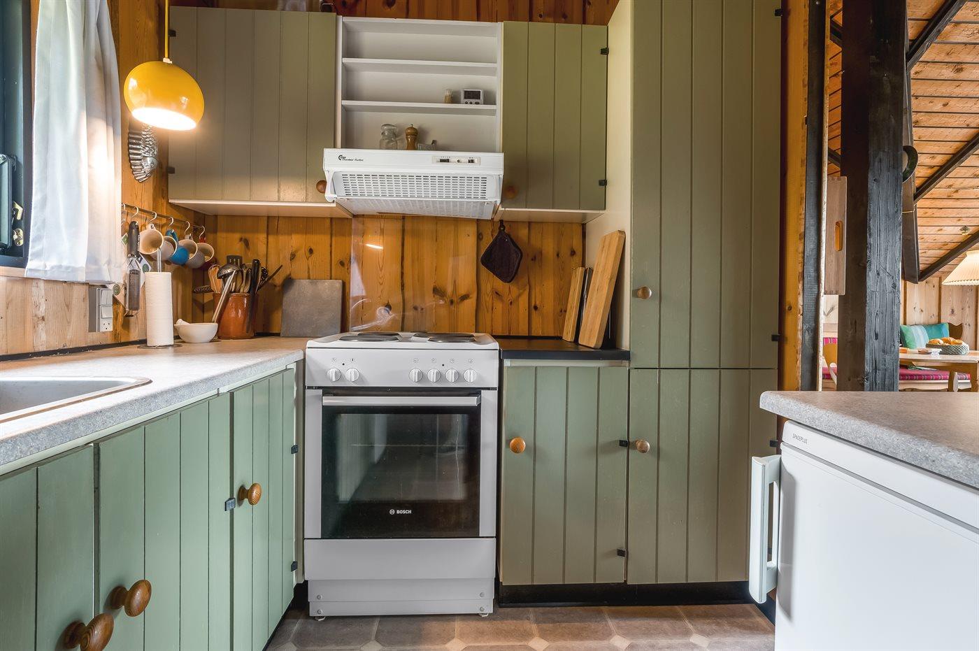 De keuken is uitgerust met koelkast Er is 4 elektrische kookplaten, heteluchtoven en vaatwasser.