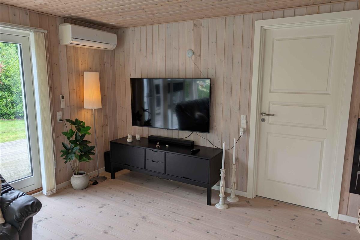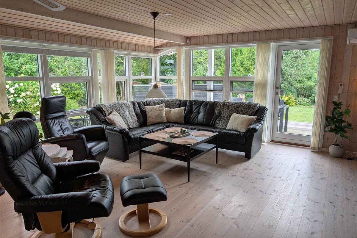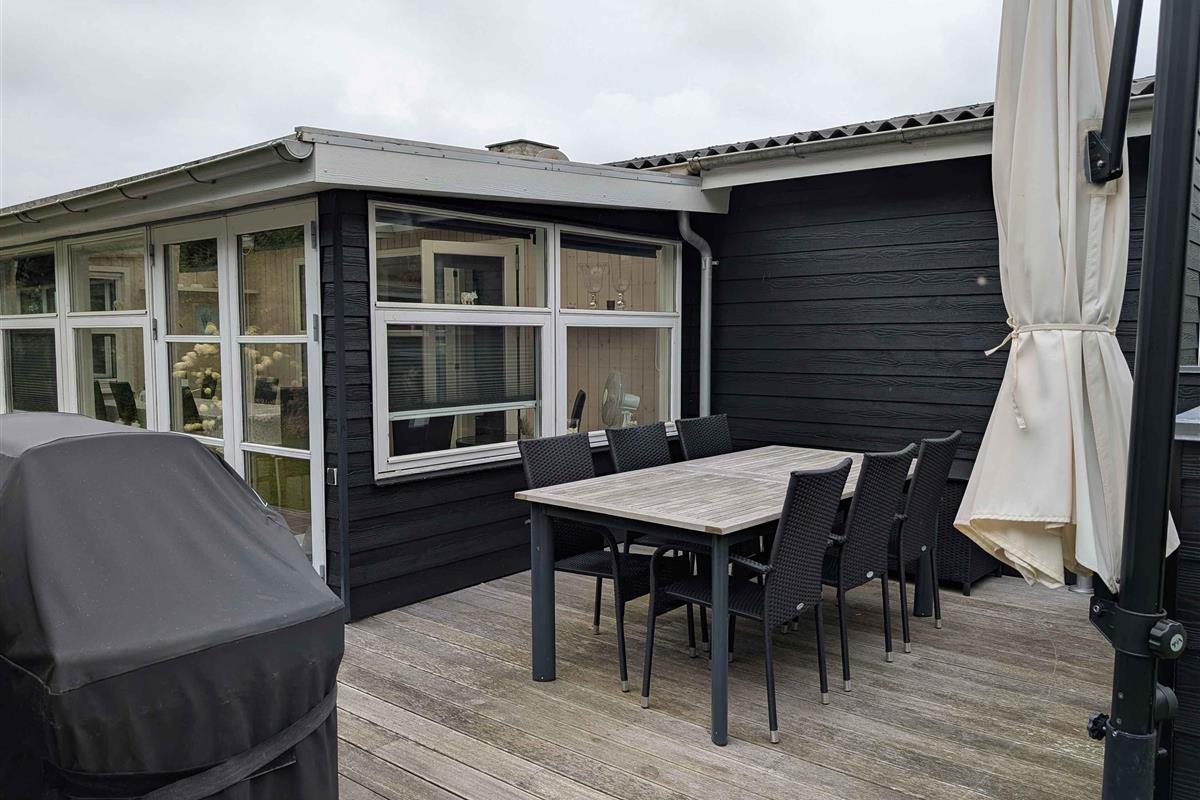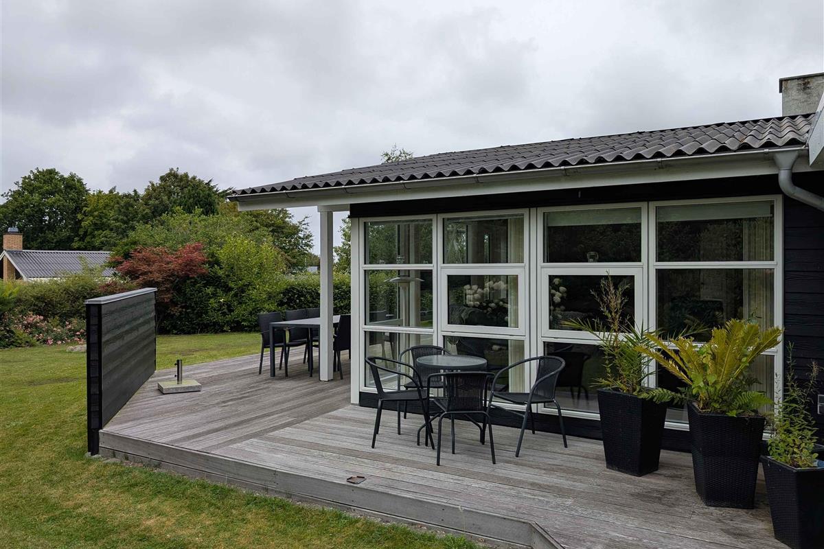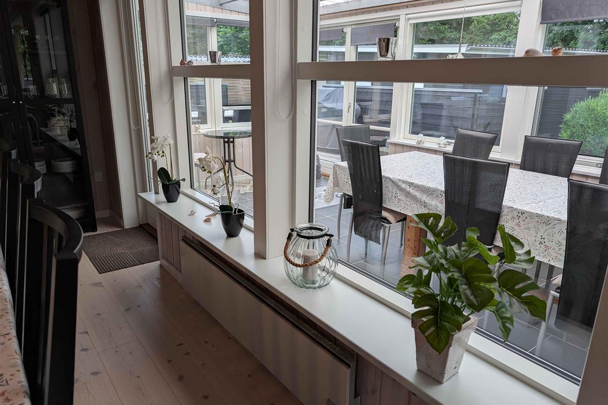 Mooi en ruim huis van 116 m² + 18 m² serre. 3 slaapkamers, stapelbedkamer, grote woonkeuken, nieuwe houtkachel (2025), badkamer, bijkeuken, omheinde tuin, terrassen, speelplaats, nabij Løgstør, golf en waterpark.