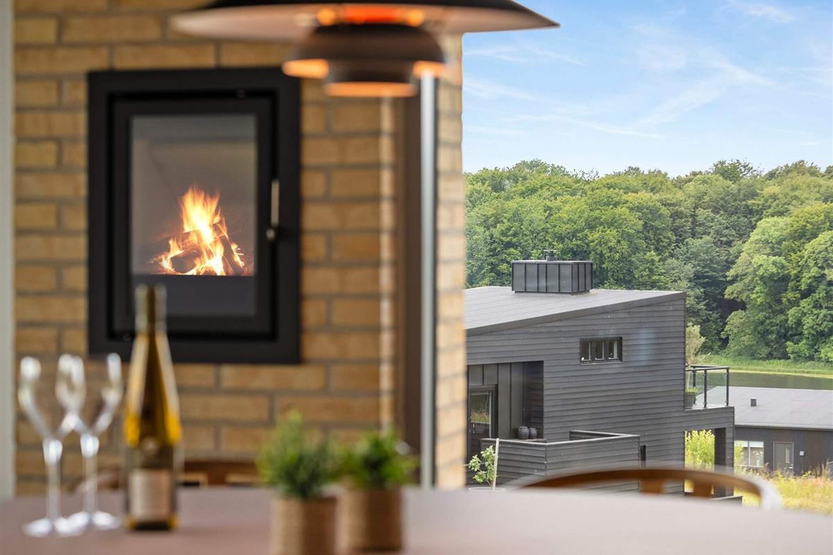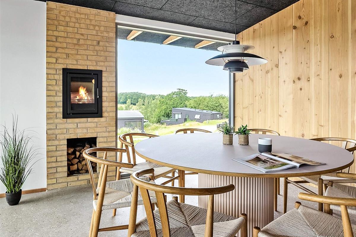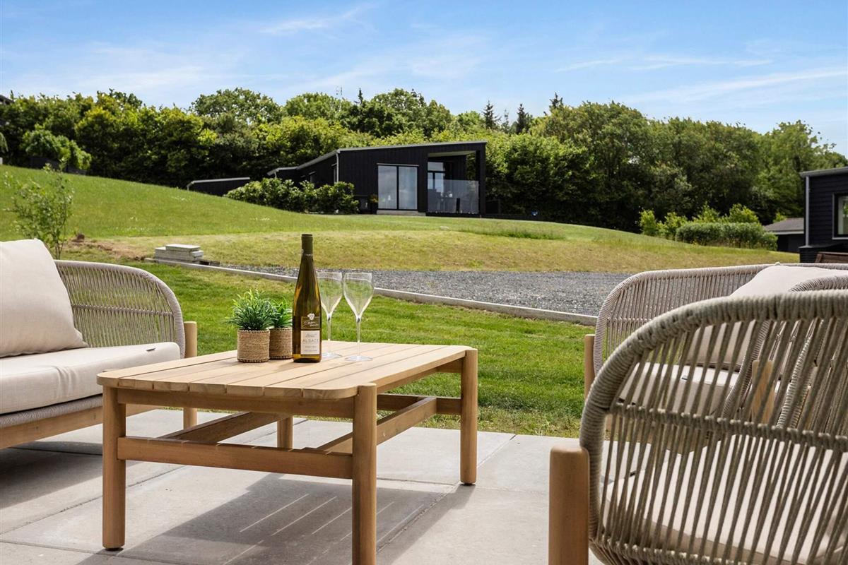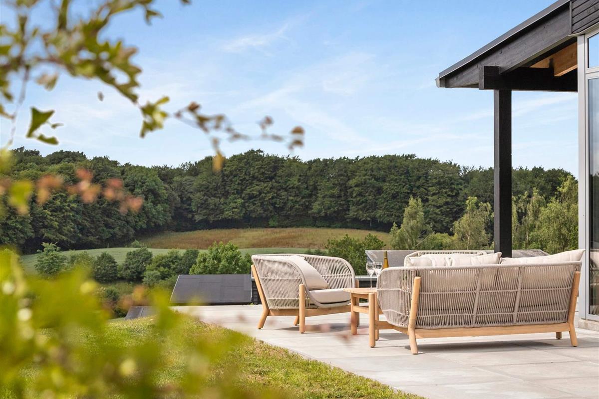 Fra alle rum er der direkte udgang til den omkringliggende grund og den store, delvist overdækkede terrasse, som løber hele vejen rundt om huset. Her kan I nyde solen fra morgen til aften, slappe af med en bog, spise måltider under åben himmel eller bare nyde stilheden og den smukke natur.