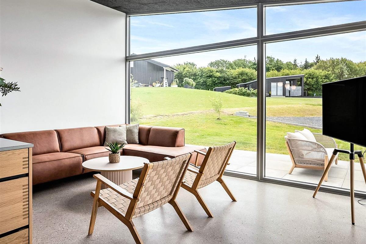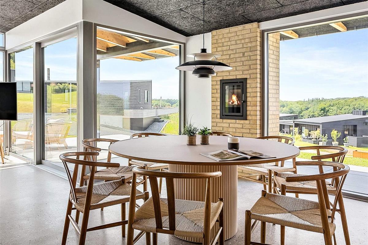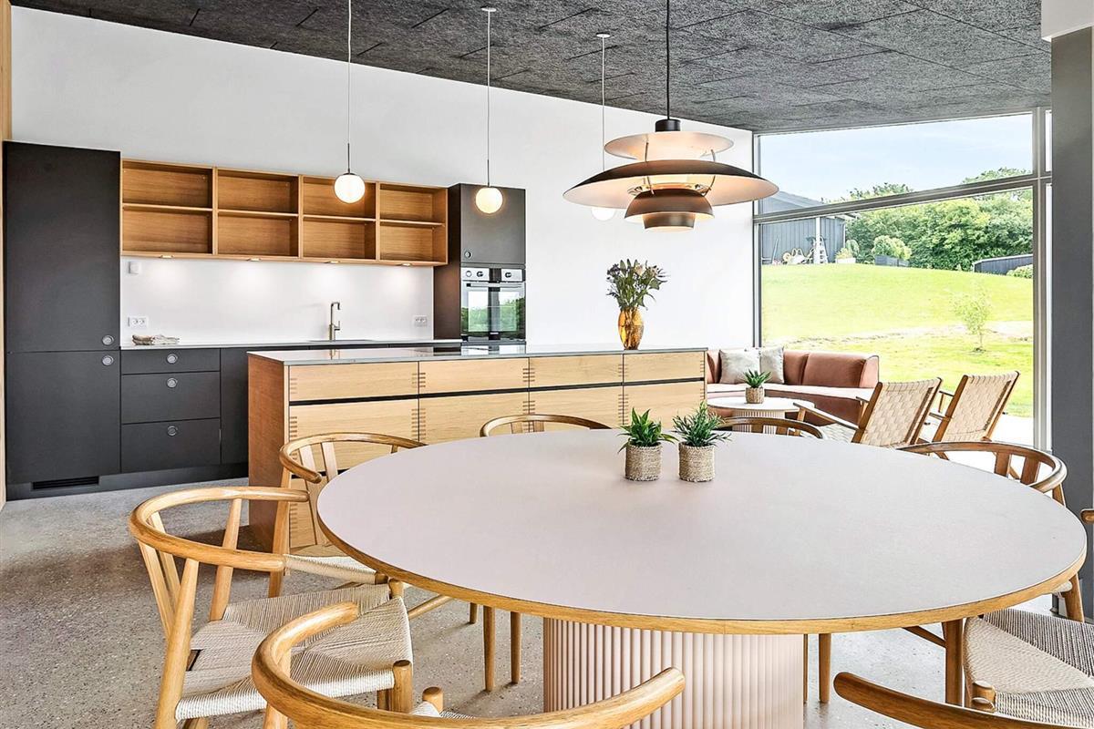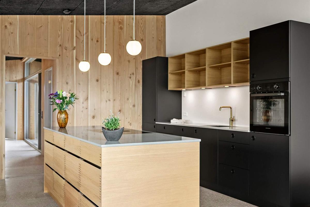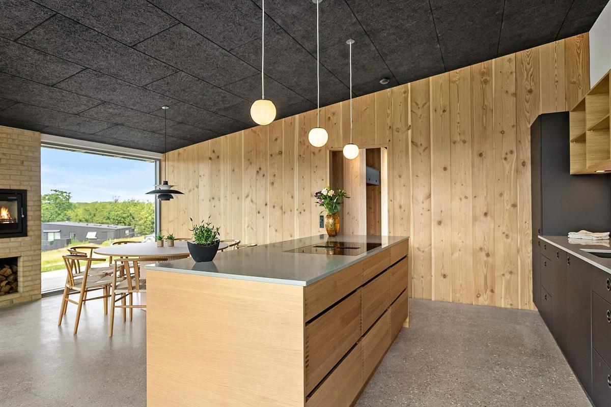 Indendørs mødes I af et lyst og stilrent feriehus med en gennemført materialestil. De polerede betongulve, vægge beklædt med brede douglasplanker og sorte Troldtekt-lofter skaber en eksklusiv og moderne stemning. De store vinduespartier lukker naturen og lyset helt ind og giver en fantastisk rumfornemmelse. Husets samlingspunkt er det elegante køkken i egetræ, som er fuldt udstyret og indbyder til både fælles madlavning og hyggelige stunder.
