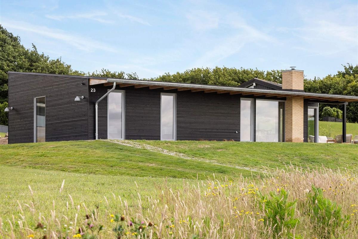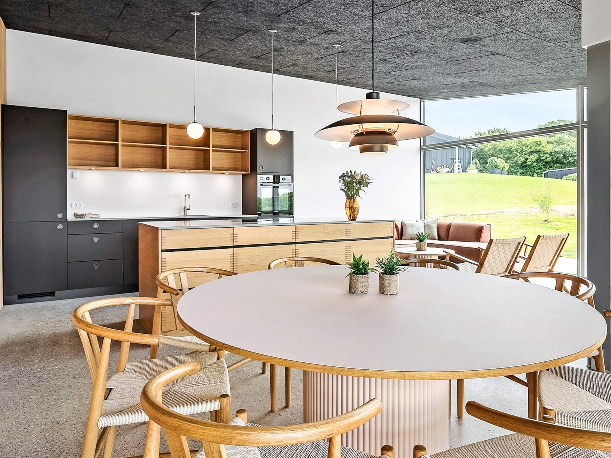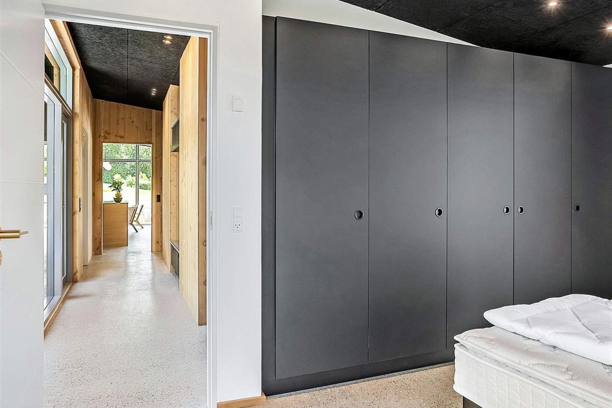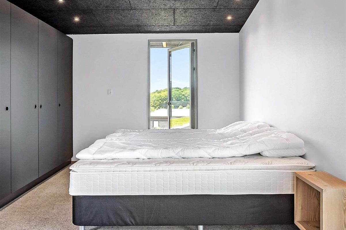 Indendørs mødes I af et lyst og stilrent feriehus med en gennemført materialestil. De polerede betongulve, vægge beklædt med brede douglasplanker og sorte Troldtekt-lofter skaber en eksklusiv og moderne stemning. De store vinduespartier lukker naturen og lyset helt ind og giver en fantastisk rumfornemmelse. Husets samlingspunkt er det elegante køkken i egetræ, som er fuldt udstyret og indbyder til både fælles madlavning og hyggelige stunder.
