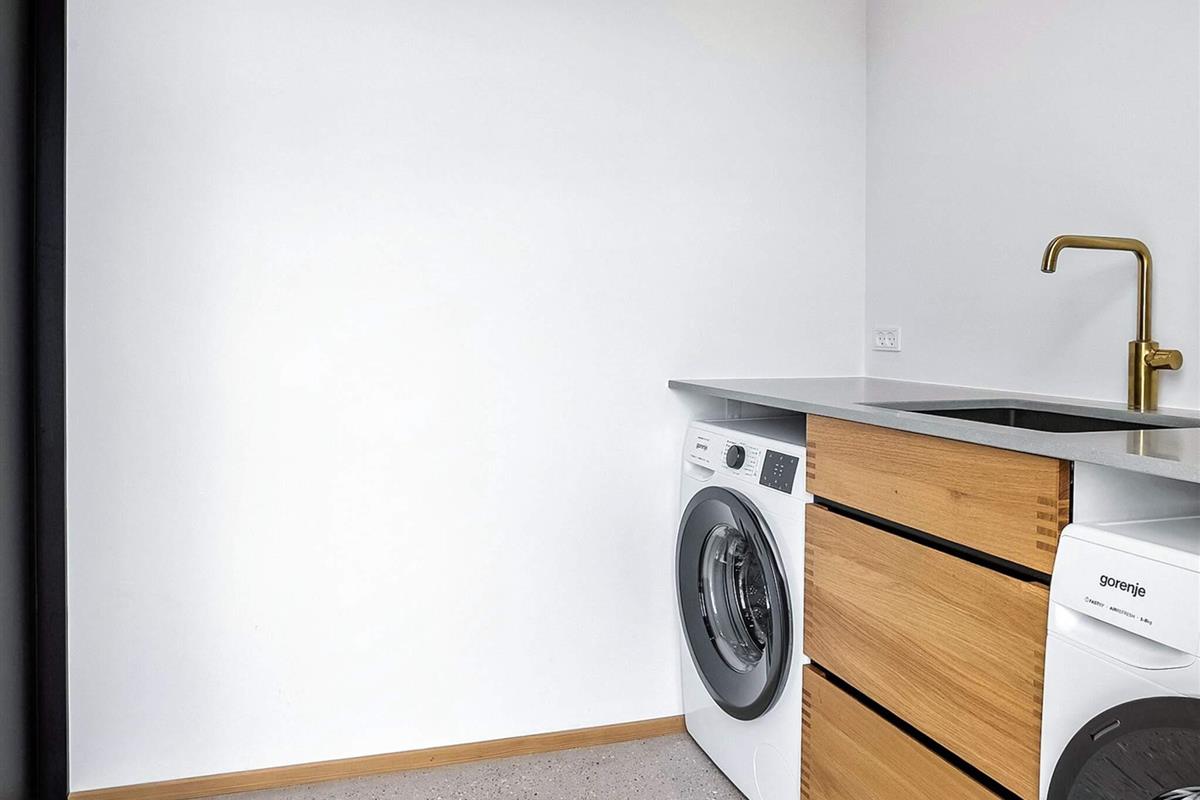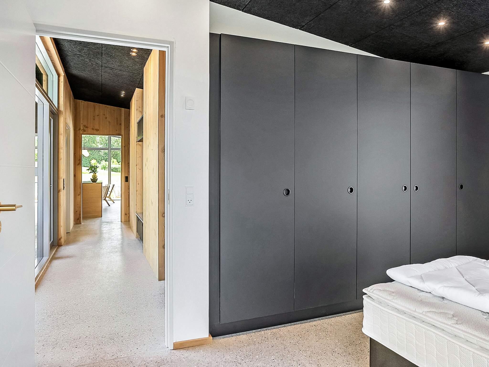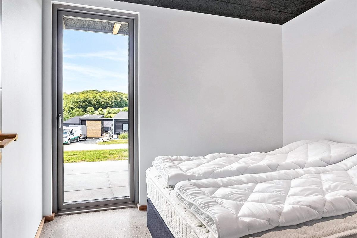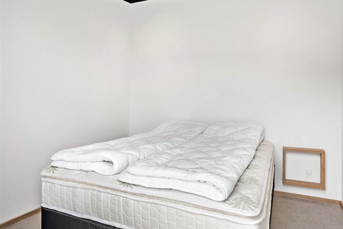 Indendørs mødes I af et lyst og stilrent feriehus med en gennemført materialestil. De polerede betongulve, vægge beklædt med brede douglasplanker og sorte Troldtekt-lofter skaber en eksklusiv og moderne stemning. De store vinduespartier lukker naturen og lyset helt ind og giver en fantastisk rumfornemmelse. Husets samlingspunkt er det elegante køkken i egetræ, som er fuldt udstyret og indbyder til både fælles madlavning og hyggelige stunder.