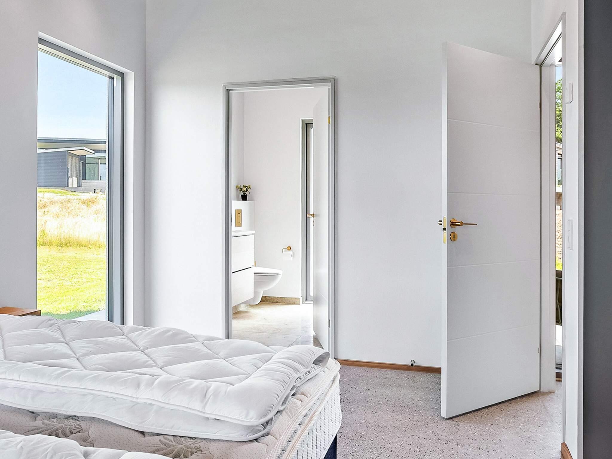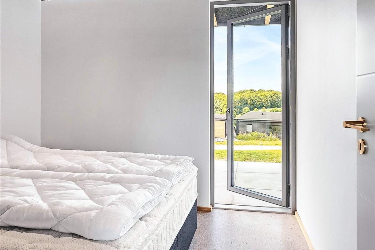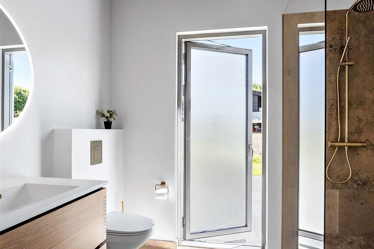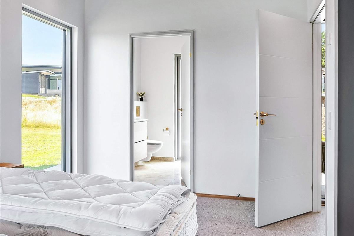 Huset rummer fire gode soveværelser og to lækre badeværelser – heraf ét med direkte adgang fra det ene værelse. Badeværelserne er indrettet med flotte naturgranitfliser, væghængte toiletter og stilfulde løsninger. Overalt i huset er der behagelig gulvvarme.