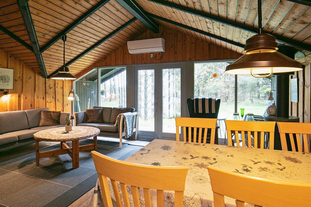 Das Ferienhaus hat einen offenen Küchen-/Essbereich für das Familienleben. Die schönen Holzwände des Hauses tragen maßgeblich zur Gemütlichkeit im Haus bei. Es gibt eine energieeffiziente Wärmepumpe im Haus. Zudem spendet im Wohnbereich der Holzofen bei Bedarf mollige Wärme.