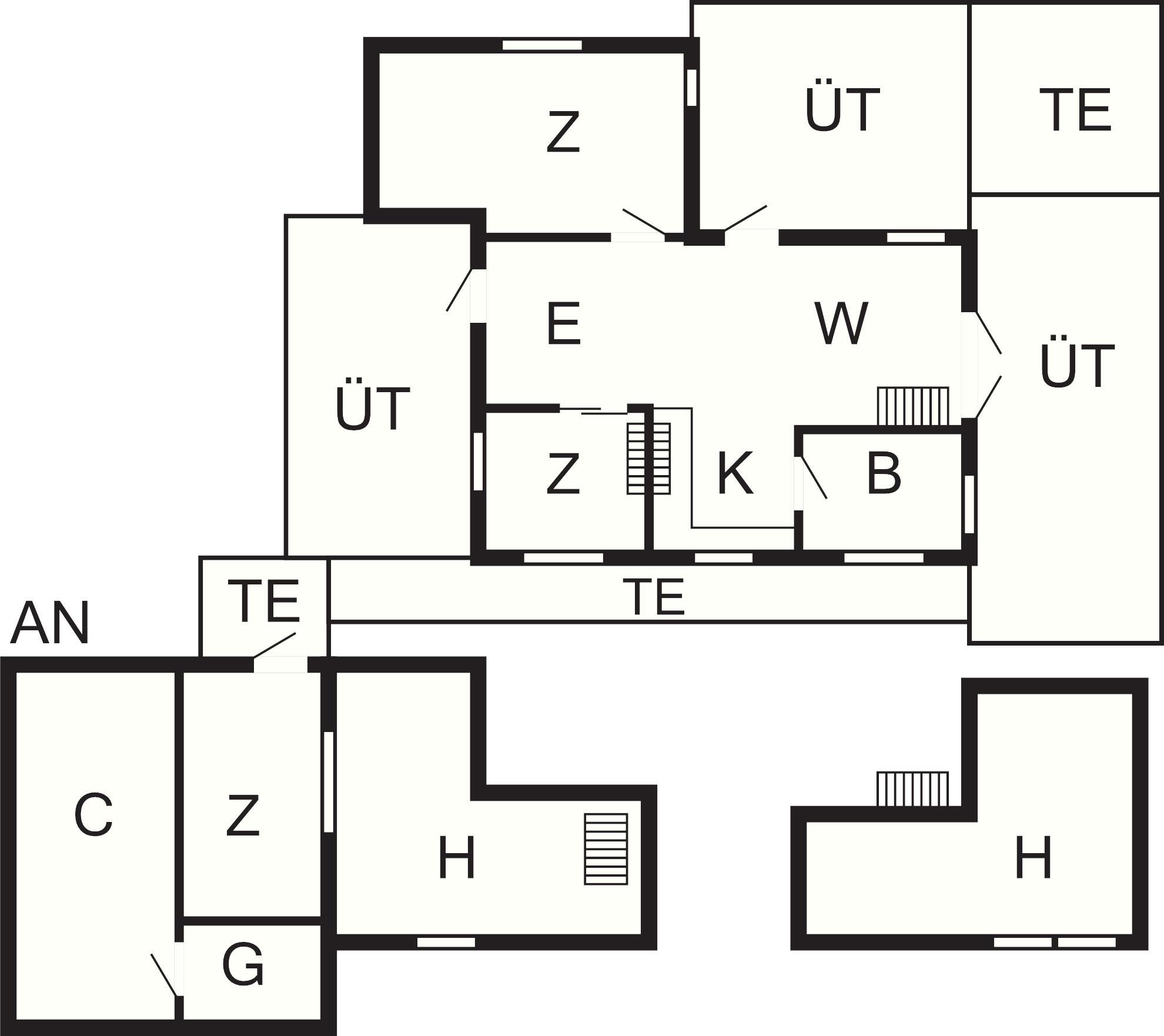 Off. Küche: E-Herd, Kühl-Gefrier-Kombi, Mikrow., Abzugsh., Kaffeem., Spülm.
