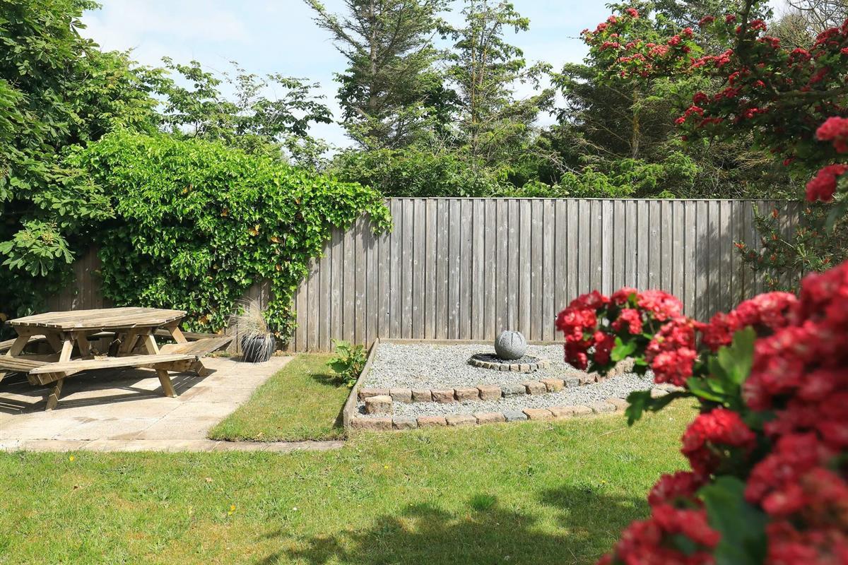 Auf der Terrasse des Ferienhauses gibt es wahlweise die Möglichkeit, einen Platz in der Sonne oder im Schatten zu finden. Das Haus ist von einem schönen Gartengrundstück umgeben, das zu Spiel und Spaß im Freien zulässt.
