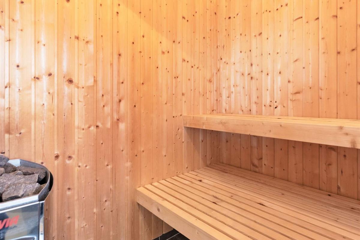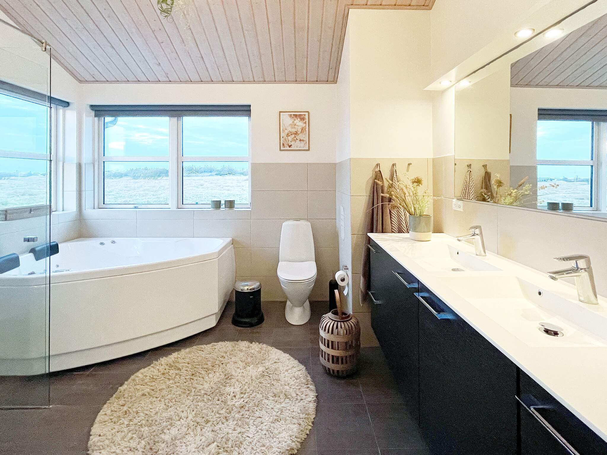 Das Ferienhaus hat einen offenen Küchen-/Wohnbereich für das Familienleben sowie vier Schlafzimmer mit Doppelbetten und einen Hems. Außerdem Badezimmer mit Whirlpool, Dusche und Zugang zur Sauna und Gäste-WC mit Dusche. Es gibt durchgehende Fußbodenheizung. Die Ausstattung mit zwei Schlafzimmern und einem Bad an je einem Ende des Hauses ist ideal für einen Aufenthalt mit zwei Familien.