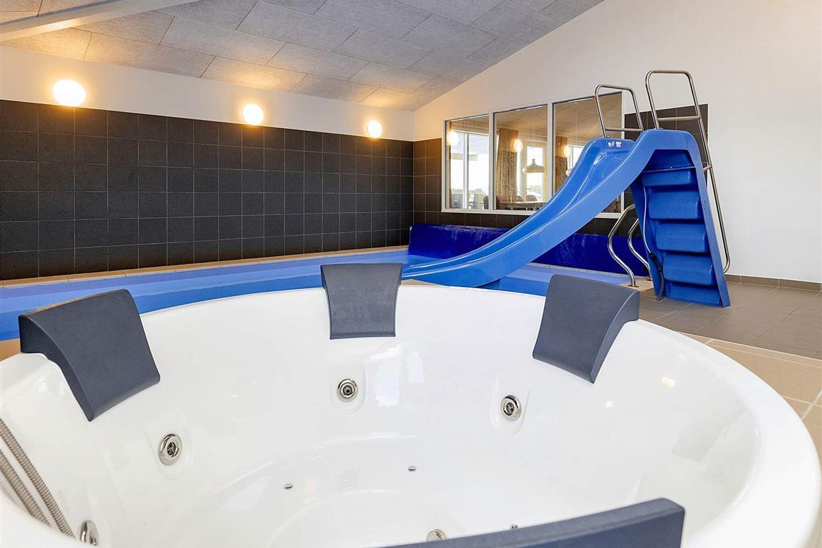 Das Ferienhaus hat einen hauseigenen Poolbereich mit einem großen Swimmingpool, einer Sauna und einem Whirlpool für 4-6 Personen. Der Pool verfügt über eine Wasserrutsche und ist ein großer Spaß für die Kinder.