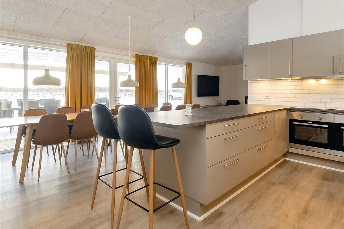 Den Mittelpunkt des Ferienhauses bildet der geräumige Wohnbereich mit guter Akustik und offener Verbindung zur gut ausgestatteten Küche. Hier ist Platz für alle, um gemeinsam zu kochen, zu essen, zu spielen oder einen guten Film zu sehen. Der Raum hat mehrere Fenster, sodass viel Tageslicht eindringen kann. Davor liegt die Terrassenfläche.