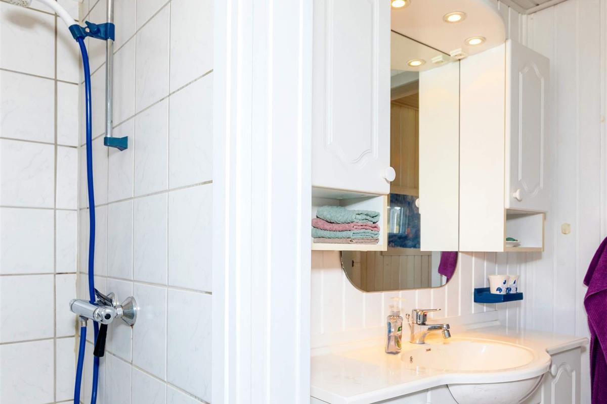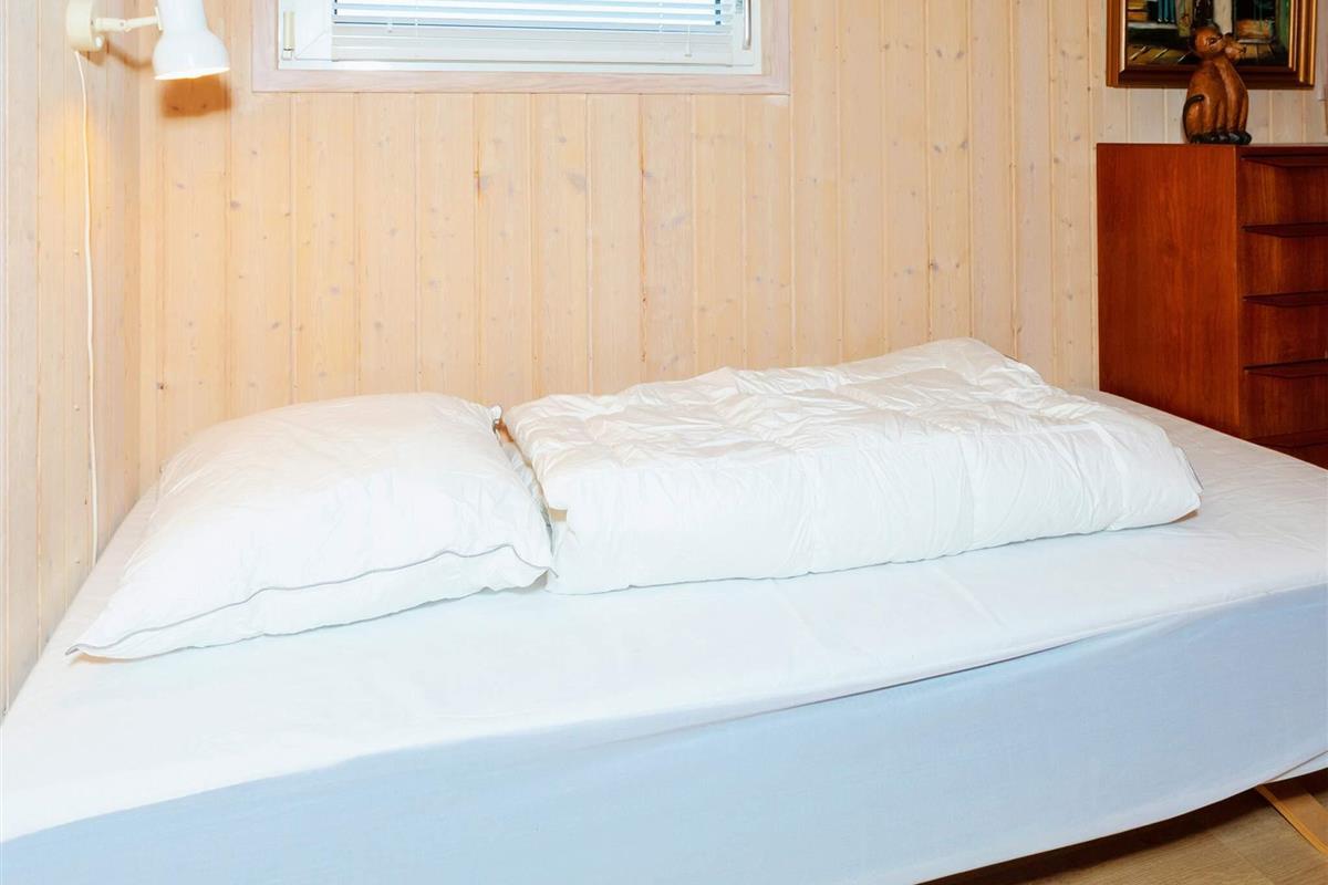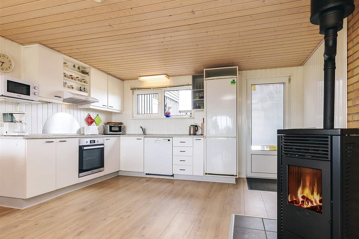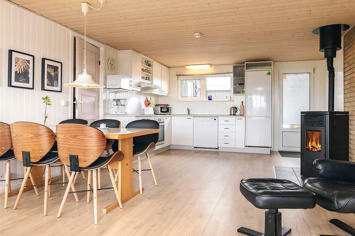 Im Inneren des Ferienhauses befindet sich ein offener Wohnraum, der mit der Küche verbunden ist und direkten Zugang zur Terrasse bietet. Das Badezimmer ist mit einer Dusche und einer Waschmaschine ausgestattet. Es gibt zwei Schlafzimmer sowie eine verglaste Veranda, auf der Sie Sommerabende länger genießen können. Für Familien mit Kleinkindern steht ein Kinderbett zur Verfügung.