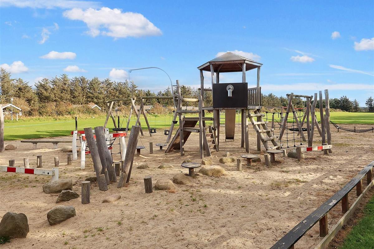 Die Hütten haben einen großen Fensterabschnitt am westlichen Ende der Hütte, was sie sehr hell und einladend macht. Die Terrasse, von der aus man Blick auf den Spielplatz, das Hüpfkissen und das Ballfeld hat, ist vollständig überdacht.