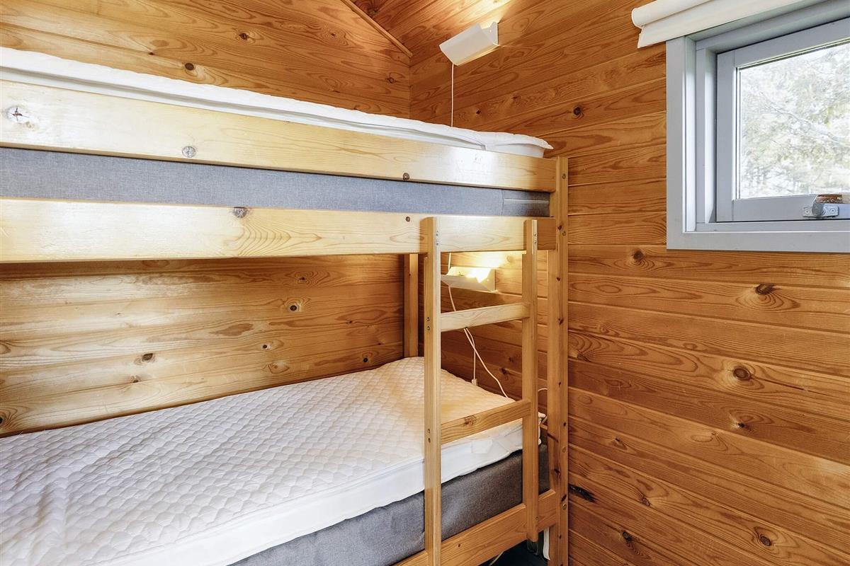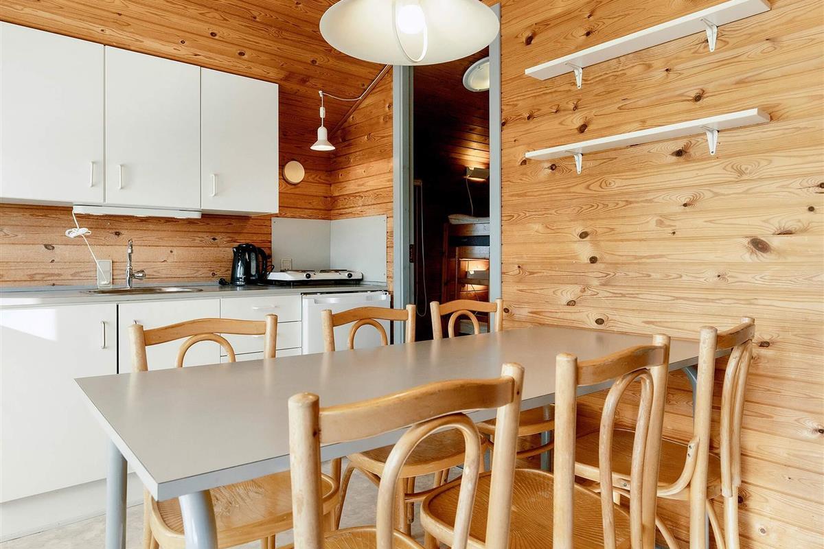 Die Hütten haben 2 Schlafzimmer mit jeweils einem Etagenbett (mit neuen Matratzen von 2023) und einem Kleiderschrank. Dazu gibt es im Wohnzimmer ein Schlafsofa. Es gibt Tische und Stühle, sowohl drinnen als auch draußen. In jeder Hütte gibt es 5 Bettdecken und 5 Kissen und es gibt auch Geschirr und Besteck sowie eine Kaffeemaschine, einen Wasserkocher, ein Kochfeld, einen Kühlschrank und eine Spüle mit kaltem Wasser. Die Hütte wird mit einem elektrischen Heizkörper beheizt.
