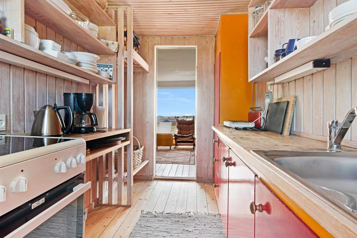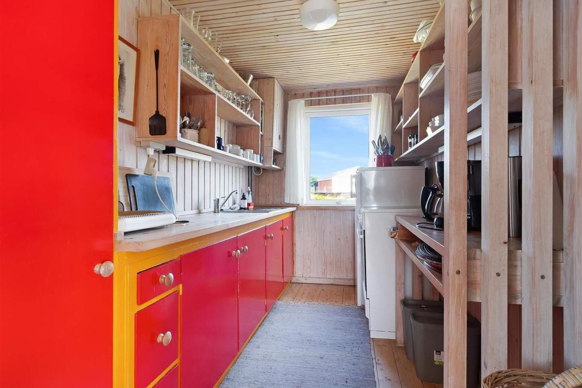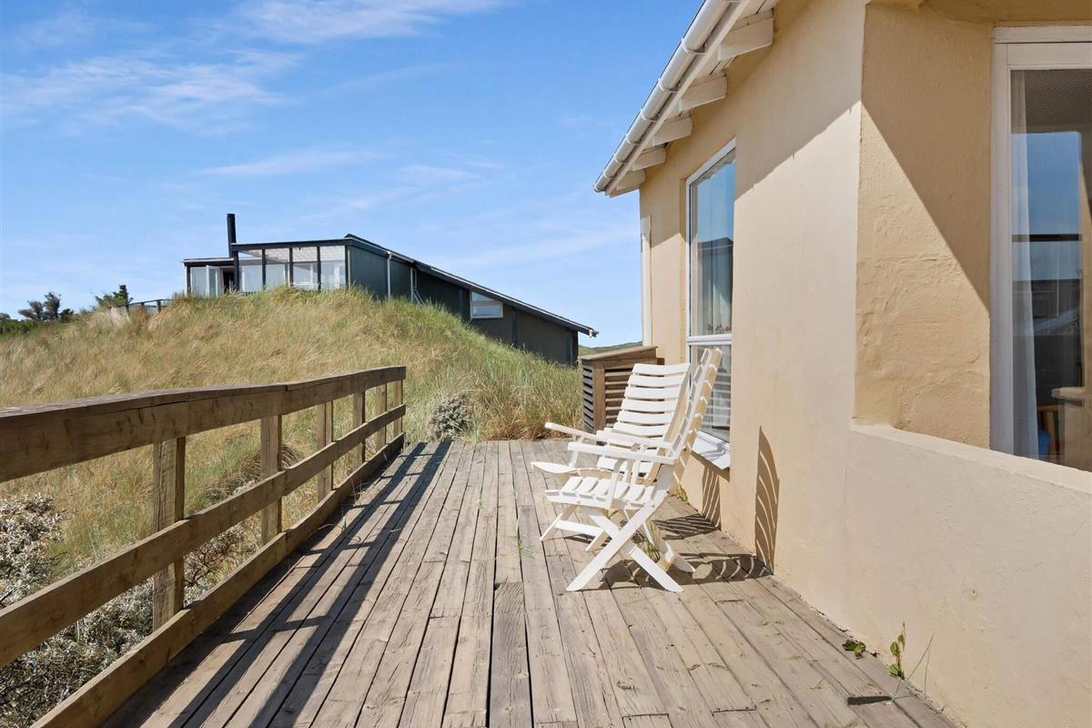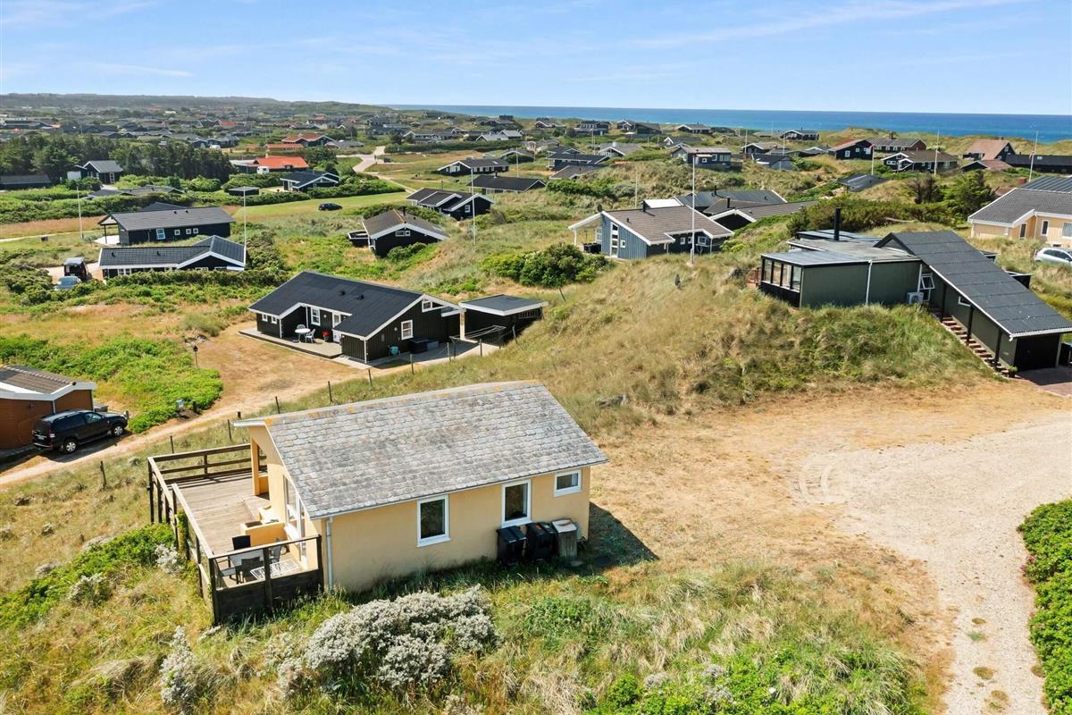 Dieses hübsche Ferienhaus ist kein modernes Monster, sondern ein echtes Cottage mit Platz für 5 Leute in 3 Schlafzimmern. Es ist ein traditionelles und echt gemütliches Haus, und wie gesagt, die Aussicht ist einfach beeindruckend, und die Lage ist nah an der Stadt und am Strand. Neben den drei Schlafzimmern sind auch die anderen Räume super gemütlich – Küche, Wohnzimmer/Familienzimmer und Toilette mit Dusche. Es gibt eine Terrasse, die fast um das ganze Haus herumgeht, wo du die tolle Natur der Jomfru-Hügel genießen kannst.