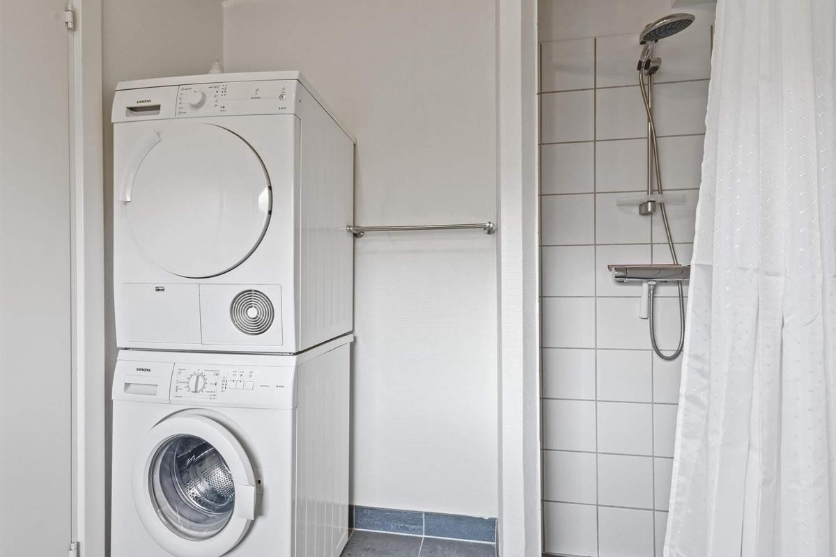 Attraktives Ferienhaus mit 2 Ebenen. Das Reihenhaus hat eine schöne Eingangsdiele mit Treppe nach oben. Weiter geht es durch den Flur im Parterre zum Badezimmer mit Waschmaschine und Trockner führt. Vom Fur aus gelangt man zudem in die helle Wohnküche, und weiter hinaus zur Terrasse und Liegewiese. Oben im Dachgeschoss befinden sich zwei Schlafzimmer, beide mit Zugang zum schönen Balkon mit Aussicht zum Bolzplatz der Gegend. Außerdem hat man oben Zugang zu einem Dachboden mit zwei Matratzen.