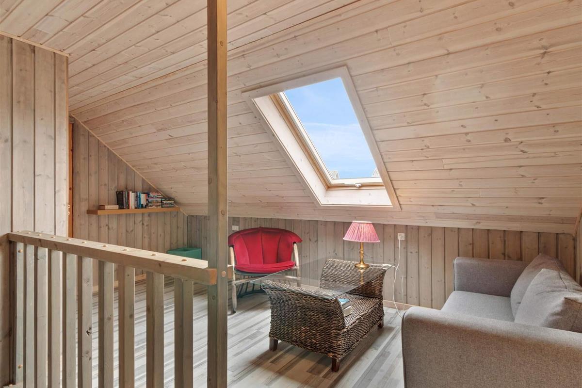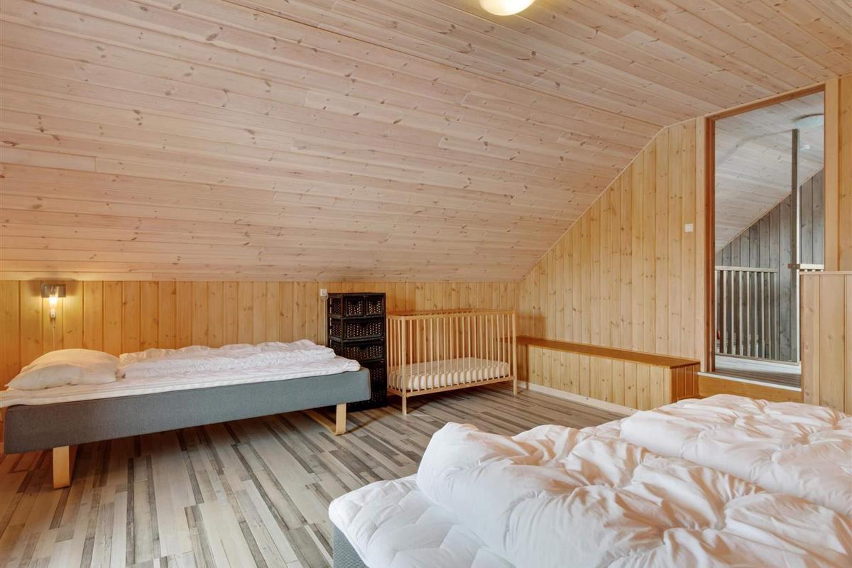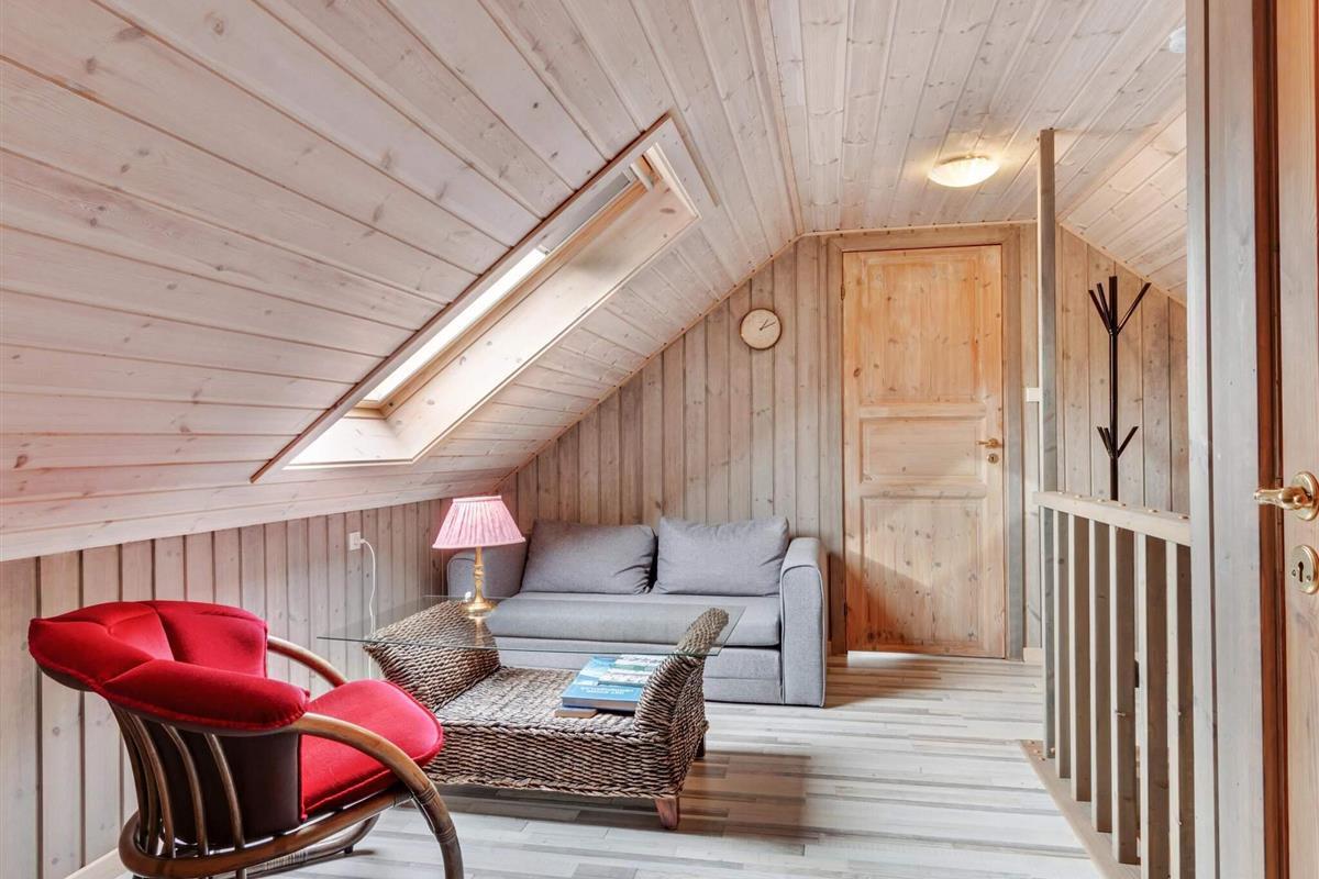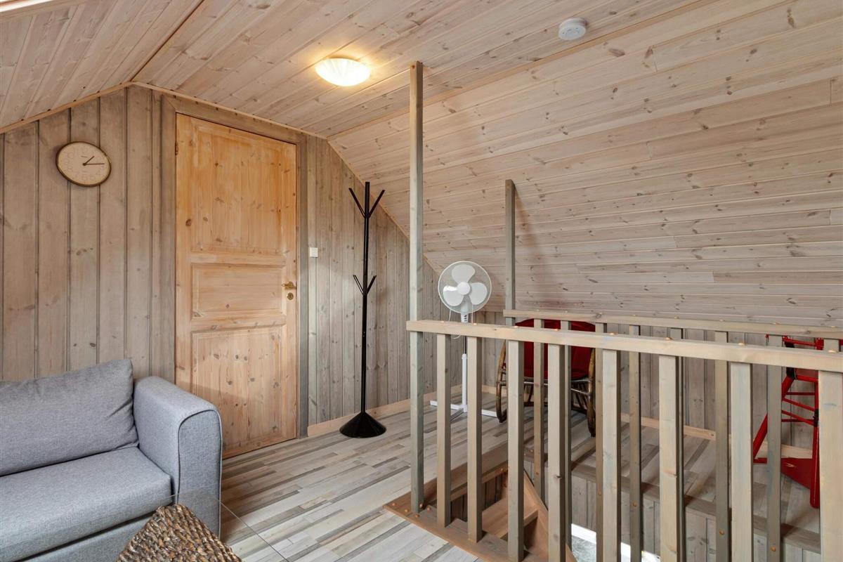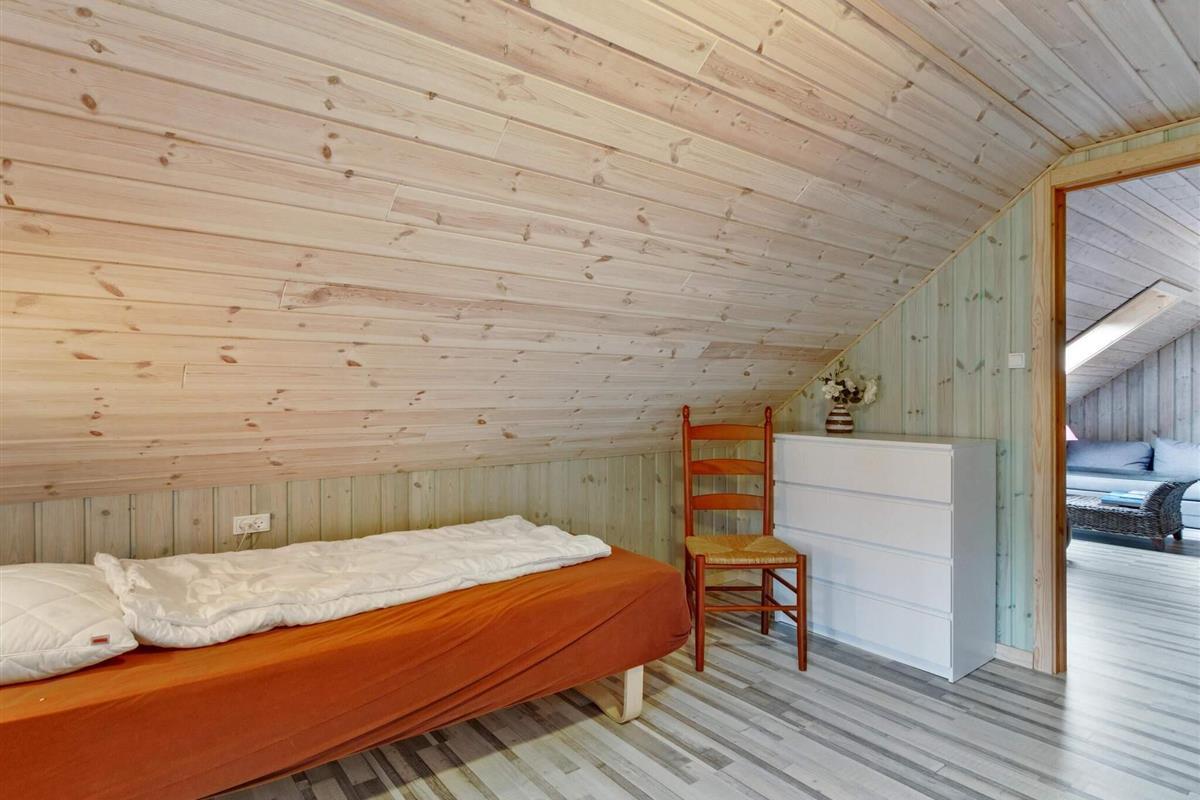 Im ersten Stock gibt's drei charmante Schlafzimmer mit schrägen Wänden, die dem Raum eine gemütliche Note verleihen. Diese Zimmer bieten verschiedene Bettenkonfigurationen, darunter ein Doppelbett, ein Einzelbett und ein Kinderbett in einem Zimmer, ein 1,5-Personen-Bett in einem anderen und ein Doppelbett mit einem Einzelbett im dritten. Darüber hinaus verfügt das Haus über einen Aktivitätsraum im Außenbereich, der sich perfekt für Kinder oder jüngere Gäste eignet. Der Aktivitätsraum ist mit zwei Etagenbetten ausgestattet und somit ideal, um Kontakte zu knüpfen und Spaß zu haben, ohne die Erwachsenen im Haupthaus zu stören.