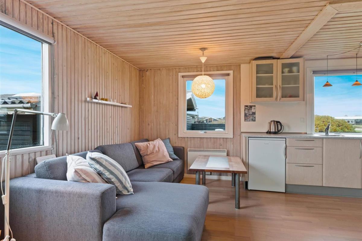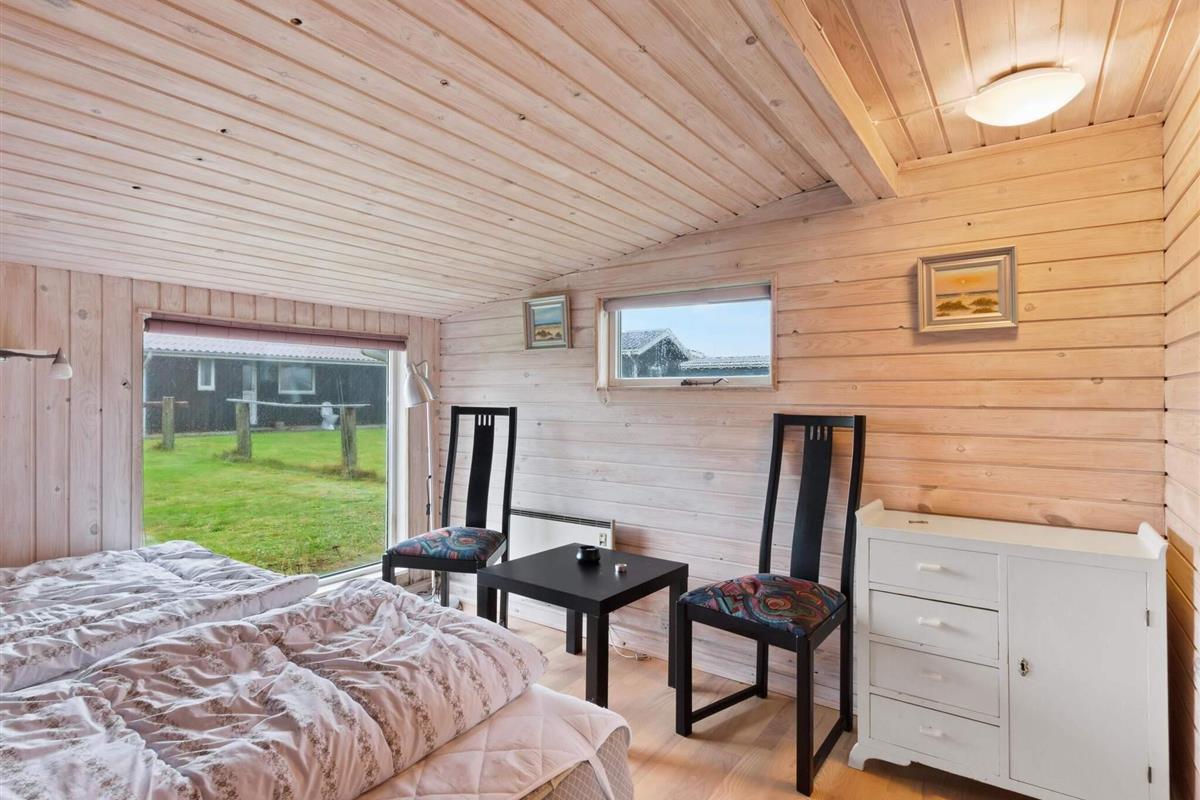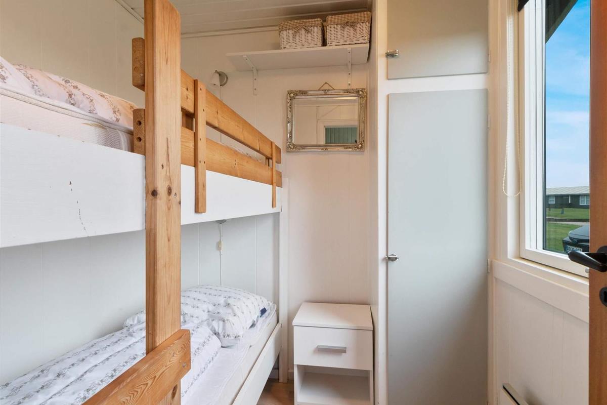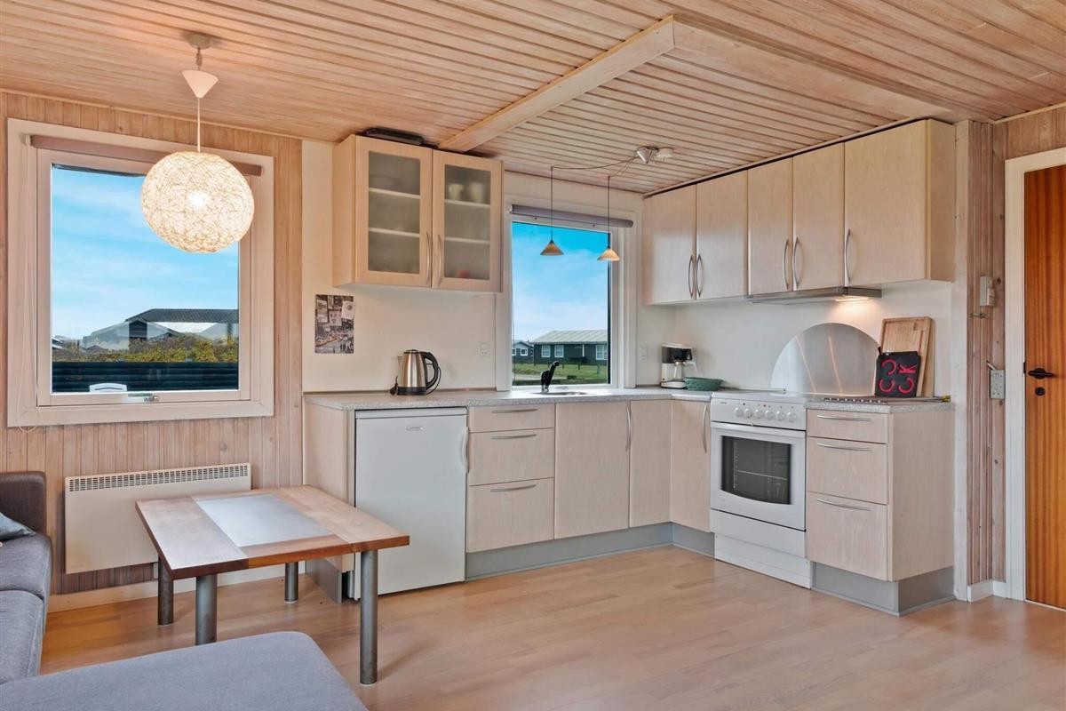Gemütliches Ferienhäuschen mit 40 m² Wohnfläche, mit zwei Schlafzimmern, WC und Wohnküche + 33 m² Garage mit einem Schlafzimmer und dem Badezimmer des Hauses. Das Wohnzimmer ist hell und verfügt über einen Holzofen und Zugang zum Wintergarten/zur überdachten Terrasse. Die Küche ist schön hell und liegt in offener Verbindung zum Wohnzimmer.