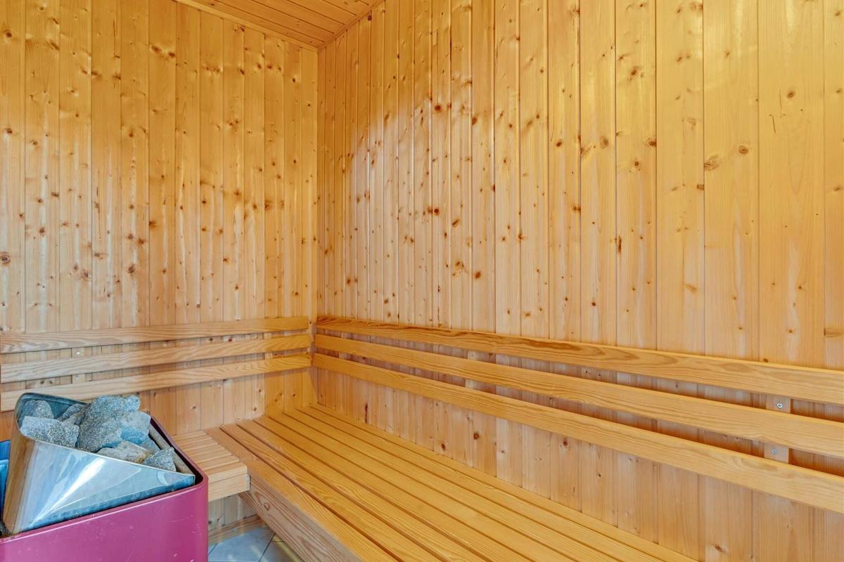 Im Haus gibt es gleich zwei Badezimmer, eines davon mit Sauna und Whirlpool, dazu drei Schlafzimmer und eine große, helle Wohnküche. Hier herrscht echte Ferienhausatmosphäre mit u.a. dem gemütlichen Essbereich und der schönen Sitzecke mit Kamin und Blick nach draußen ins Grüne. Oben unter dem Dach findet man den Hems, auf den sich die Kinder zurückziehen können.