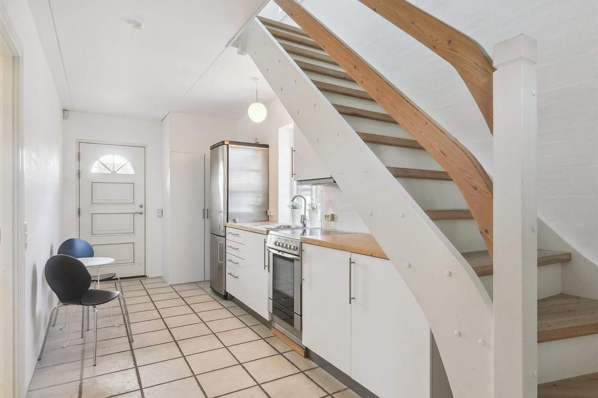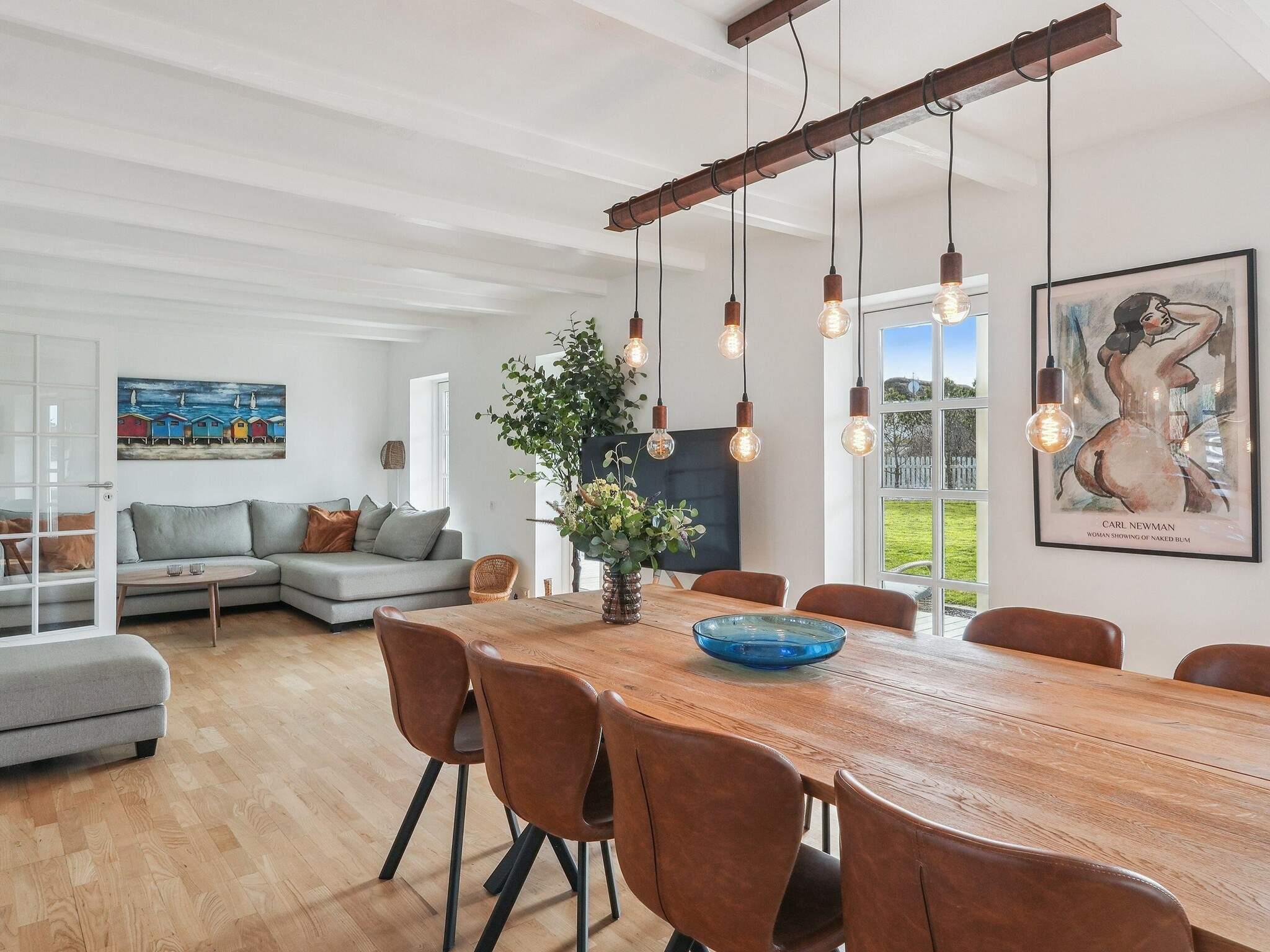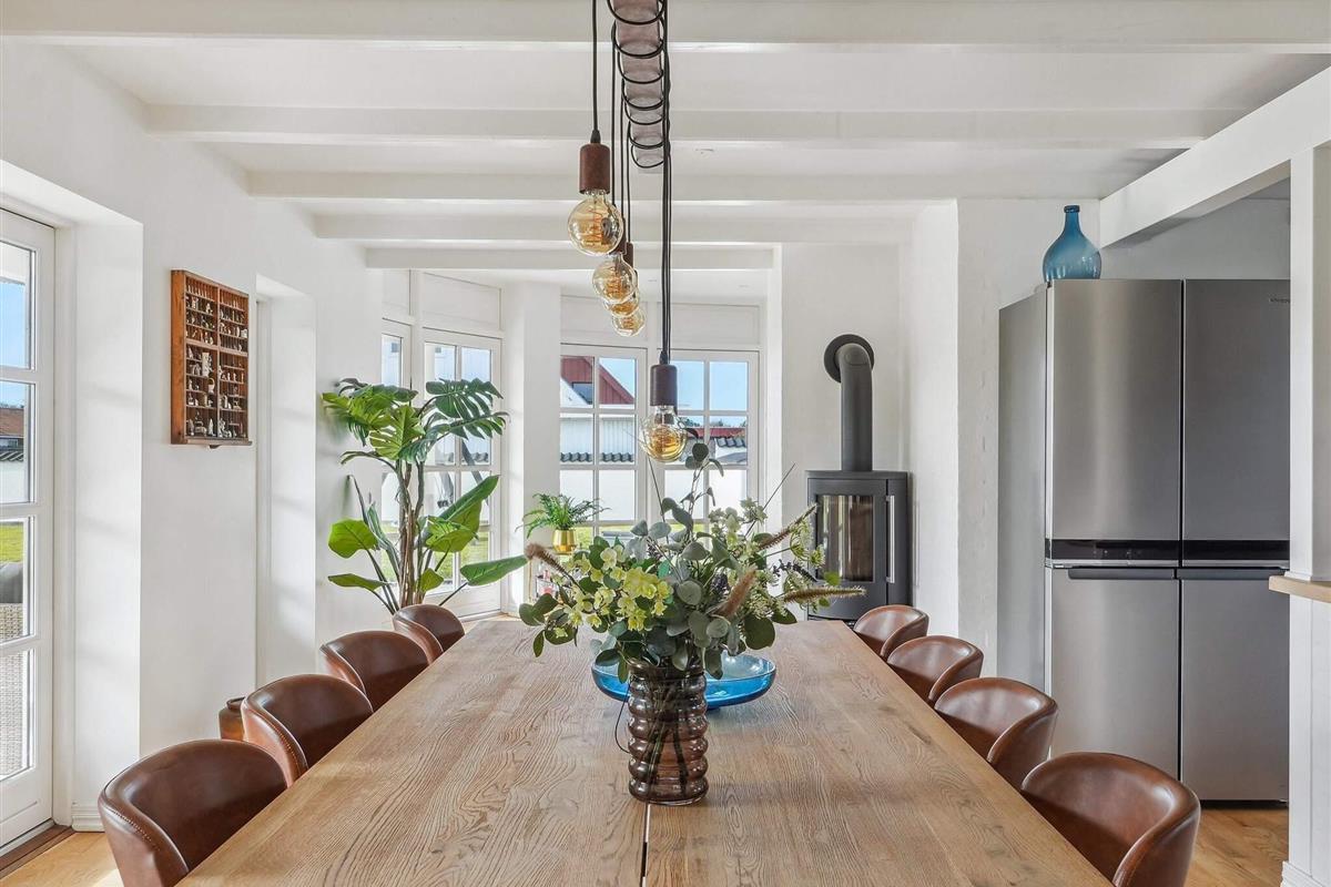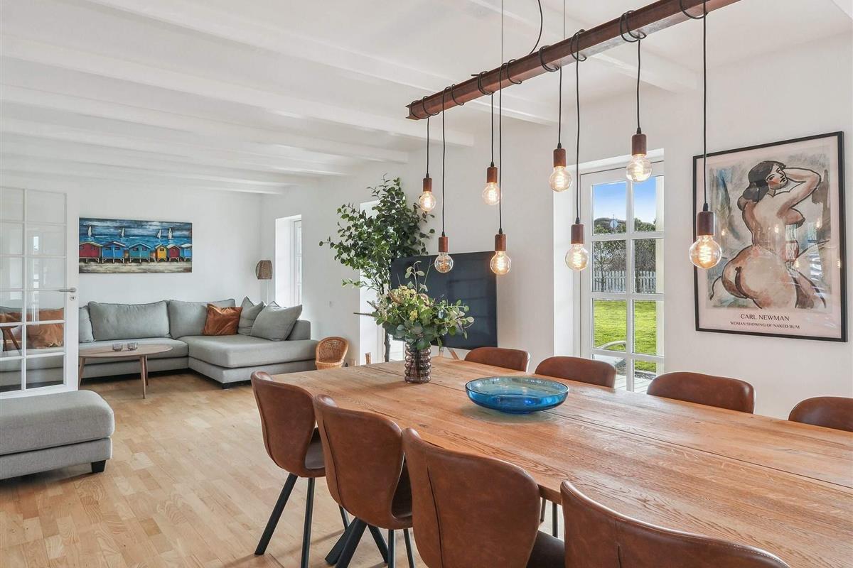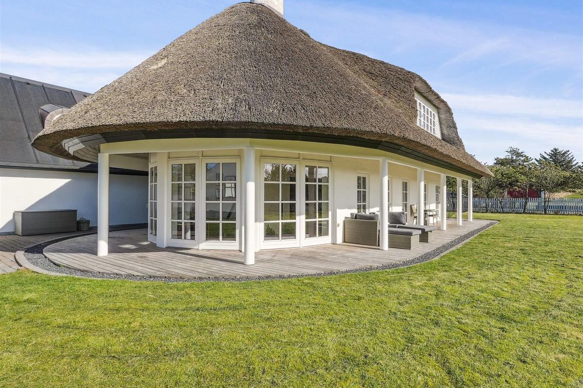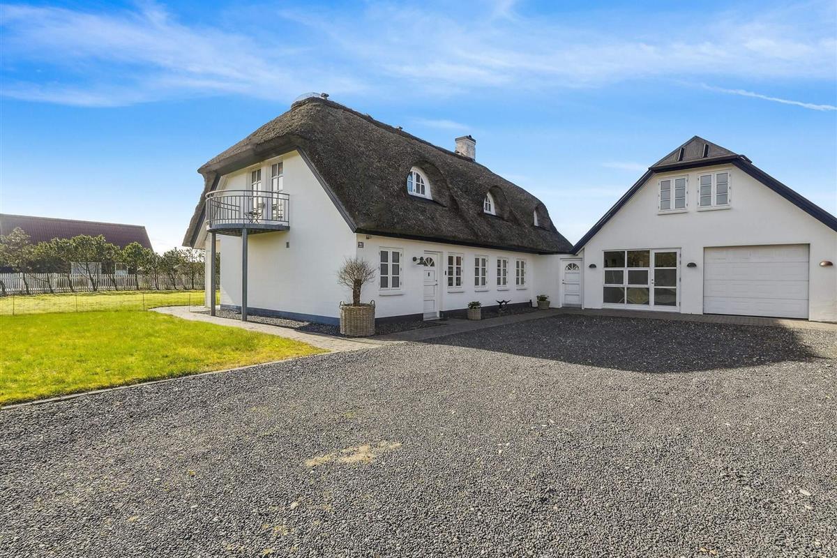 Holstvej 21 består af 2 bygninger, hvor der i alt er plads til 12 personer foruden baby(er). Den ene bygning er stuehuset, hvor du går ind i husets store og lyse entré med badeværelse til venstre og opgang til 1. sal. Fra entréen tilgår du det fantastiske køkkenalrum samt stuerne, der virkelig udgør hjertet af huset. Her er udgang til den store have og terrasseområdet, samt en skøn ekstra stue med stort vinduesparti, hvor det er oplagt at slænge sig og nyde udsigten og ferien. På stuehusets første sal finder du et ekstra badeværelse og 3 soverum med hhv. 2 dobbeltsenge og 2 enkeltsenge samt repos og walkin closet. Der er opvaskemaskine i det store køkken, det er der ikke i tilbygningens køkken.