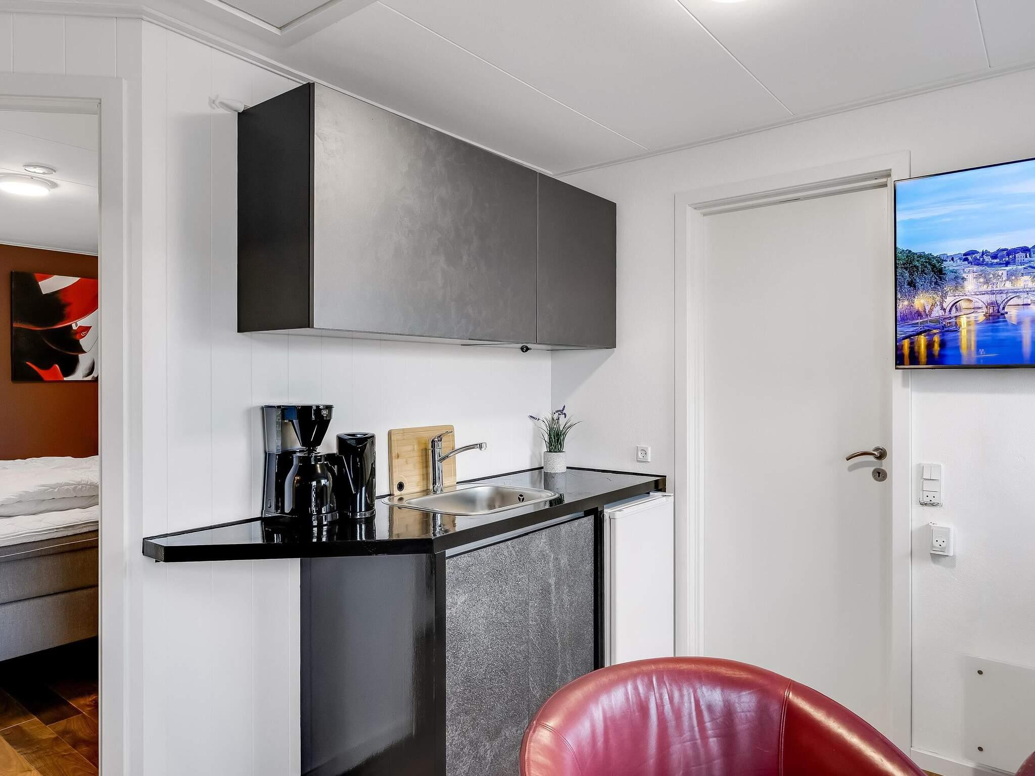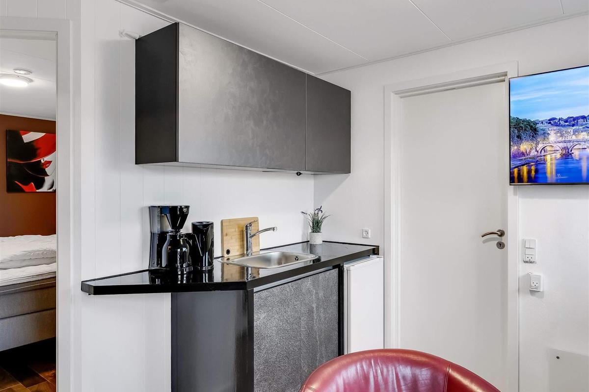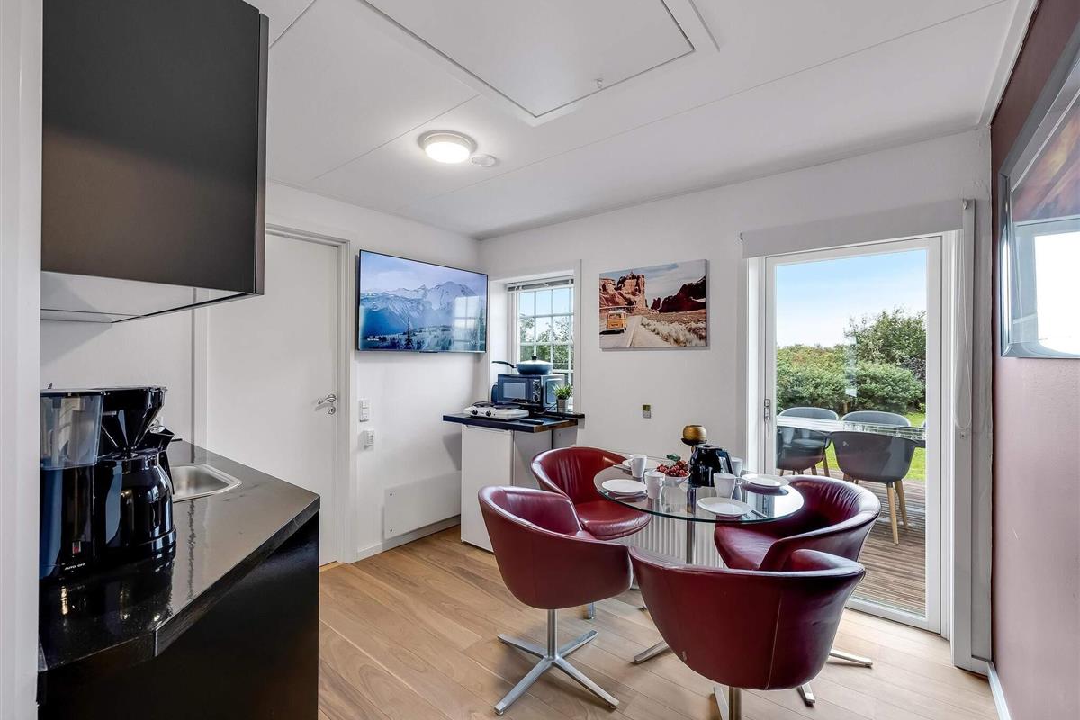 Det lille køkken rummer bord og fire stole samt kogeplader, mikroovn, ovn, to køleskabe, elkoger, kaffemaskine og TV. Der er desuden stor spiseplads i fællesrummet, hvor alle kan samles.