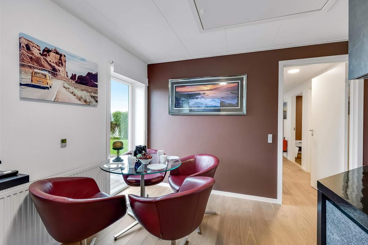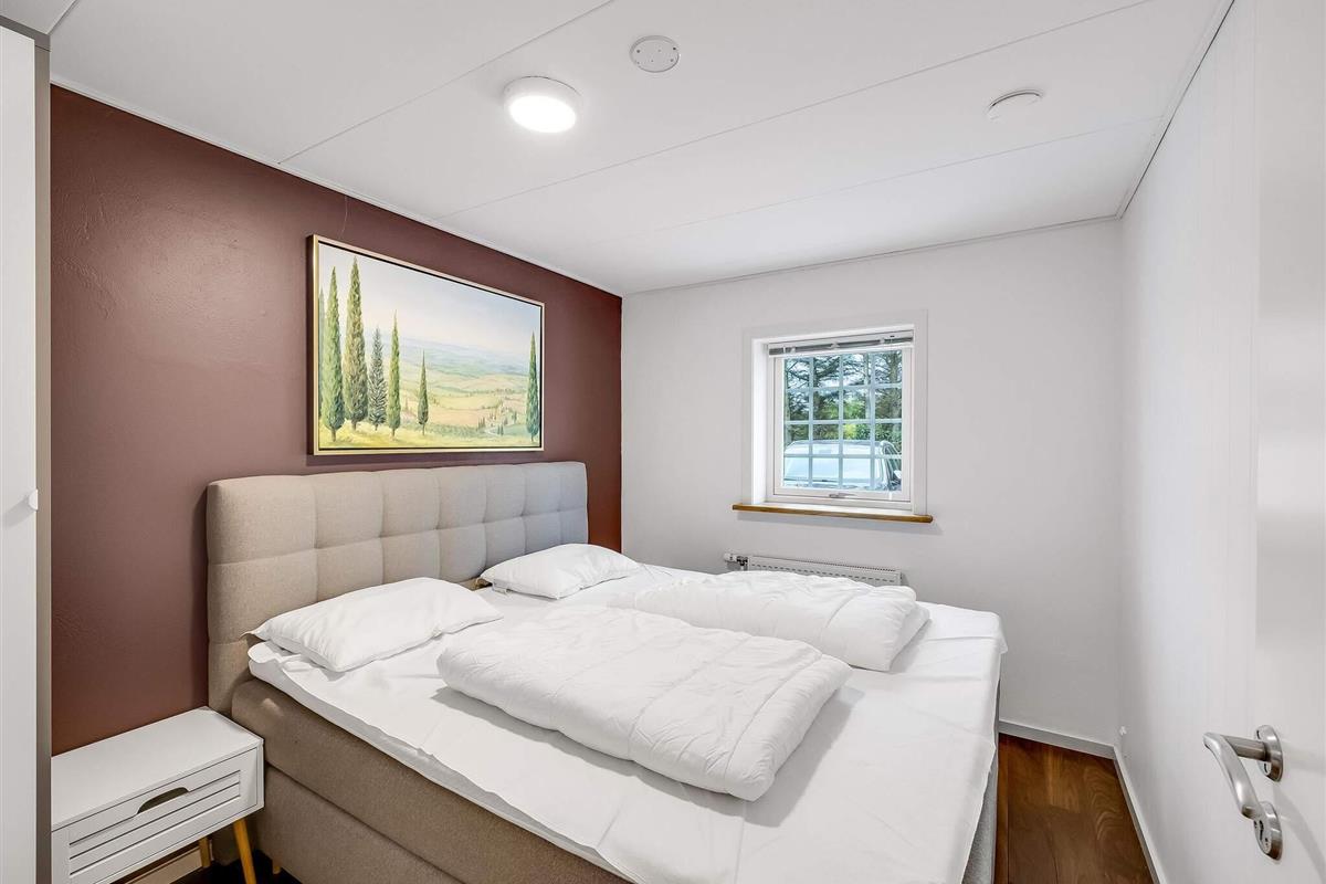Selve ferieboligen består af hovedhusets tilknyttede længe med fælles indgang og terrassedør. Værelset er indrettet med ny luksusseng fra Høie á 180 cm, og der er væghængt TV. Fællesarealerne alene udgør 120 m², så hele boligen er godt 130 m². Kommer I som større selskab, kan flere værelser lejes samtidig – med plads til op til 10 personer.