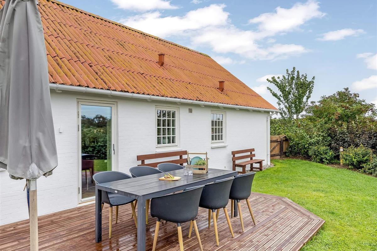 Udendørs indbyder haven til hygge. Den er indrammet af et trærækværk og oplyst af velplacerede lamper, som skaber en hyggelig stemning om aftenen.