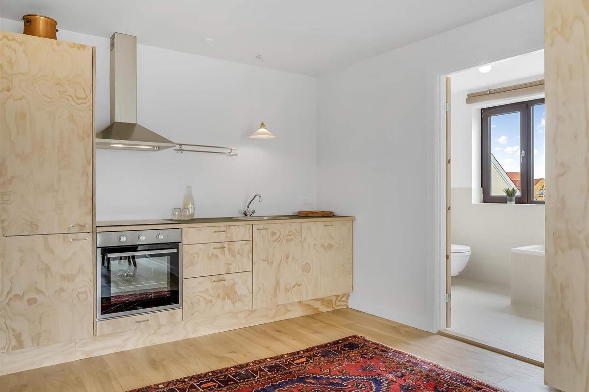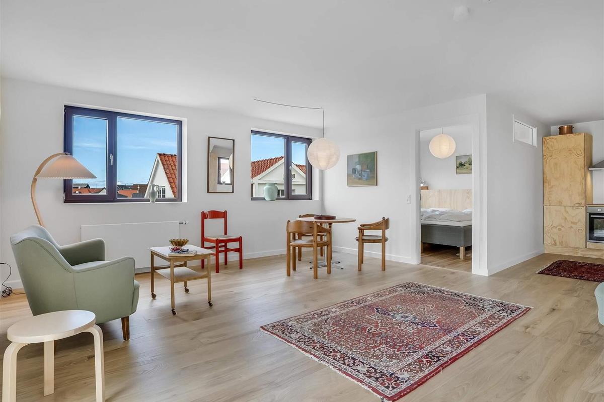 Lejligheden ligger placeret direkte i bymidten, men stadig med kort afstand til stranden – omkring 200 meter væk. Indgangen til lejligheden er via bagtrappen på bygningen ""Løkkenshus"", hvor skiltet ""By Sommerhuse"" viser vej. Der er tekøkken og et rummeligt badeværelse med både badekar og bruser – så du har det, du skal bruge, for at få en afslappende ferie i byen. På vejen mod stranden finder du både butikker, spisesteder og små caféer.