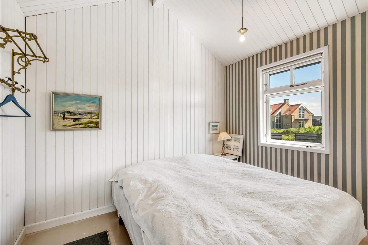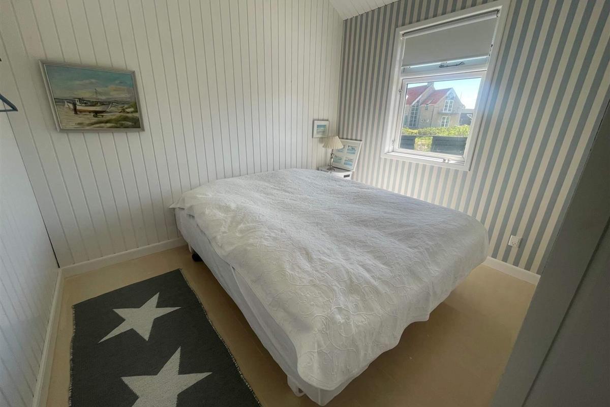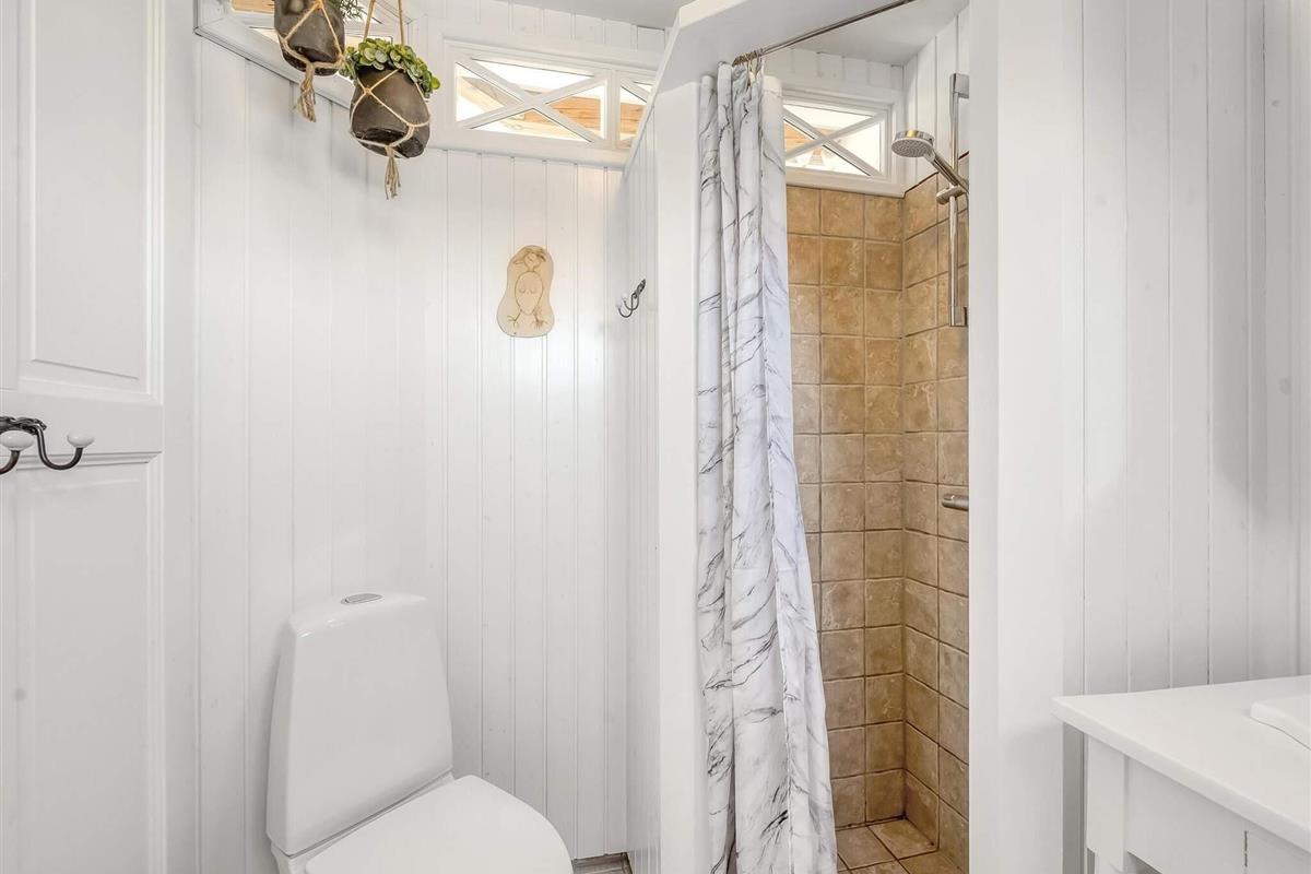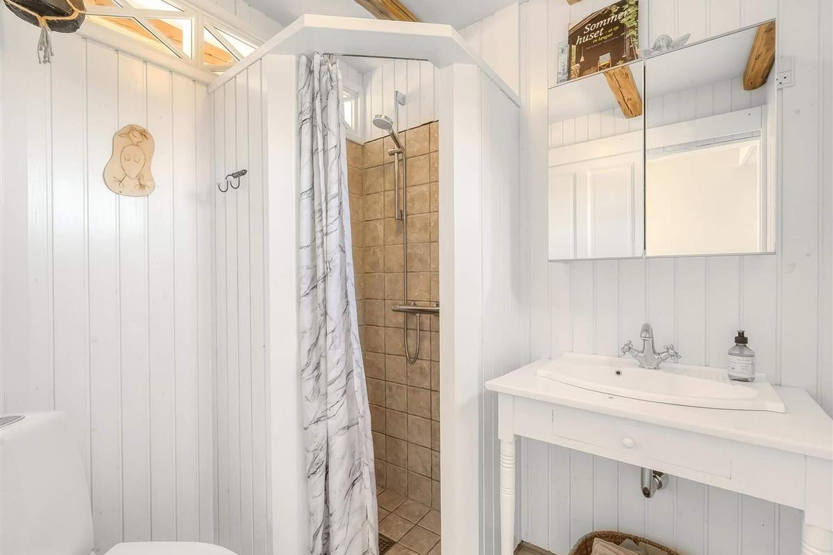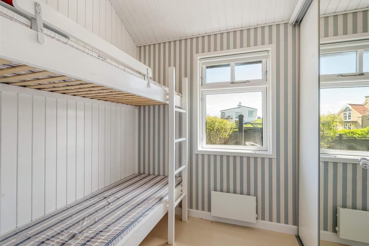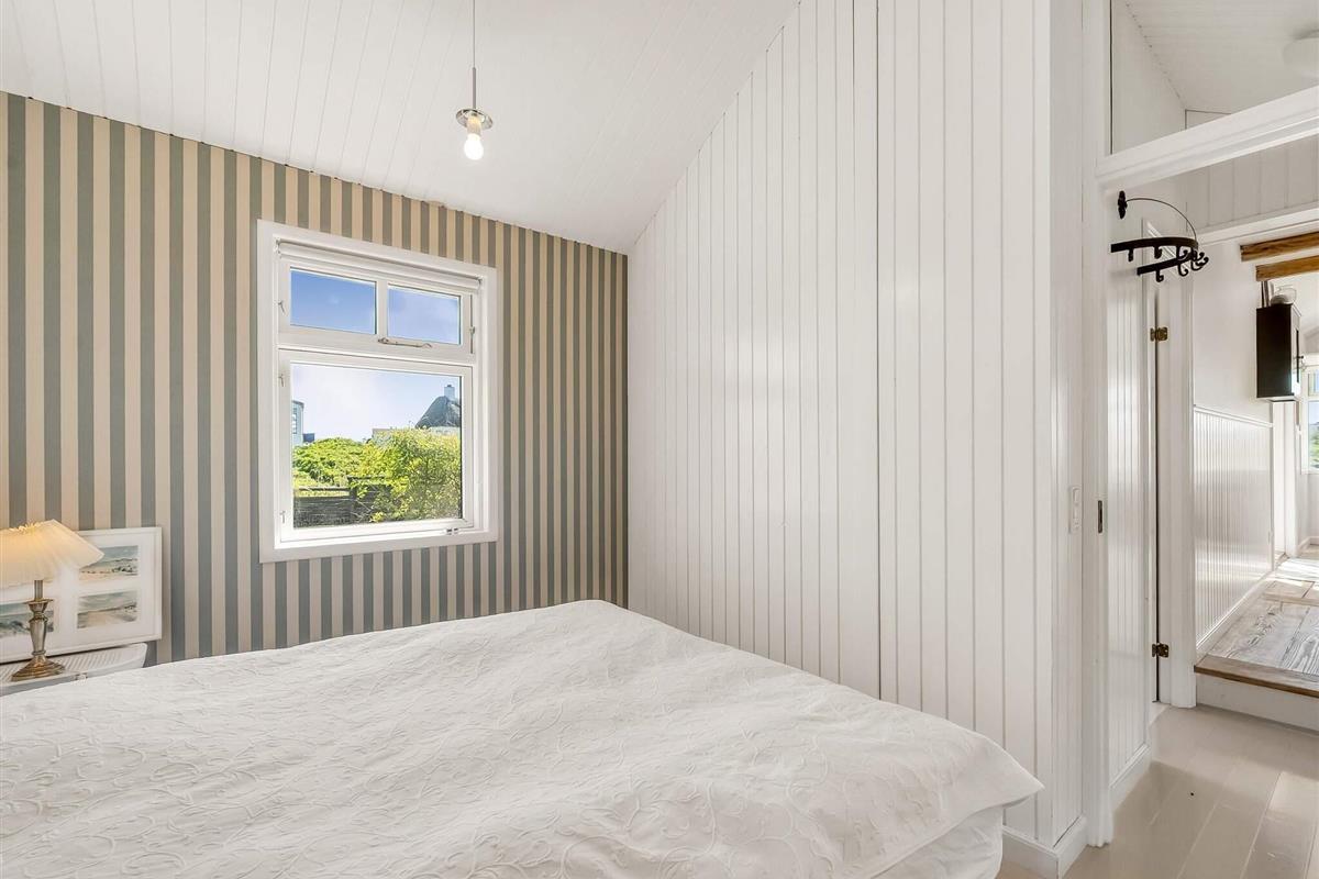 De to soveværelser og husets badeværelse ligger i forlængelse af spisestuen. Alle rum er dejlige og emmer af dansk sommerhusferie med en badehotelsstil, der er lys og indbydende.