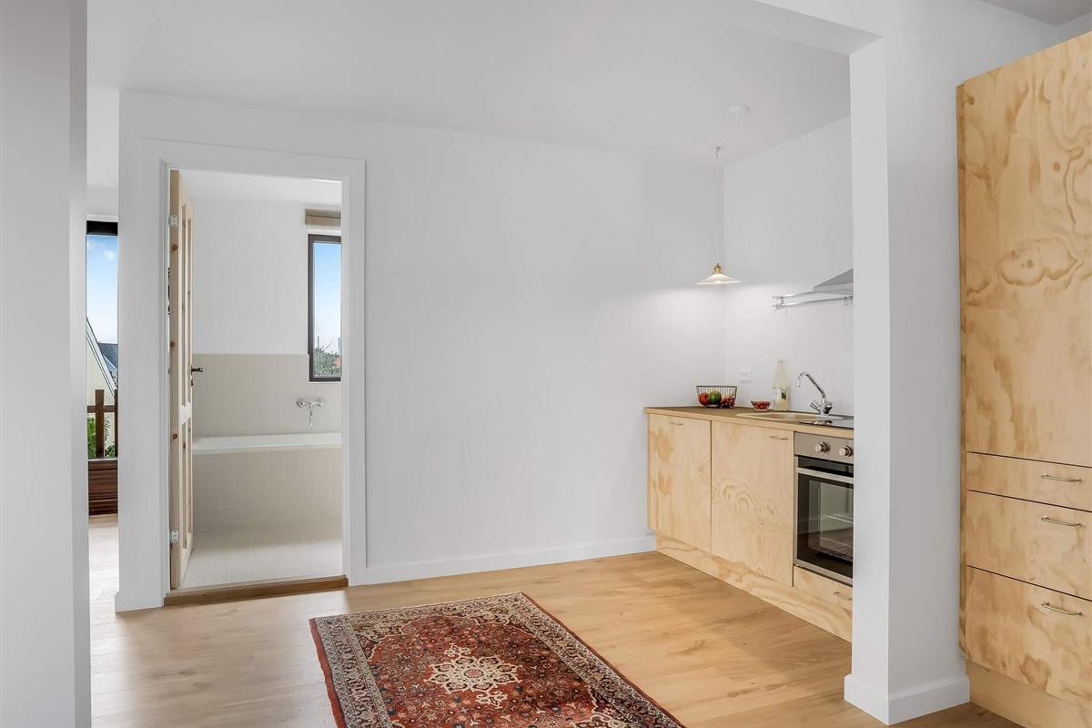 Fra lejligheden er der kun 200 meter til stranden, og du finder nemt vej via Søndre Strandvej. Adgang til lejligheden sker via bagtrappen til Løkkenshus, hvor du skal holde øje med skiltet ""By Sommerhuse"". Boligen har et lille køkkenområde og et lyst badeværelse med både badekar og bruser – perfekt til en afslappende ferie. På vejen til vandet kommer du forbi både caféer, spisesteder og små specialbutikker.