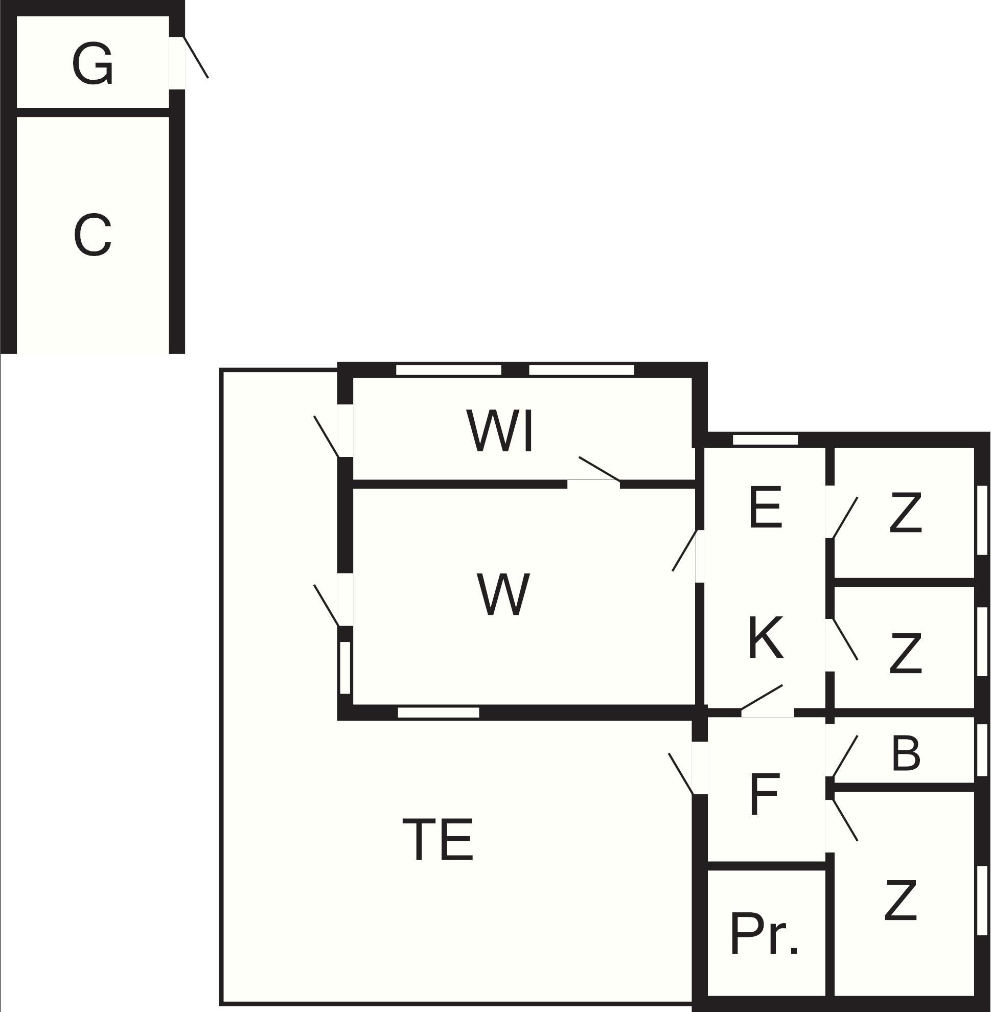 Bad: WC, Waschb., Dusche, Fußbodenheiz.