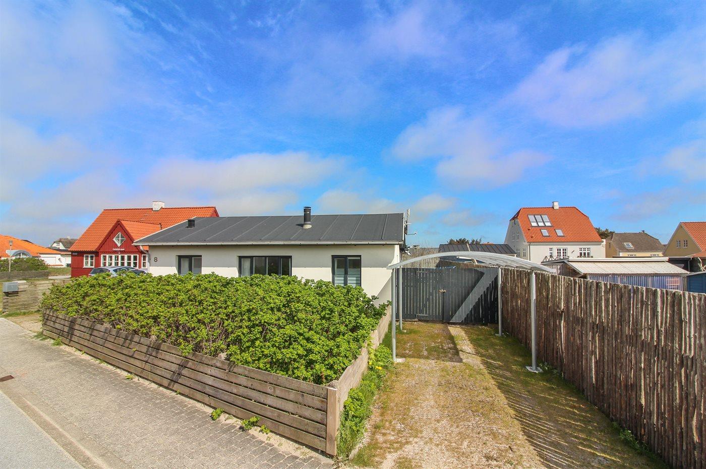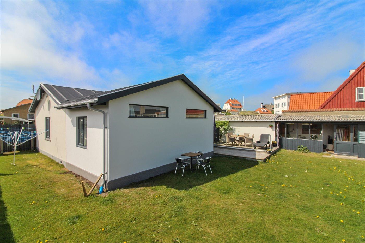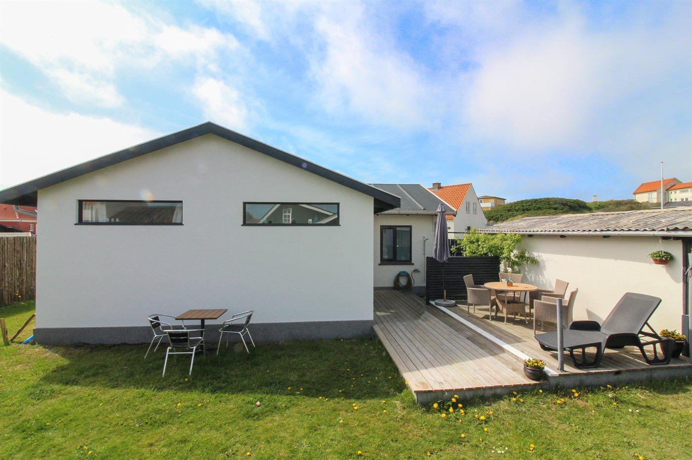 Knus vakantiehuis nabij zee in Løkken met terras, houtkachel en omheind terrein voor een ontspannen verblijf.