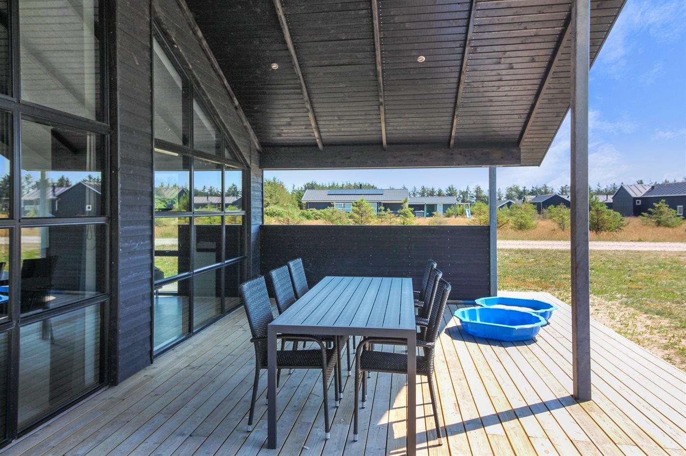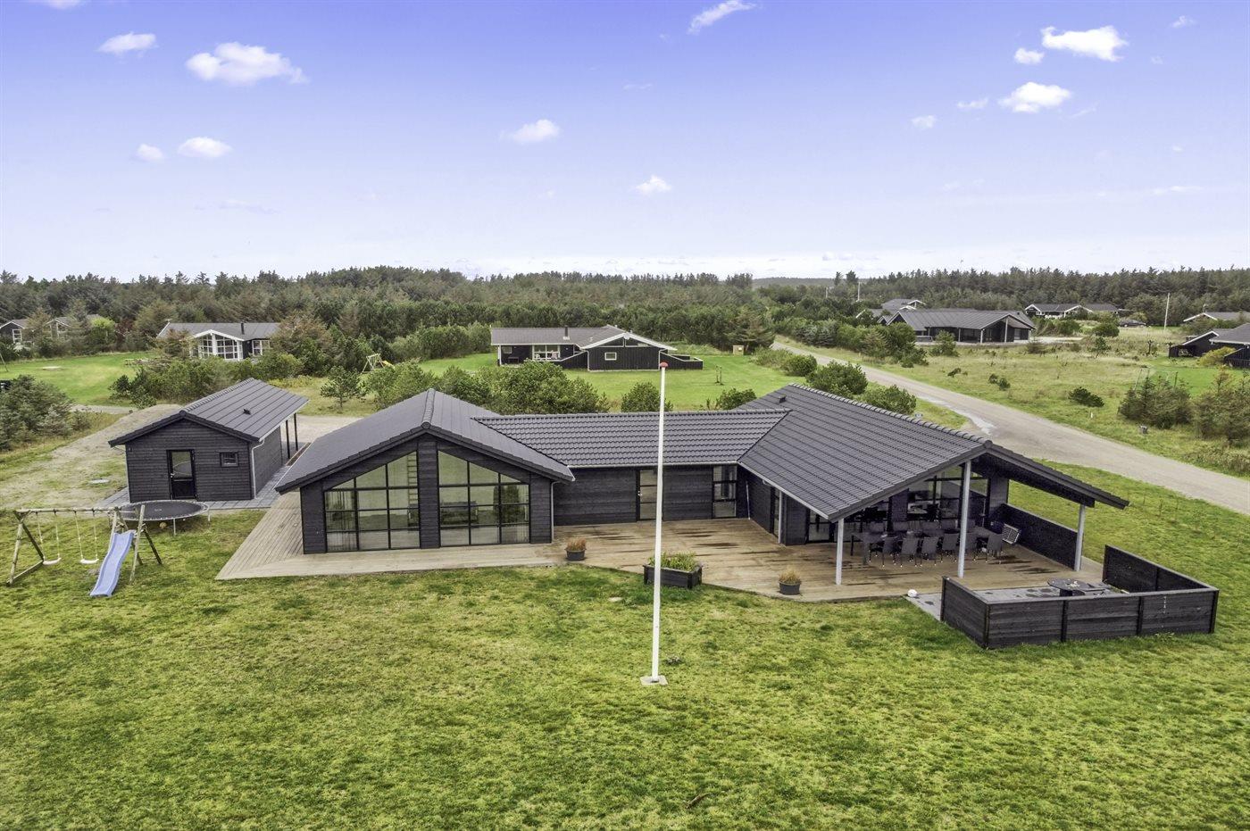 De vakantiewoning is gelegen op een 2500 m² groot natuural grond. Afstand tot de zee 900 m. Dichtstbijzijnde winkel 200 m. Bij de vakantiewoning hoort 130 m² terras. Daarnaast is er een 30 m² groot overdekt terras. Zandbak. Glijbaan. Barbecue. Carport ter beschikking. Het huis heeft een stopcontact voor het opladen van een elektrische auto. Parkeerplaats bij het huis.