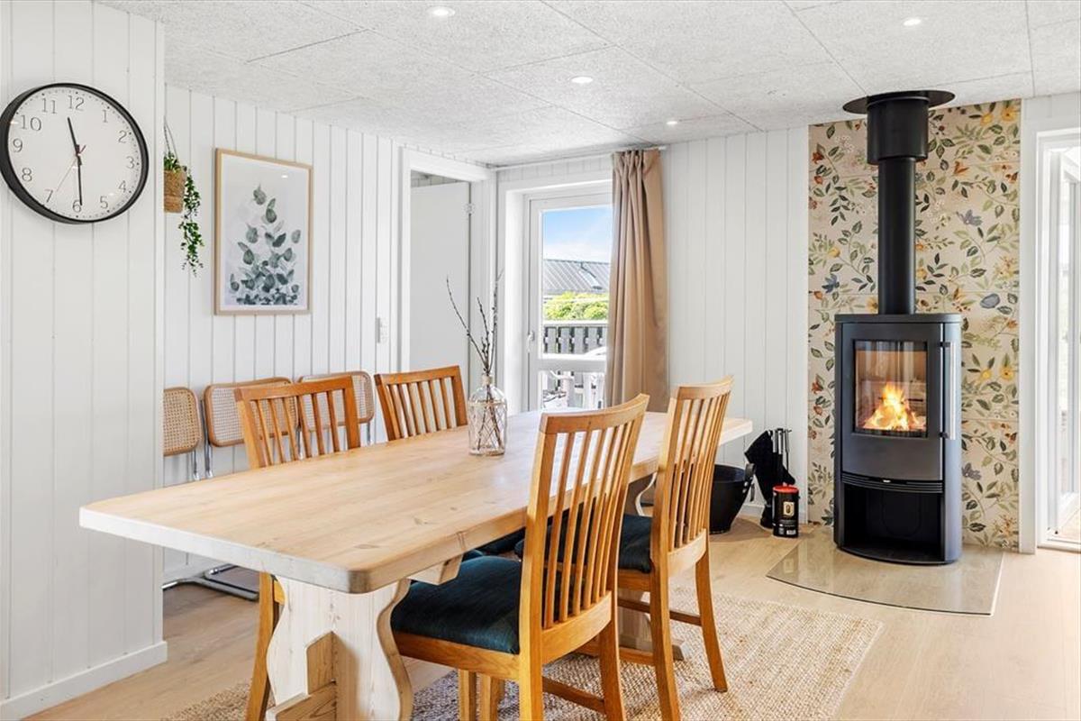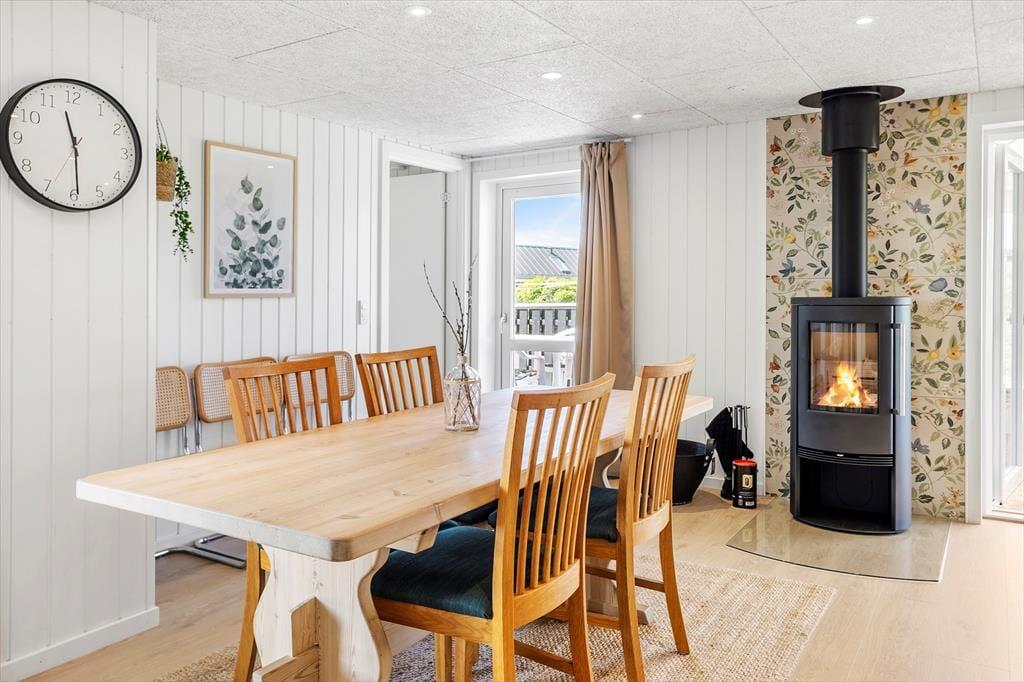 Das Ferienhaus bietet eine klassische Einrichtung mit viel Gemütlichkeit. Im Wohnzimmer, wo du dich vor dem knisternden Kaminofen entspannen kannst, gibt es ausreichend Platz, um nach einem aktiven Tag am Strand zu relaxen. Die gut ausgestattete Küche lädt zu gemeinsamen Kochabenden ein, und durch die offene Verbindung zum Wohnzimmer bleibt immer Raum für Gespräche. Das Ferienhaus verfügt über drei gute Schlafzimmer, die alle auf Komfort ausgelegt sind, sowie ein Badezimmer und ein Gäste-WC. Der Wintergarten mit Glasfenstern bietet einen fantastischen Ausblick auf die umliegende Natur, sodass du das Gefühl hast, mit der Landschaft eins zu sein – egal ob drinnen oder draußen.